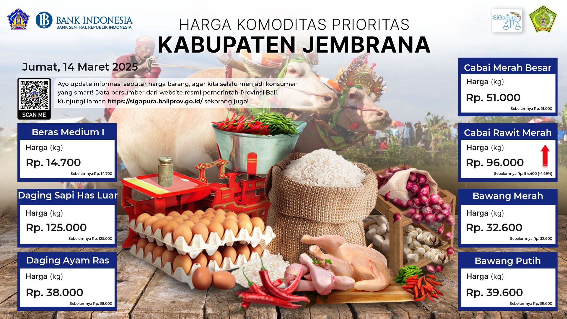Berdasarkan pemantauan Harga Pangan Rata-Rata 7 (tujuh) Komoditas Prioritas di 60 Pasar seluruh Bali pada tanggal 14 Maret 2025, diperoleh informasi Beras Medium I ada diharga Rp. 14.361, mengalami kenaikan sebesar 0.05%. Daging Sapi Has Luar tetap ada diharga Rp. 121.988. Daging Ayam Ras ada diharga Rp. 40.706, mengalami penurunan sebesar 0.14%. Cabai Merah Besar ada diharga Rp. 51.675, mengalami penurunan sebesar 6.23%. Cabai Rawit Merah ada diharga Rp. 92.103, mengalami kenaikan sebesar 1.66%. Bawang Merah ada diharga Rp. 34.107, mengalami kenaikan sebesar 0.53%. Bawang Putih ada diharga Rp. 40.458, mengalami penurunan sebesar 0.16%.