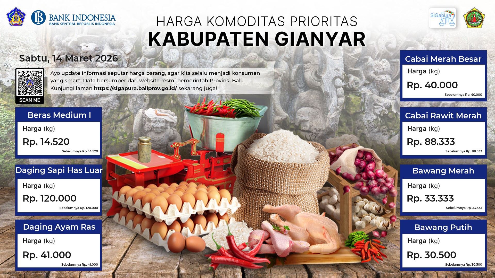 Berdasarkan pemantauan Harga Pangan Rata-Rata 7 (tujuh) Komoditas Prioritas di 60 Pasar seluruh Bali pada tanggal 14 Maret 2026, diperoleh informasi Beras Medium I tetap ada diharga Rp. 14.375. Daging Sapi Has Luar tetap ada diharga Rp. 123.906. Daging Ayam Ras tetap ada diharga Rp. 42.582. Cabai Merah Besar tetap ada diharga Rp. 38.508. Cabai Rawit Merah ada diharga Rp. 91.076, mengalami penurunan sebesar 0.02%. Bawang Merah tetap ada diharga Rp. 36.438. Bawang Putih tetap ada diharga Rp. 33.634.
