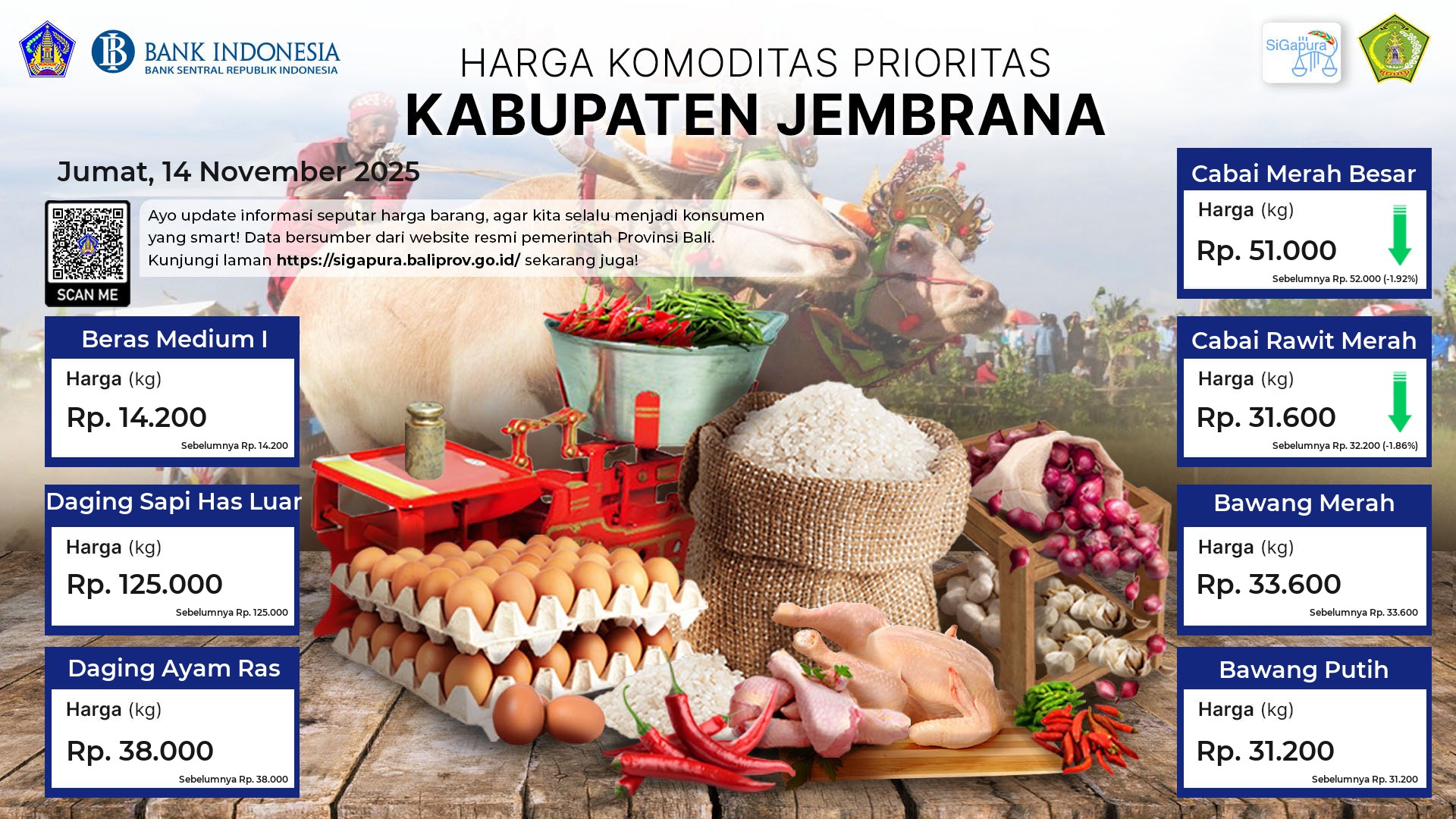 Berdasarkan pemantauan Harga Pangan Rata-Rata 7 (tujuh) Komoditas Prioritas di 60 Pasar seluruh Bali pada tanggal 14 November 2025, diperoleh informasi Beras Medium I ada diharga Rp. 14.554, mengalami penurunan sebesar 0.07%. Daging Sapi Has Luar tetap ada diharga Rp. 121.680. Daging Ayam Ras ada diharga Rp. 41.013, mengalami kenaikan sebesar 0.22%. Cabai Merah Besar ada diharga Rp. 51.409, mengalami penurunan sebesar 0.84%. Cabai Rawit Merah ada diharga Rp. 30.471, mengalami kenaikan sebesar 1.82%. Bawang Merah ada diharga Rp. 35.975, mengalami penurunan sebesar 0.79%. Bawang Putih ada diharga Rp. 32.414, mengalami kenaikan sebesar 0.37%.