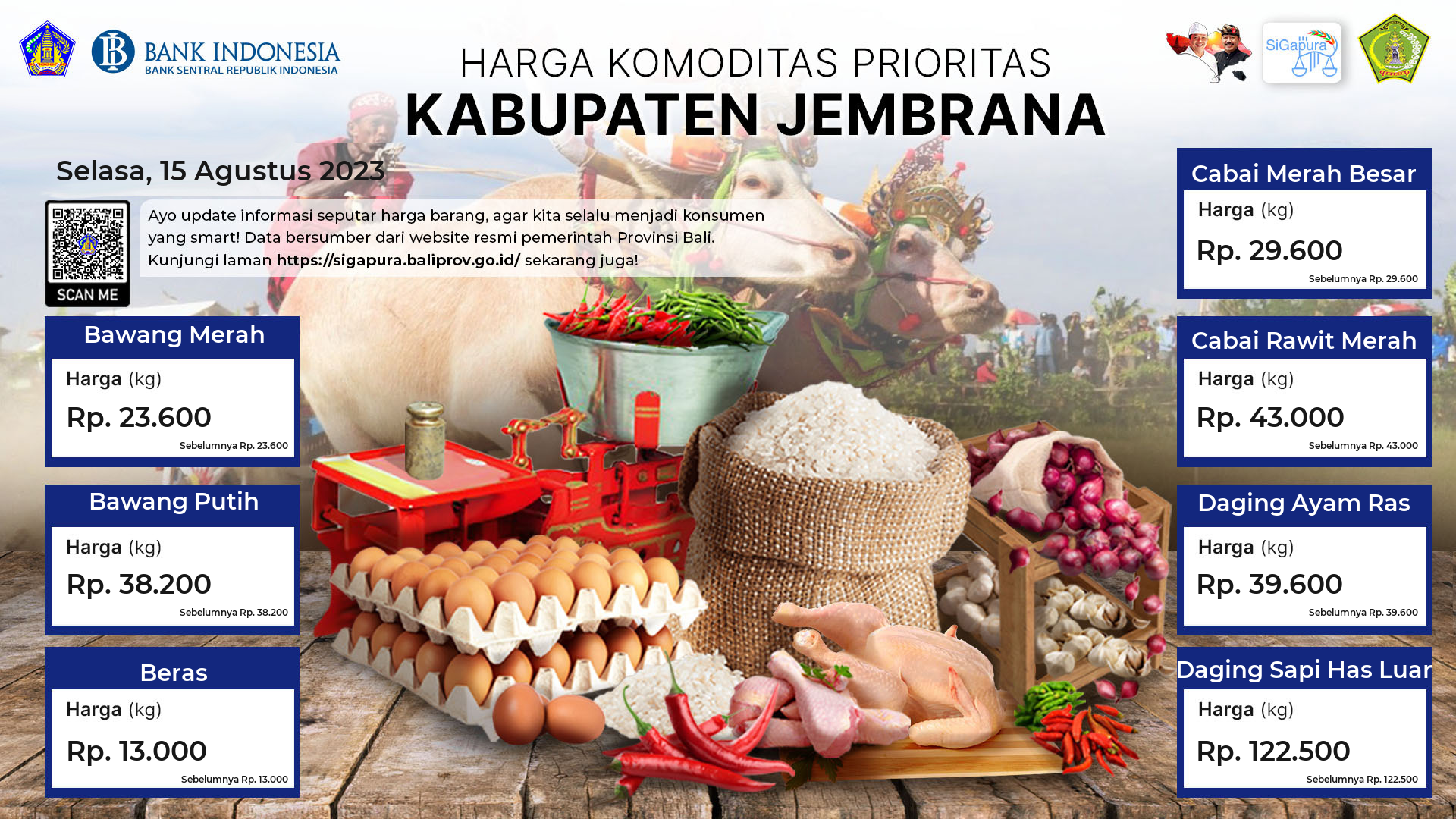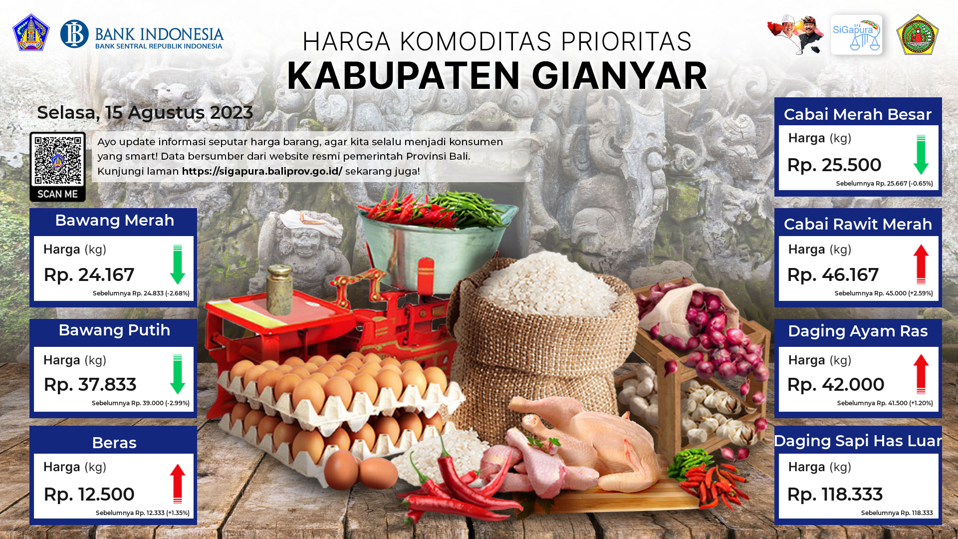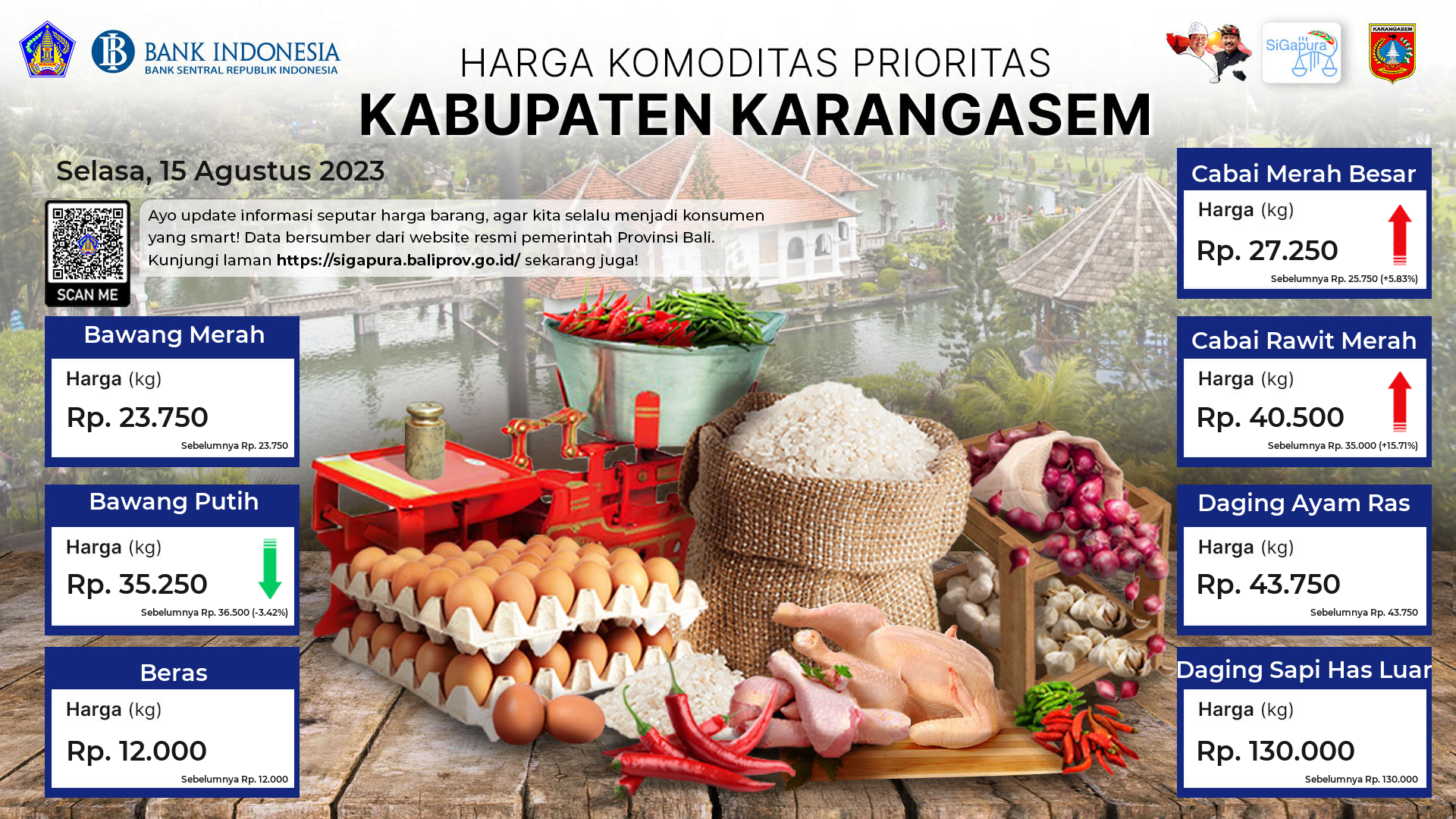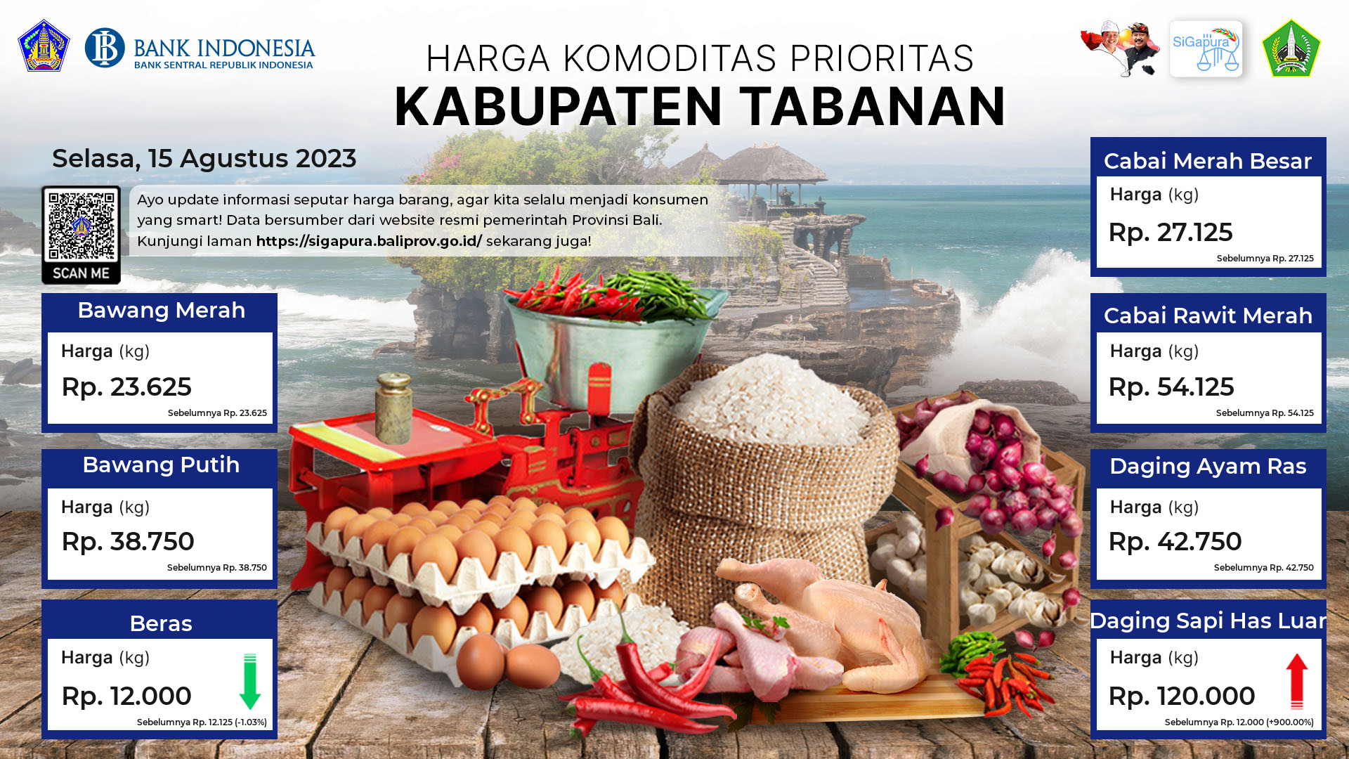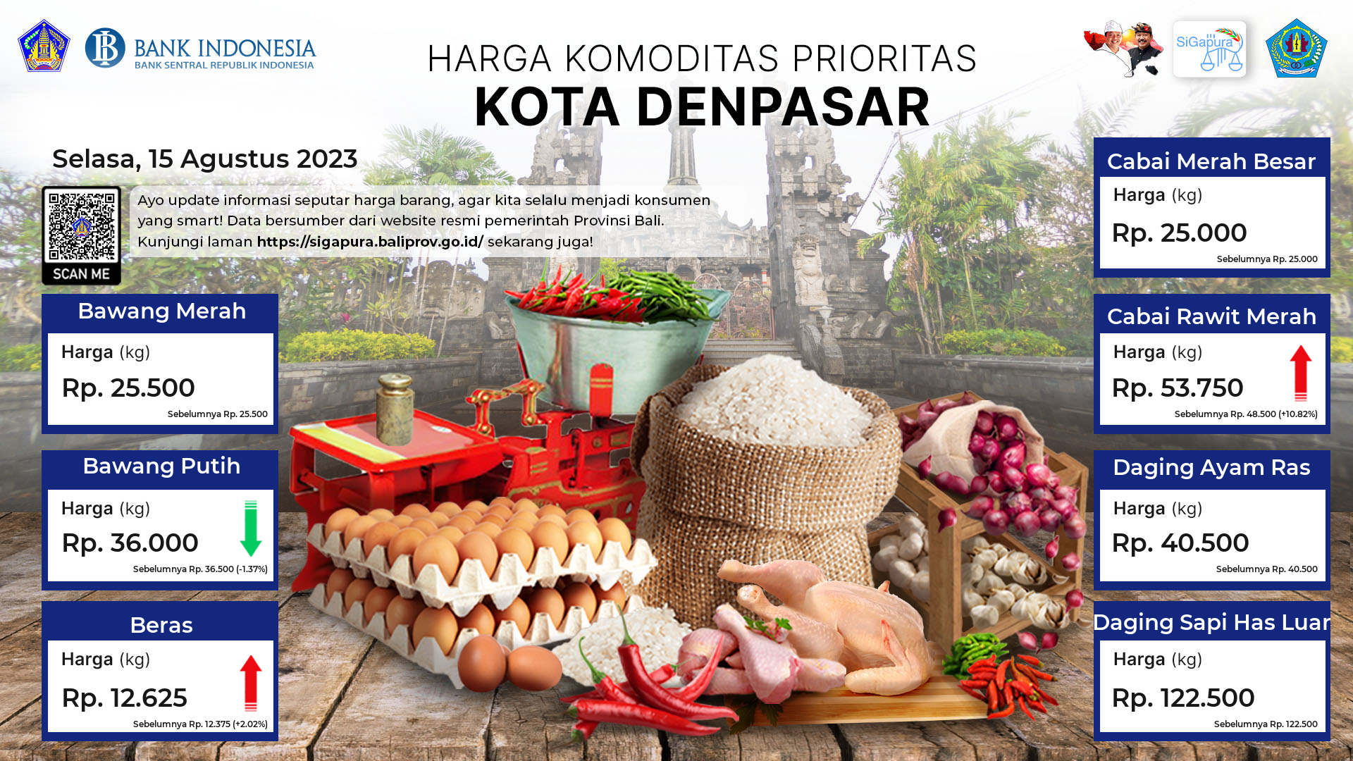 Berdasarkan pemantauan Harga Pangan Rata-Rata 7 (tujuh) Komoditas Prioritas di 60 Pasar seluruh Bali pada tanggal 15 Agustus 2023, diperoleh informasi Bawang Merah ada diharga Rp. 24.073, mengalami penurunan sebesar 0.13%. Bawang Putih ada diharga Rp. 37.615, mengalami penurunan sebesar 1.15%. Beras ada diharga Rp. 12.202, mengalami kenaikan sebesar 0.32%. Cabai Merah Besar ada diharga Rp. 25.962, mengalami kenaikan sebesar 0.75%. Cabai Rawit Merah ada diharga Rp. 47.885, mengalami kenaikan sebesar 4.75%. Daging Ayam Ras ada diharga Rp. 41.308, mengalami penurunan sebesar 0.79%. Daging Sapi Has Luar ada diharga Rp. 120.626, mengalami kenaikan sebesar 4.05%.