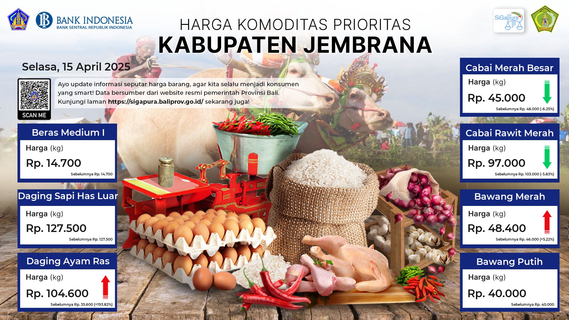 Berdasarkan pemantauan Harga Pangan Rata-Rata 7 (tujuh) Komoditas Prioritas di 60 Pasar seluruh Bali pada tanggal 15 April 2025, diperoleh informasi Beras Medium I ada diharga Rp. 14.365, mengalami penurunan sebesar 0.05%. Daging Sapi Has Luar tetap ada diharga Rp. 123.388. Daging Ayam Ras ada diharga Rp. 45.456, mengalami kenaikan sebesar 15.29%. Cabai Merah Besar ada diharga Rp. 43.611, mengalami penurunan sebesar 1.40%. Cabai Rawit Merah ada diharga Rp. 89.372, mengalami penurunan sebesar 0.66%. Bawang Merah ada diharga Rp. 48.675, mengalami kenaikan sebesar 3.74%. Bawang Putih ada diharga Rp. 41.823, mengalami penurunan sebesar 0.08%.