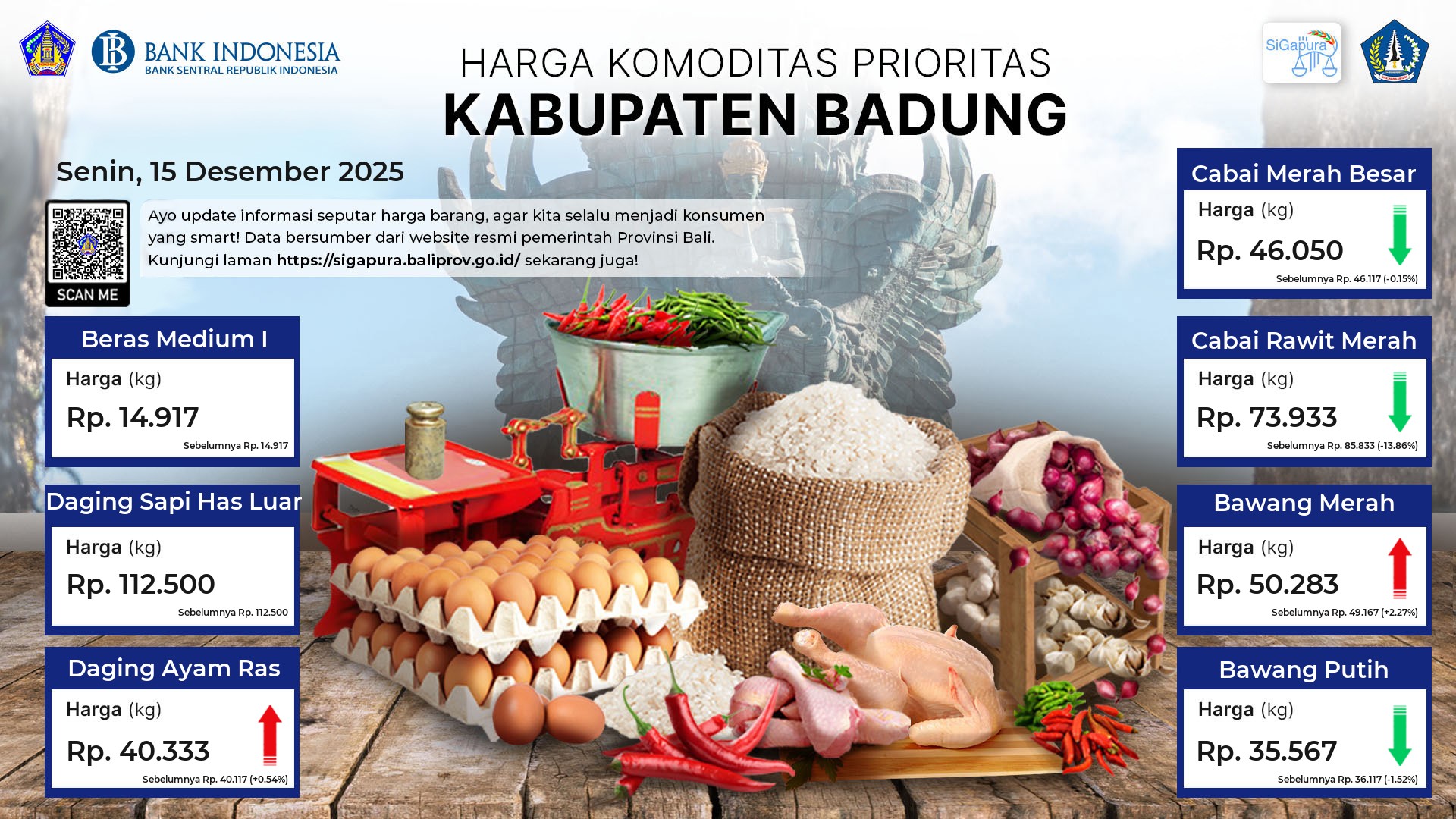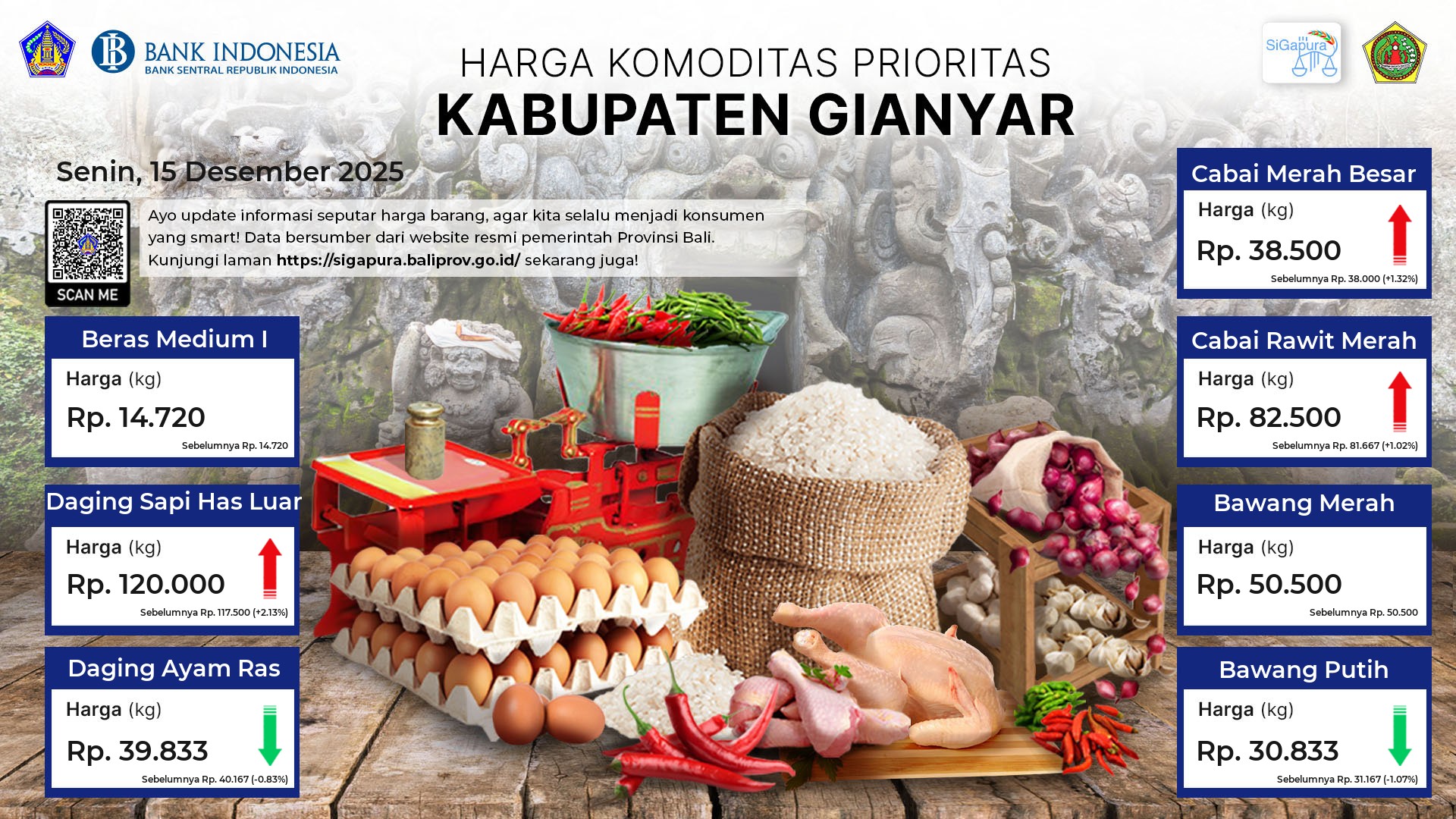 Berdasarkan pemantauan Harga Pangan Rata-Rata 7 (tujuh) Komoditas Prioritas di 60 Pasar seluruh Bali pada tanggal 15 Desember 2025, diperoleh informasi Beras Medium I ada diharga Rp. 14.507, mengalami penurunan sebesar 0.07%. Daging Sapi Has Luar ada diharga Rp. 116.159, mengalami penurunan sebesar 5.54%. Daging Ayam Ras ada diharga Rp. 40.941, mengalami penurunan sebesar 0.59%. Cabai Merah Besar ada diharga Rp. 42.171, mengalami penurunan sebesar 2.06%. Cabai Rawit Merah ada diharga Rp. 73.847, mengalami penurunan sebesar 1.70%. Bawang Merah ada diharga Rp. 50.028, mengalami penurunan sebesar 0.06%. Bawang Putih ada diharga Rp. 32.595, mengalami penurunan sebesar 1.74%.