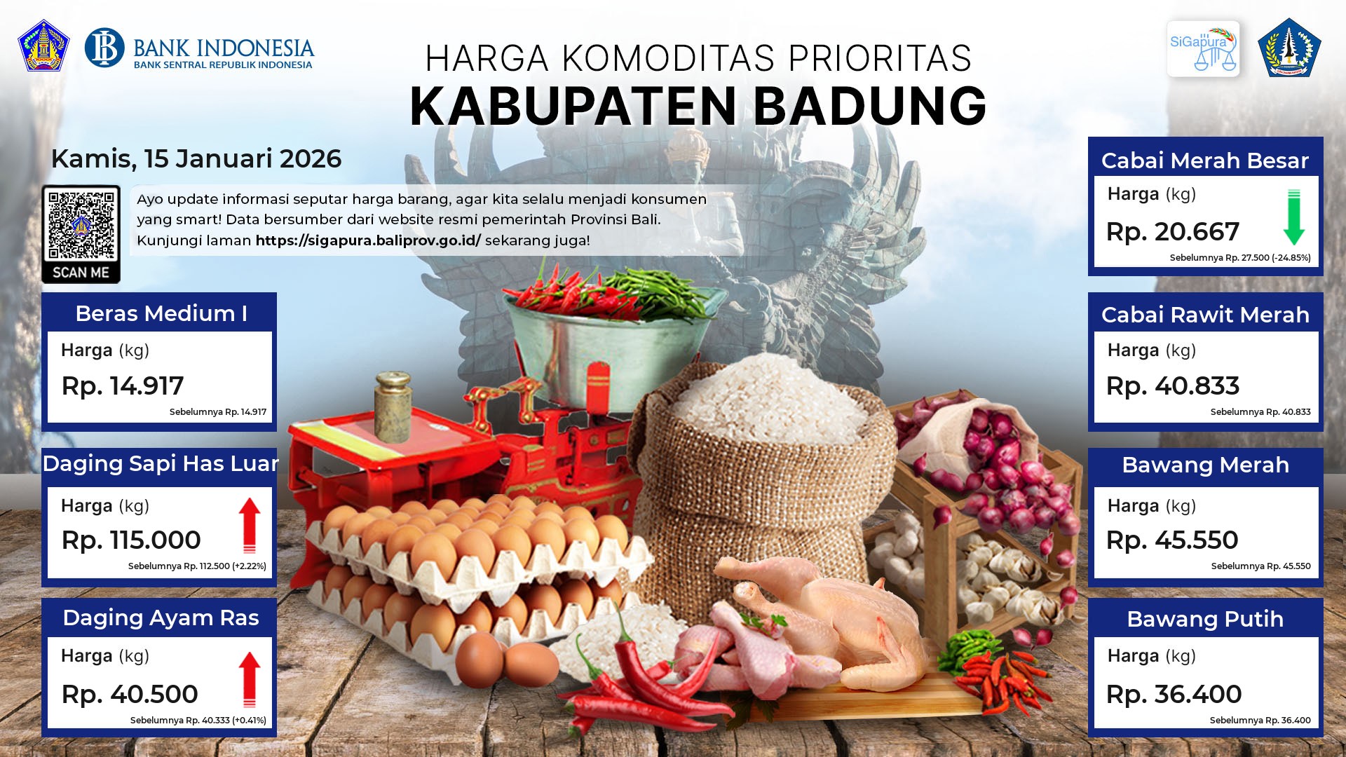 Berdasarkan pemantauan Harga Pangan Rata-Rata 7 (tujuh) Komoditas Prioritas di 60 Pasar seluruh Bali pada tanggal 15 Januari 2026, diperoleh informasi Beras Medium I ada diharga Rp. 14.535, mengalami penurunan sebesar 0.13%. Daging Sapi Has Luar ada diharga Rp. 120.612, mengalami penurunan sebesar 0.02%. Daging Ayam Ras ada diharga Rp. 40.995, mengalami kenaikan sebesar 0.04%. Cabai Merah Besar ada diharga Rp. 24.883, mengalami penurunan sebesar 3.61%. Cabai Rawit Merah ada diharga Rp. 38.449, mengalami penurunan sebesar 0.65%. Bawang Merah ada diharga Rp. 36.544, mengalami penurunan sebesar 0.81%. Bawang Putih ada diharga Rp. 35.374, mengalami kenaikan sebesar 1.49%.