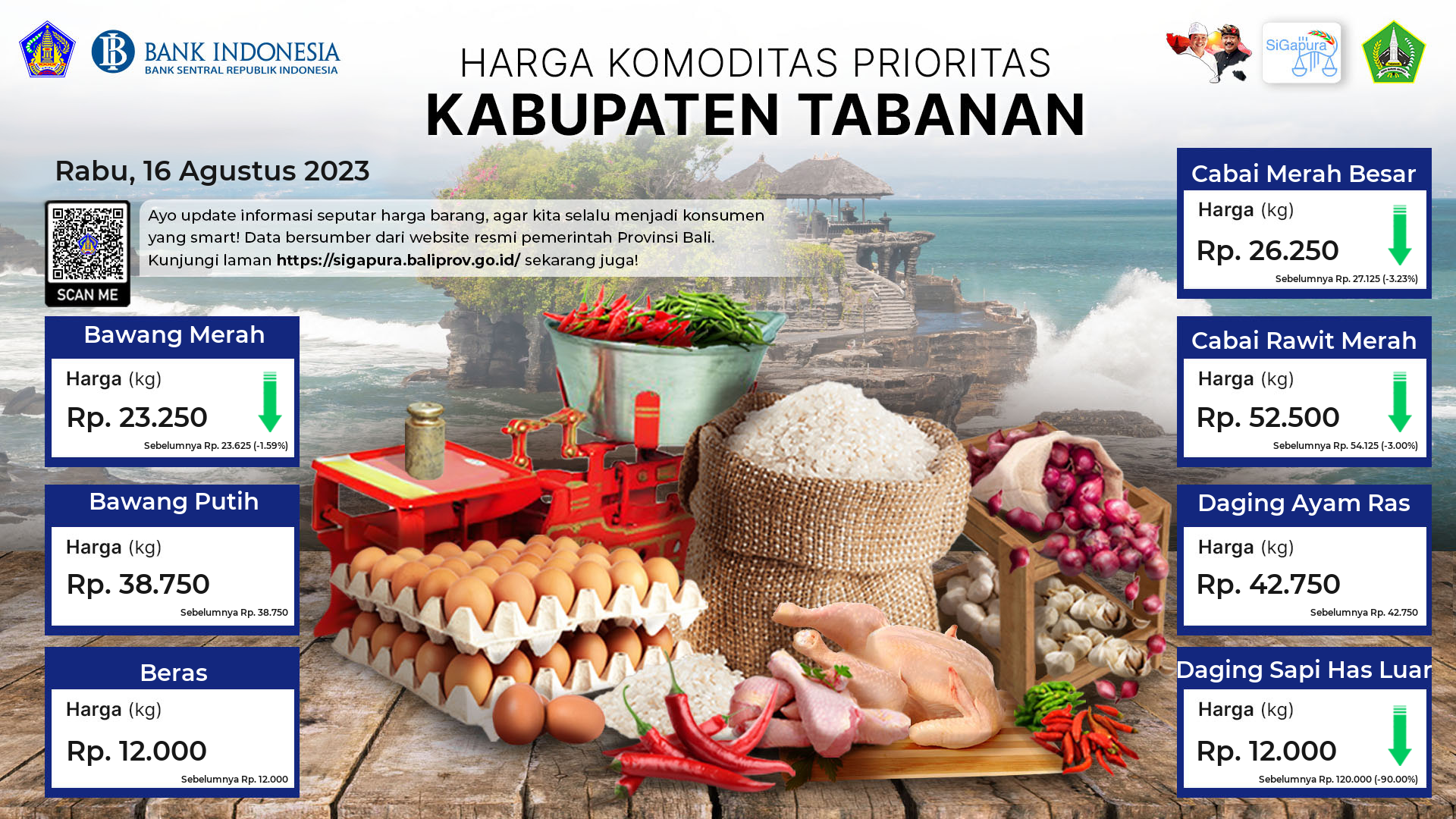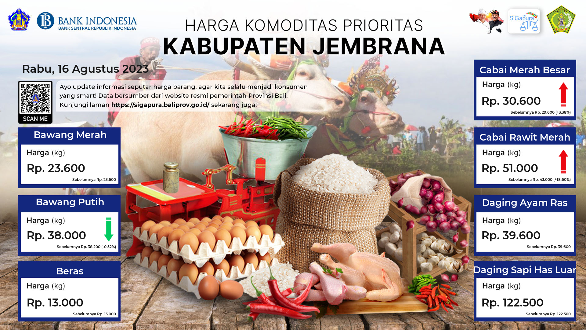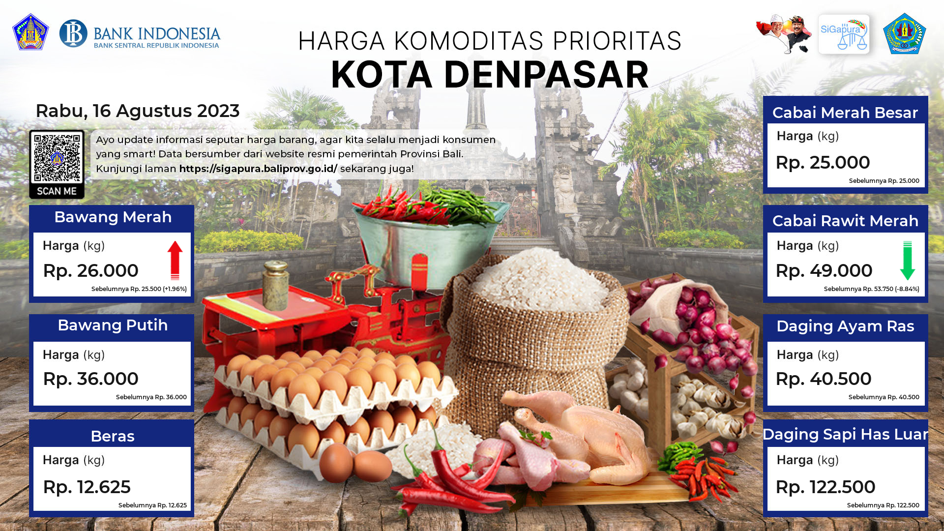 Berdasarkan pemantauan Harga Pangan Rata-Rata 7 (tujuh) Komoditas Prioritas di 60 Pasar seluruh Bali pada tanggal 16 Agustus 2023, diperoleh informasi Bawang Merah ada diharga Rp. 23.785, mengalami penurunan sebesar 1.20%. Bawang Putih ada diharga Rp. 37.673, mengalami kenaikan sebesar 0.15%. Beras ada diharga Rp. 12.212, mengalami kenaikan sebesar 0.08%. Cabai Merah Besar ada diharga Rp. 25.827, mengalami penurunan sebesar 0.52%. Cabai Rawit Merah ada diharga Rp. 48.288, mengalami kenaikan sebesar 0.84%. Daging Ayam Ras ada diharga Rp. 41.481, mengalami kenaikan sebesar 0.42%. Daging Sapi Has Luar ada diharga Rp. 115.930, mengalami penurunan sebesar 3.89%.