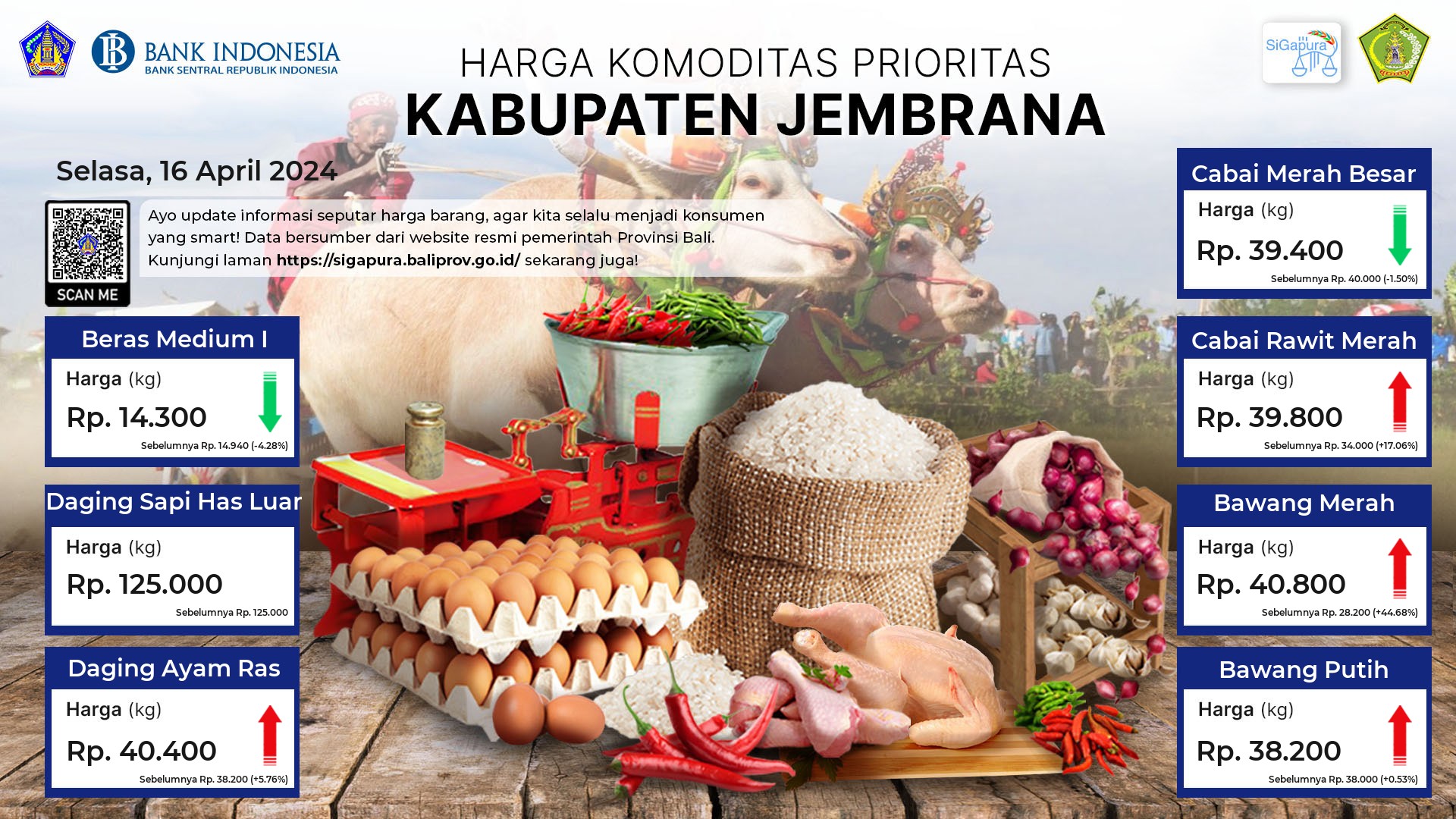 Berdasarkan pemantauan Harga Pangan Rata-Rata 7 (tujuh) Komoditas Prioritas di 60 Pasar seluruh Bali pada tanggal 16 April 2024, diperoleh informasi Beras Medium I ada diharga Rp. 14.571, mengalami penurunan sebesar 1.92%. Daging Sapi Has Luar ada diharga Rp. 118.549, mengalami kenaikan sebesar 0.36%. Daging Ayam Ras ada diharga Rp. 41.437, mengalami kenaikan sebesar 3.76%. Cabai Merah Besar ada diharga Rp. 41.458, mengalami penurunan sebesar 6.75%. Cabai Rawit Merah ada diharga Rp. 38.125, mengalami kenaikan sebesar 2.20%. Bawang Merah ada diharga Rp. 38.964, mengalami kenaikan sebesar 22.92%. Bawang Putih ada diharga Rp. 38.364, mengalami kenaikan sebesar 1.98%.