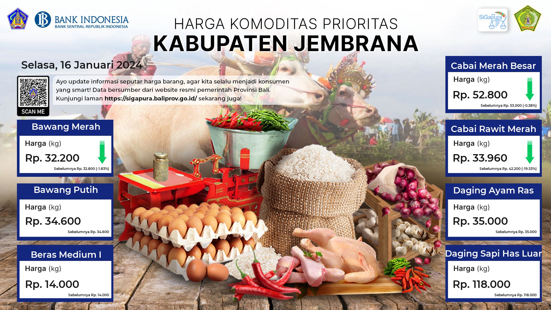 Berdasarkan pemantauan Harga Pangan Rata-Rata 7 (tujuh) Komoditas Prioritas di 60 Pasar seluruh Bali pada tanggal 16 Januari 2024, diperoleh informasi Bawang Merah ada diharga Rp. 34.653, mengalami penurunan sebesar 0.95%. Bawang Putih ada diharga Rp. 35.288, mengalami kenaikan sebesar 0.23%. Beras Medium I ada diharga Rp. 13.912, mengalami kenaikan sebesar 0.17%. Cabai Merah Besar ada diharga Rp. 54.347, mengalami kenaikan sebesar 2.83%. Cabai Rawit Merah ada diharga Rp. 48.609, mengalami penurunan sebesar 3.18%. Daging Ayam Ras ada diharga Rp. 38.441, mengalami penurunan sebesar 0.30%. Daging Sapi Has Luar tetap ada diharga Rp. 115.531.