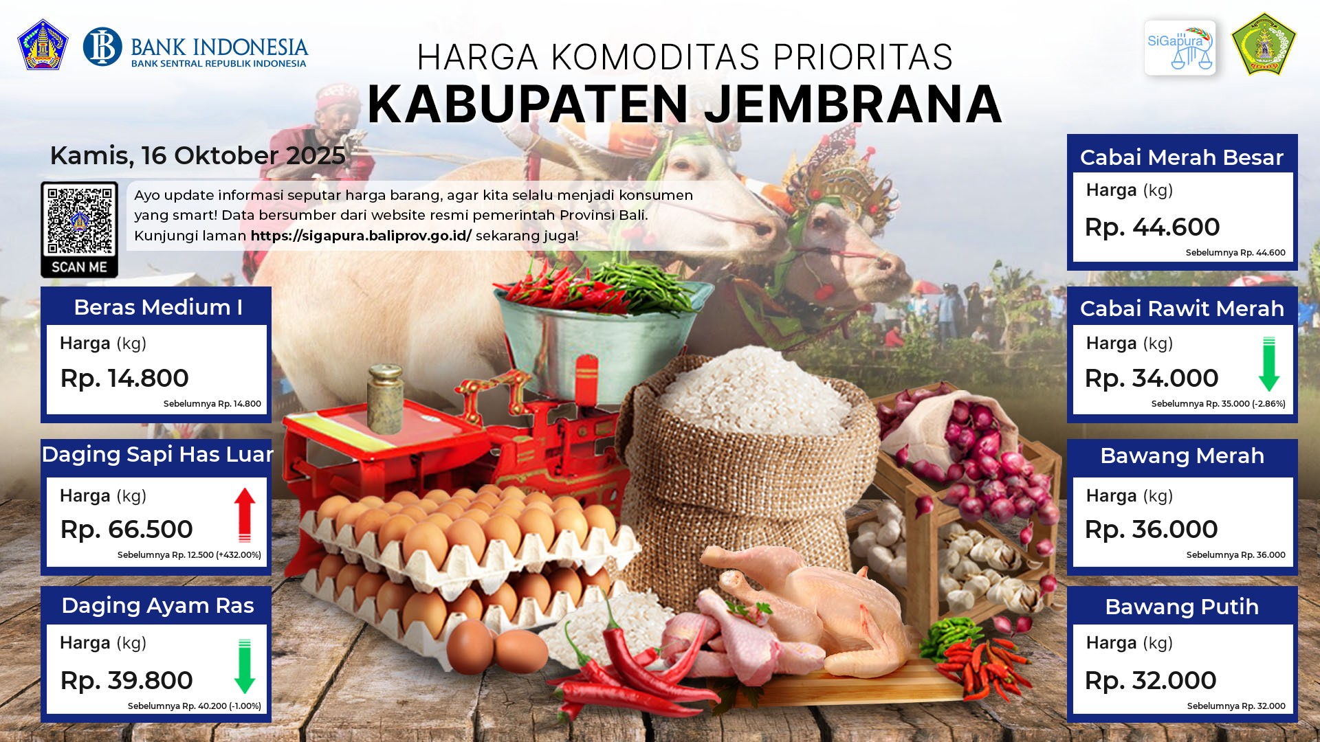 Berdasarkan pemantauan Harga Pangan Rata-Rata 7 (tujuh) Komoditas Prioritas di 60 Pasar seluruh Bali pada tanggal 16 Oktober 2025, diperoleh informasi Beras Medium I ada diharga Rp. 14.764, mengalami kenaikan sebesar 0.15%. Daging Sapi Has Luar ada diharga Rp. 116.532, mengalami kenaikan sebesar 3.67%. Daging Ayam Ras ada diharga Rp. 42.604, mengalami penurunan sebesar 0.48%. Cabai Merah Besar ada diharga Rp. 46.225, mengalami kenaikan sebesar 2.11%. Cabai Rawit Merah ada diharga Rp. 33.670, mengalami kenaikan sebesar 0.19%. Bawang Merah ada diharga Rp. 33.242, mengalami kenaikan sebesar 0.38%. Bawang Putih ada diharga Rp. 32.132, mengalami kenaikan sebesar 0.34%.