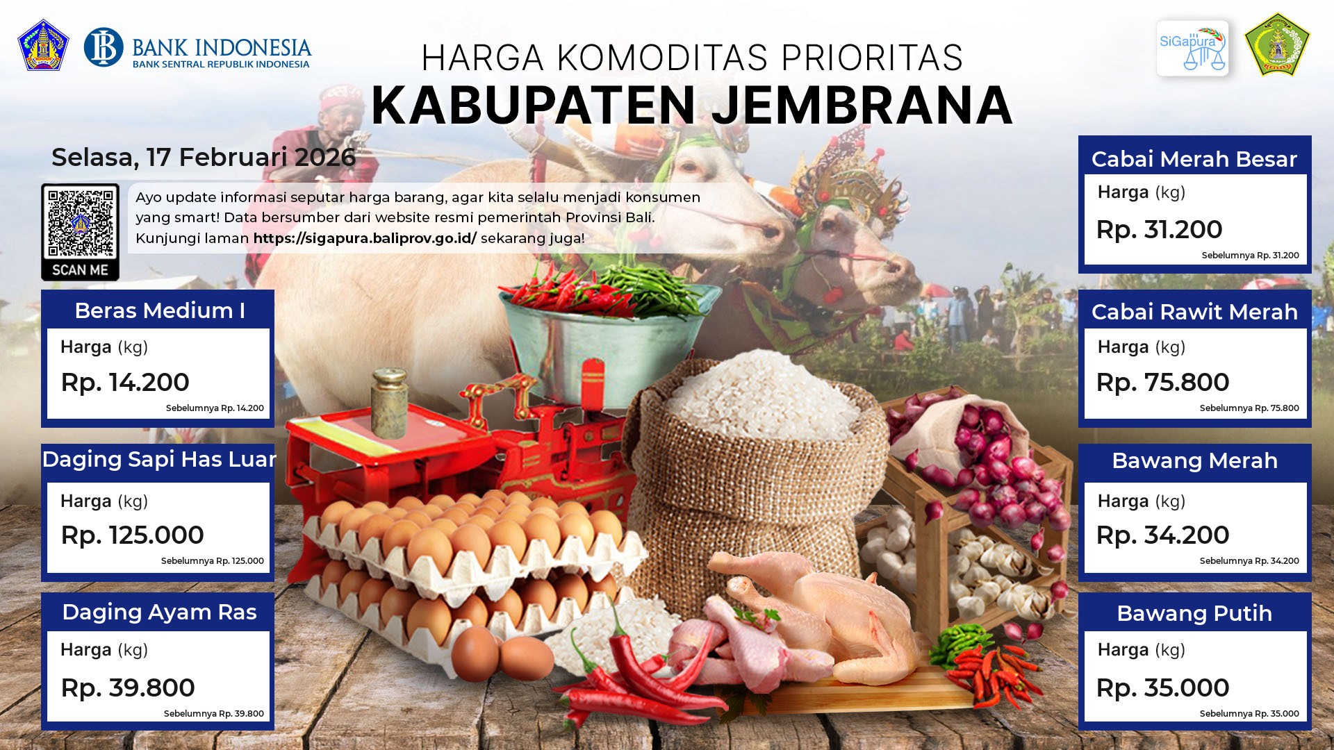Berdasarkan pemantauan Harga Pangan Rata-Rata 7 (tujuh) Komoditas Prioritas di 60 Pasar seluruh Bali pada tanggal 17 Februari 2026, diperoleh informasi Beras Medium I tetap ada diharga Rp. 14.520. Daging Sapi Has Luar tetap ada diharga Rp. 121.263. Daging Ayam Ras tetap ada diharga Rp. 42.257. Cabai Merah Besar tetap ada diharga Rp. 33.993. Cabai Rawit Merah tetap ada diharga Rp. 77.455. Bawang Merah tetap ada diharga Rp. 33.521. Bawang Putih ada diharga Rp. 34.212, mengalami penurunan sebesar 0.05%.