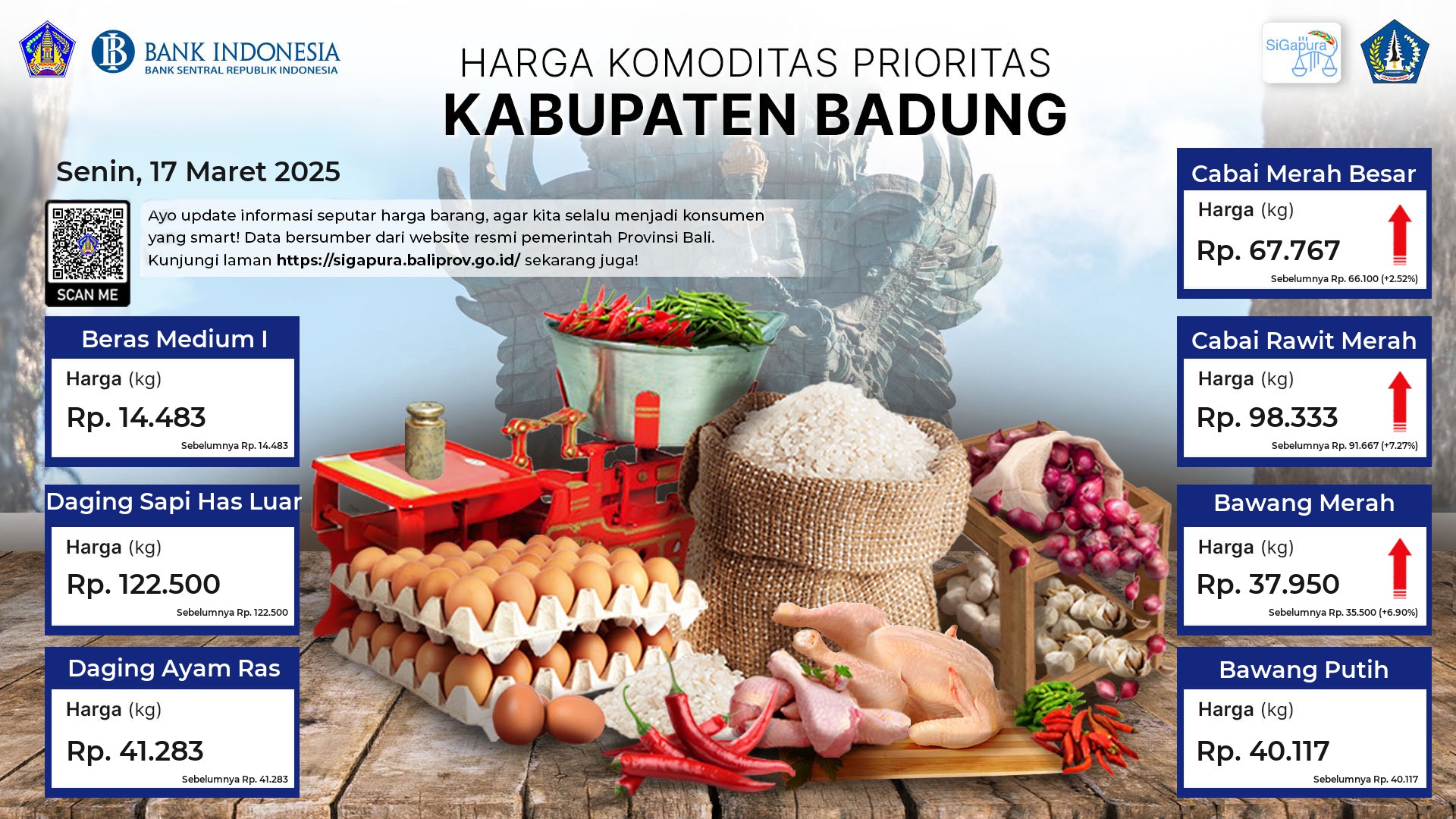Berdasarkan pemantauan Harga Pangan Rata-Rata 7 (tujuh) Komoditas Prioritas di 60 Pasar seluruh Bali pada tanggal 17 Maret 2025, diperoleh informasi Beras Medium I tetap ada diharga Rp. 14.361. Daging Sapi Has Luar ada diharga Rp. 121.788, mengalami penurunan sebesar 0.16%. Daging Ayam Ras ada diharga Rp. 40.509, mengalami penurunan sebesar 0.57%. Cabai Merah Besar ada diharga Rp. 49.868, mengalami penurunan sebesar 3.39%. Cabai Rawit Merah ada diharga Rp. 96.285, mengalami kenaikan sebesar 4.60%. Bawang Merah ada diharga Rp. 35.284, mengalami kenaikan sebesar 3.51%. Bawang Putih ada diharga Rp. 40.549, mengalami kenaikan sebesar 0.50%.