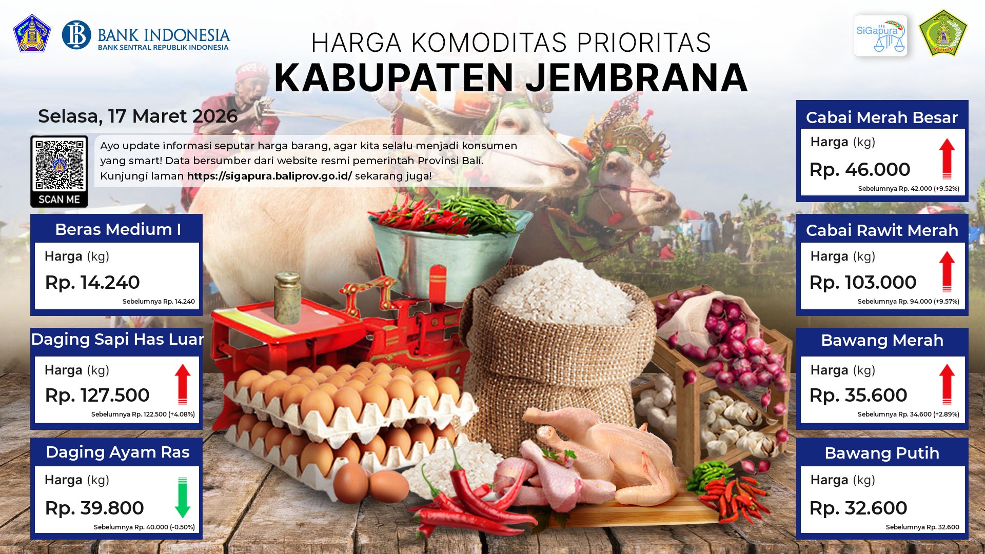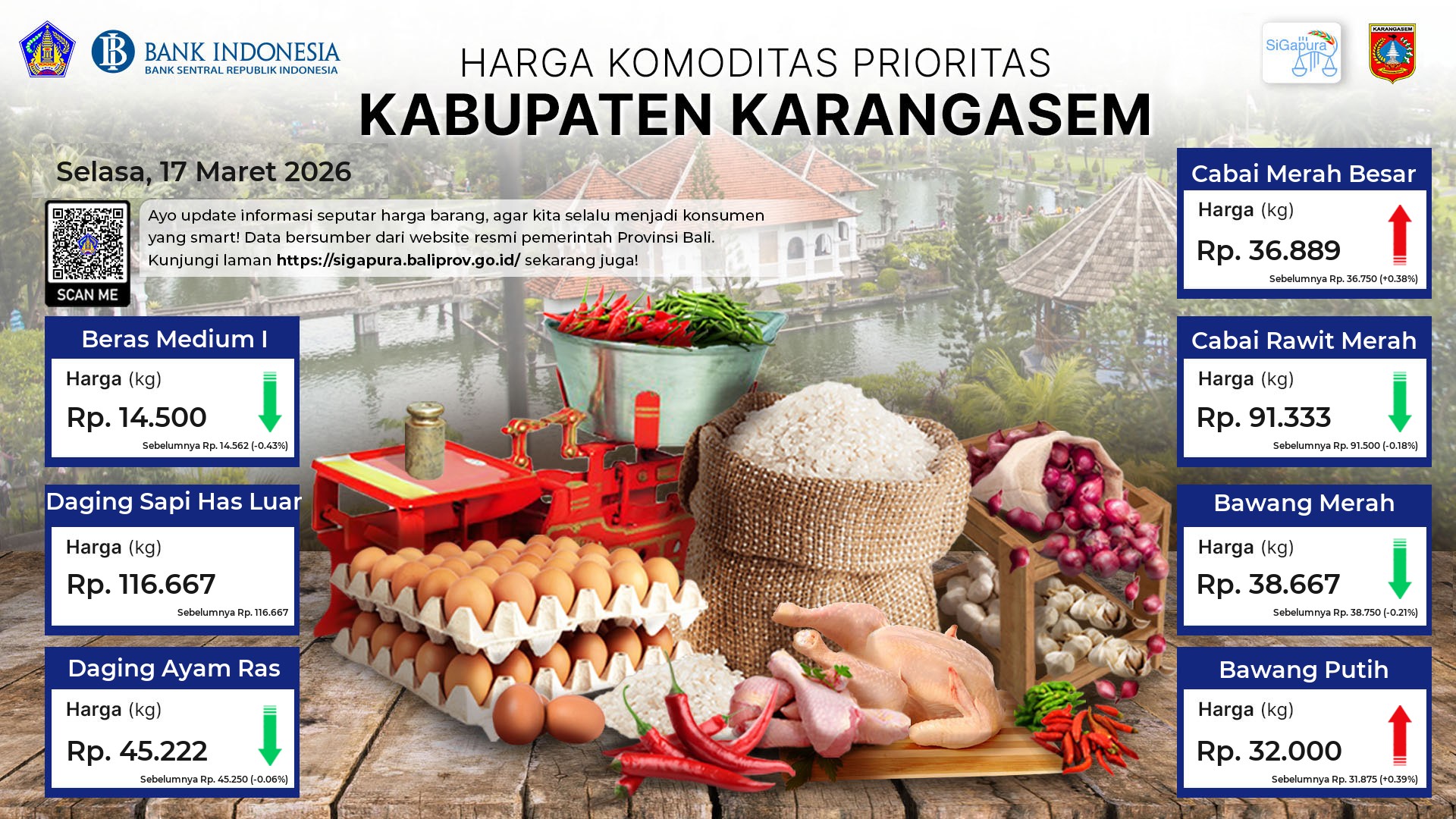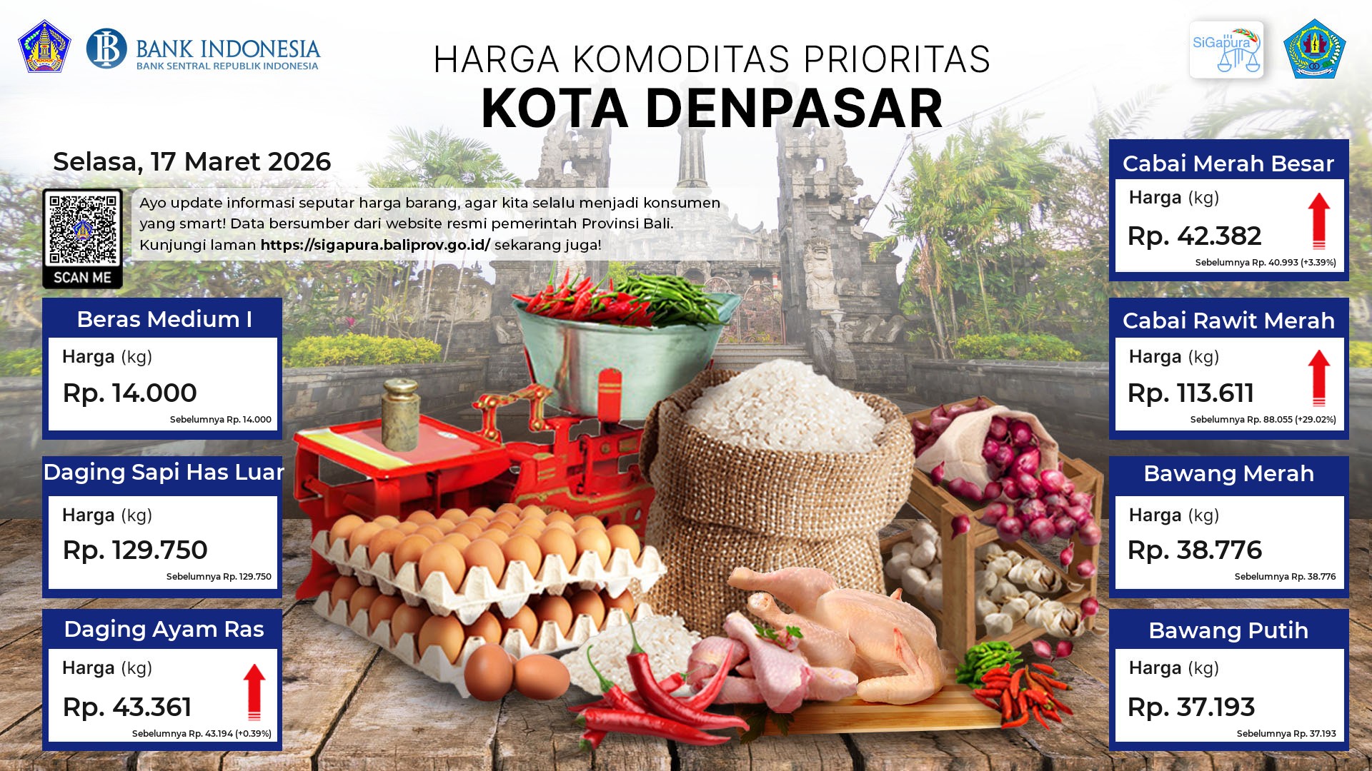 Berdasarkan pemantauan Harga Pangan Rata-Rata 7 (tujuh) Komoditas Prioritas di 60 Pasar seluruh Bali pada tanggal 17 Maret 2026, diperoleh informasi Beras Medium I ada diharga Rp. 14.366, mengalami kenaikan sebesar 0.02%. Daging Sapi Has Luar ada diharga Rp. 123.030, mengalami penurunan sebesar 3.15%. Daging Ayam Ras ada diharga Rp. 42.675, mengalami kenaikan sebesar 0.34%. Cabai Merah Besar ada diharga Rp. 38.936, mengalami kenaikan sebesar 1.81%. Cabai Rawit Merah ada diharga Rp. 96.272, mengalami kenaikan sebesar 3.47%. Bawang Merah ada diharga Rp. 36.430, mengalami kenaikan sebesar 0.70%. Bawang Putih ada diharga Rp. 33.917, mengalami kenaikan sebesar 0.01%.
