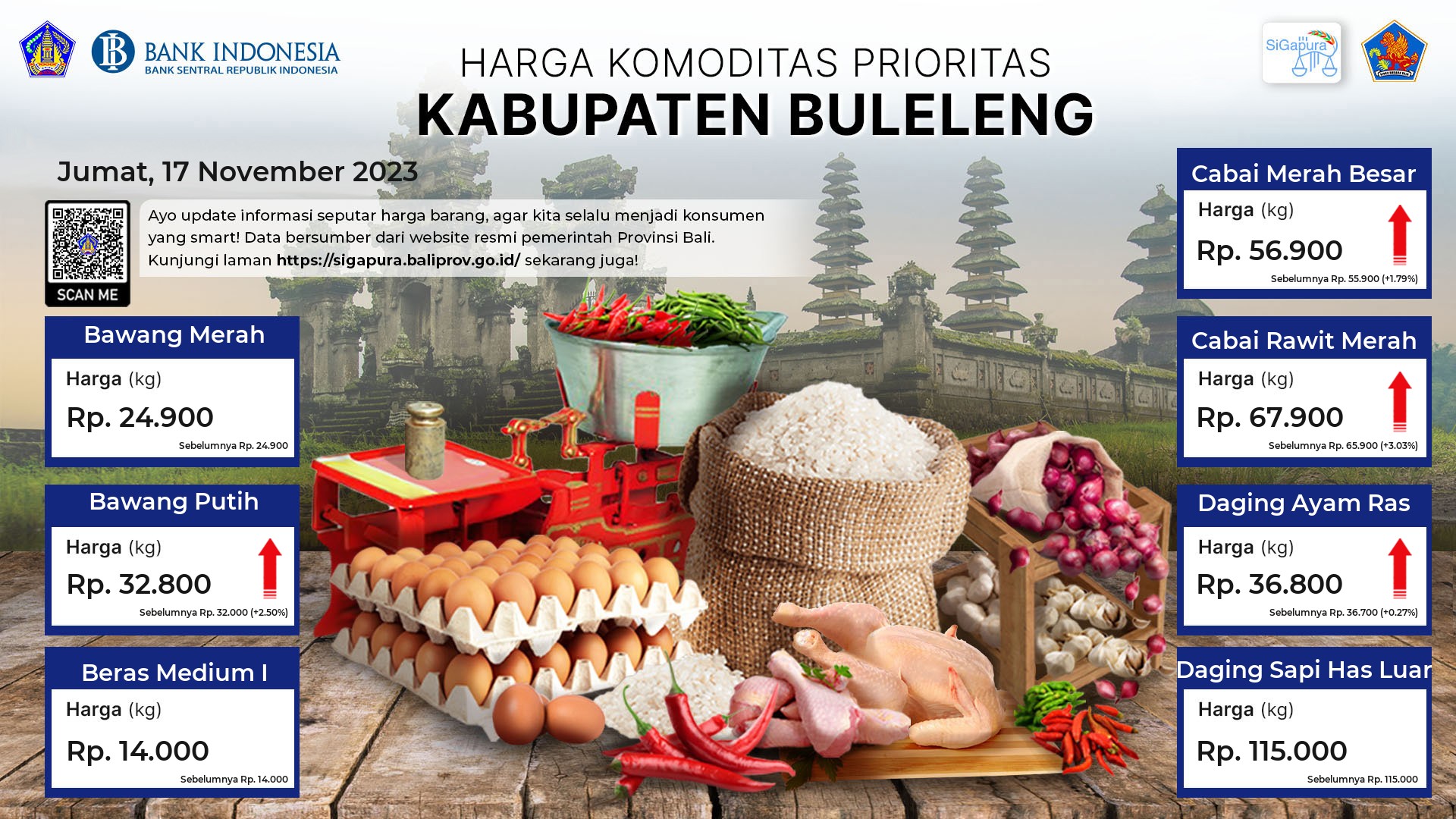 Berdasarkan pemantauan Harga Pangan Rata-Rata 7 (tujuh) Komoditas Prioritas di 60 Pasar seluruh Bali pada tanggal 17 November 2023, diperoleh informasi Bawang Merah ada diharga Rp. 23.835, mengalami penurunan sebesar 0.16%. Bawang Putih ada diharga Rp. 32.114, mengalami kenaikan sebesar 0.10%. Beras Medium I ada diharga Rp. 13.911, mengalami penurunan sebesar 0.01%. Cabai Merah Besar ada diharga Rp. 56.745, mengalami kenaikan sebesar 1.82%. Cabai Rawit Merah ada diharga Rp. 70.304, mengalami kenaikan sebesar 0.13%. Daging Ayam Ras ada diharga Rp. 38.945, mengalami penurunan sebesar 0.35%. Daging Sapi Has Luar tetap ada diharga Rp. 120.141.