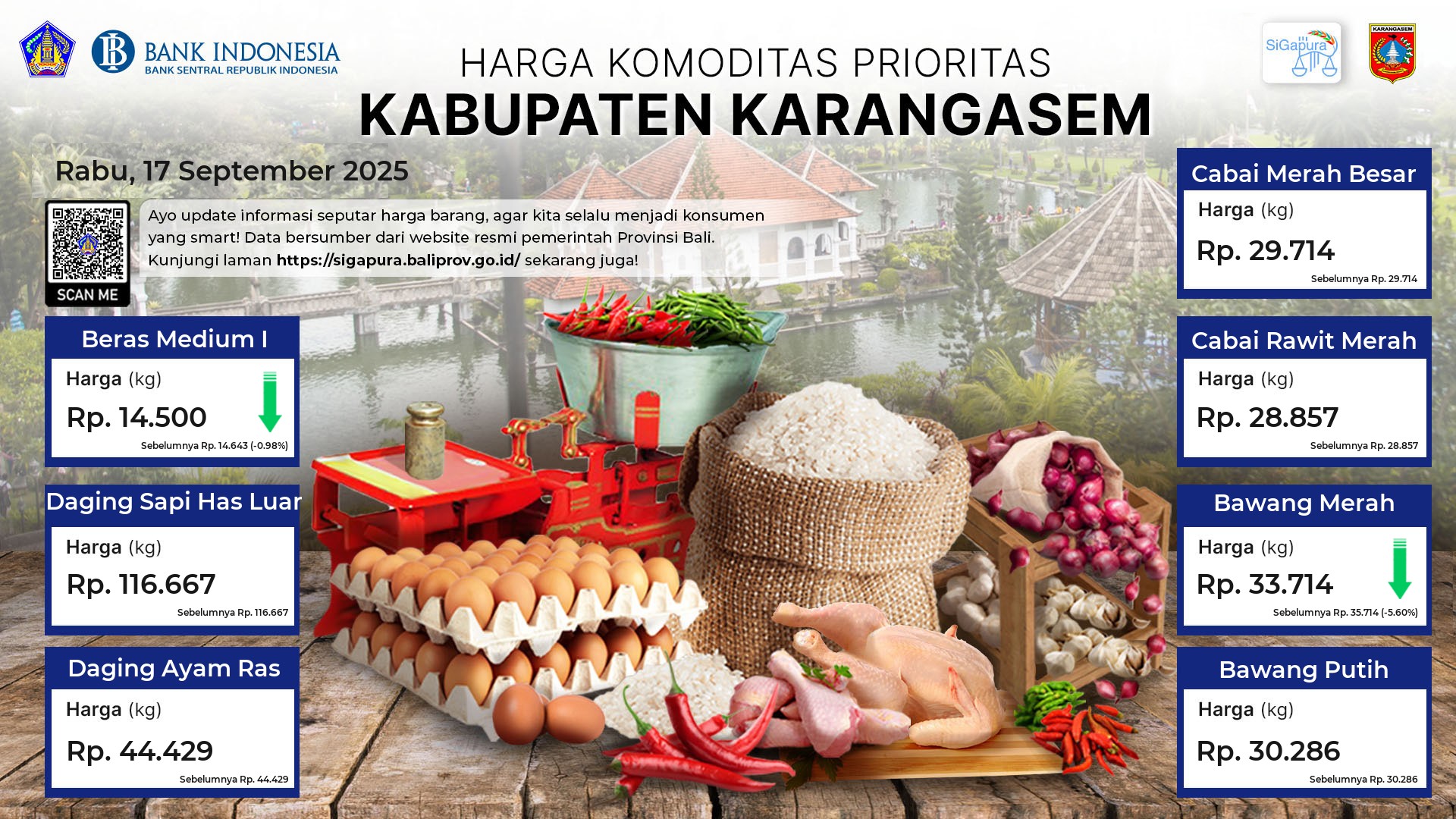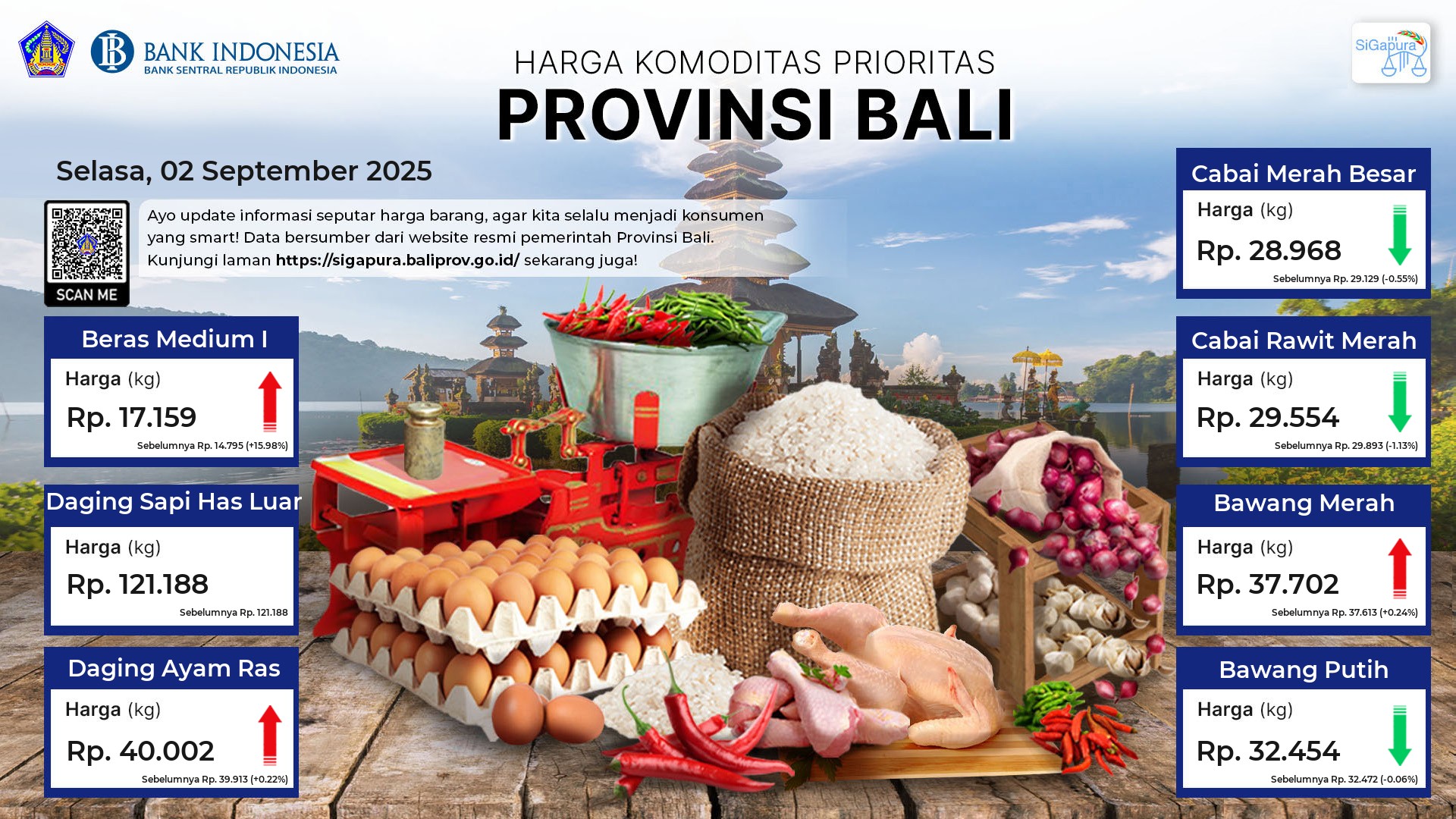 Berdasarkan pemantauan Harga Pangan Rata-Rata 7 (tujuh) Komoditas Prioritas di 60 Pasar seluruh Bali pada tanggal 17 September 2025, diperoleh informasi Beras Medium I ada diharga Rp. 14.852, mengalami penurunan sebesar 0.12%. Daging Sapi Has Luar ada diharga Rp. 120.988, mengalami kenaikan sebesar 3.88%. Daging Ayam Ras ada diharga Rp. 41.753, mengalami penurunan sebesar 0.08%. Cabai Merah Besar ada diharga Rp. 34.142, mengalami kenaikan sebesar 0.68%. Cabai Rawit Merah ada diharga Rp. 33.407, mengalami kenaikan sebesar 1.63%. Bawang Merah ada diharga Rp. 32.820, mengalami penurunan sebesar 1.29%. Bawang Putih ada diharga Rp. 32.567, mengalami kenaikan sebesar 0.55%.