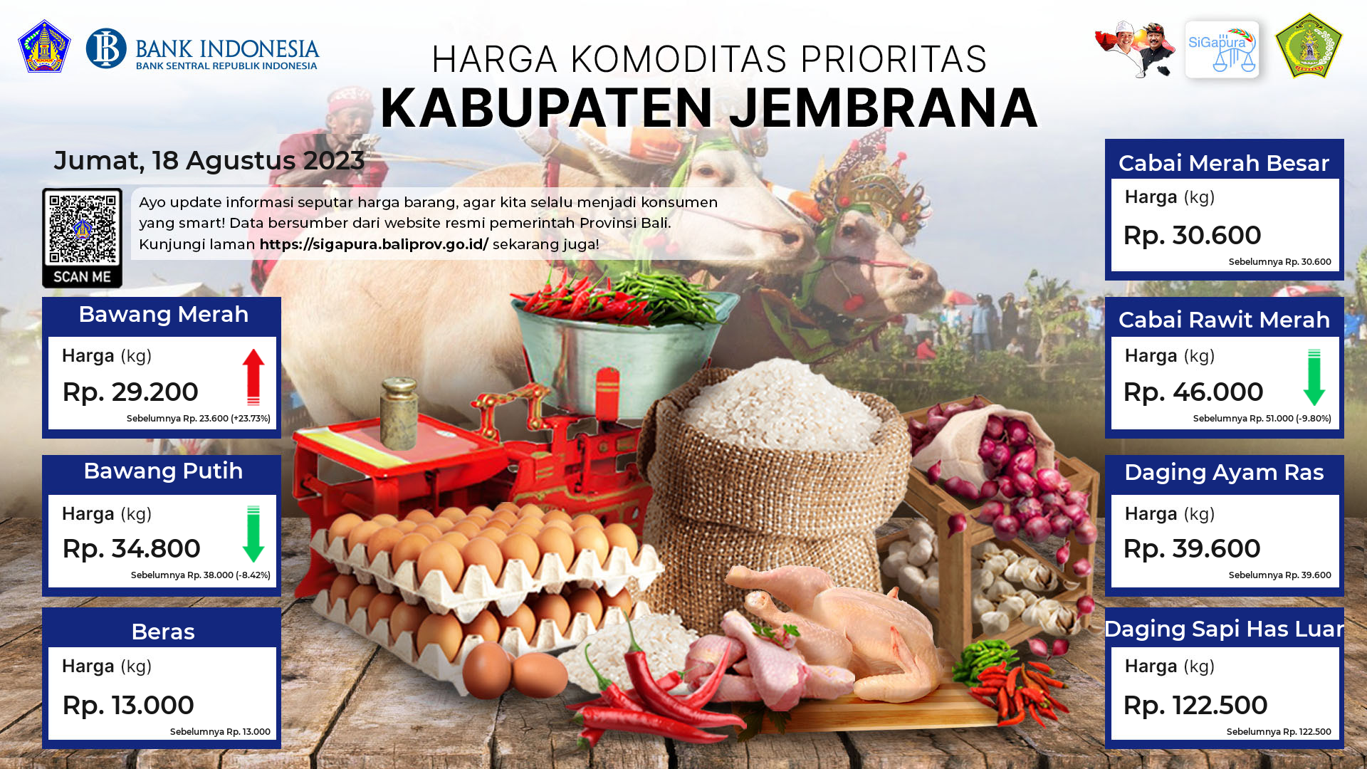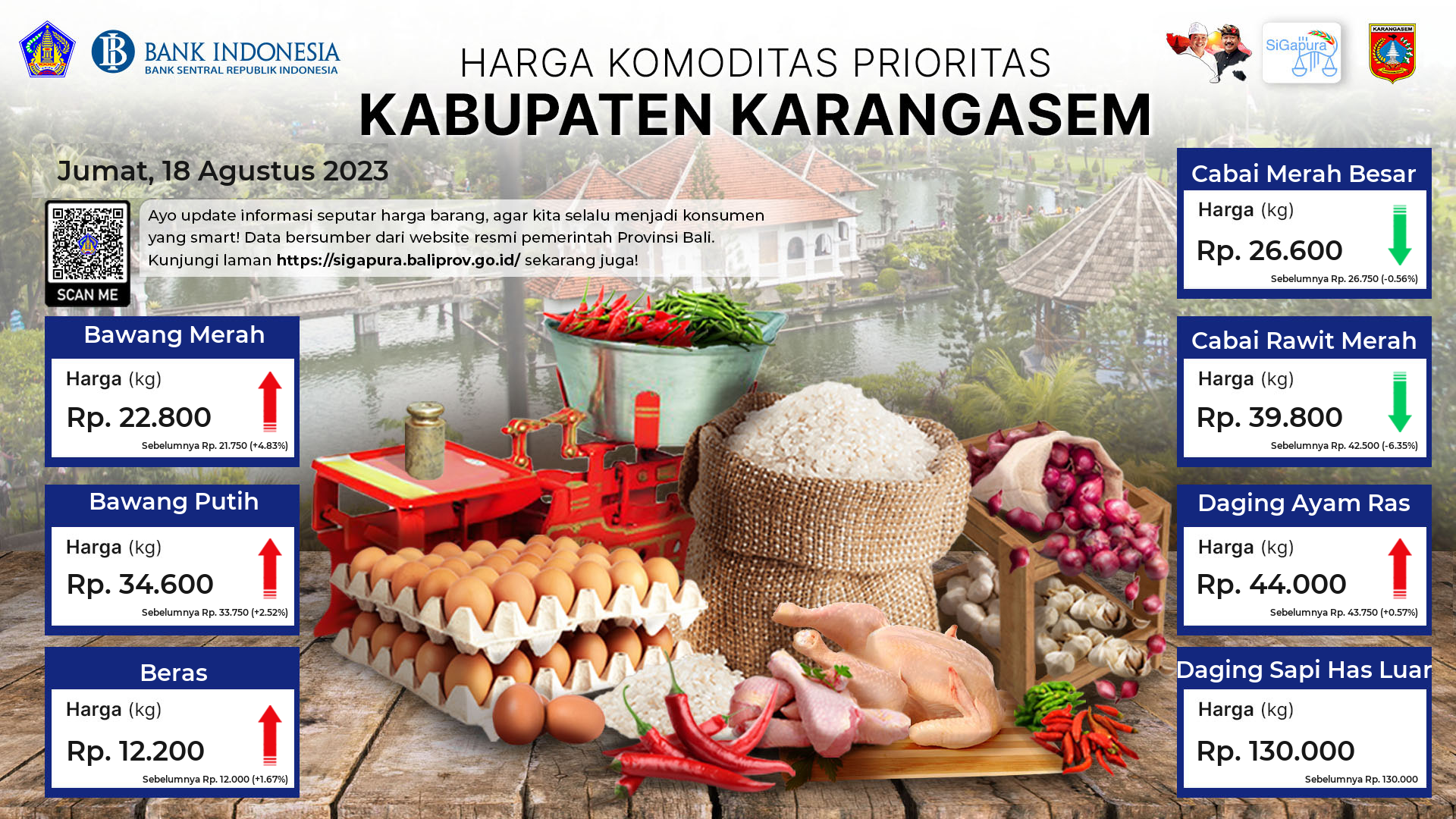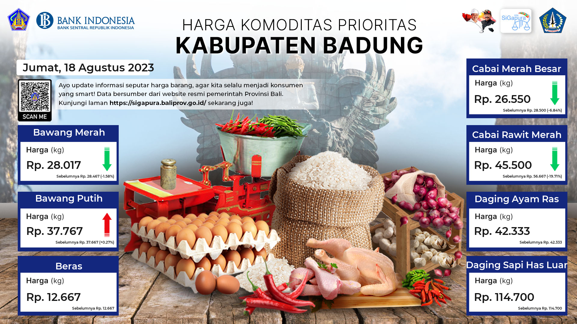 Berdasarkan pemantauan Harga Pangan Rata-Rata 7 (tujuh) Komoditas Prioritas di 60 Pasar seluruh Bali pada tanggal 18 Agustus 2023, diperoleh informasi Bawang Merah ada diharga Rp. 23.587, mengalami penurunan sebesar 0.83%. Bawang Putih ada diharga Rp. 37.709, mengalami kenaikan sebesar 0.10%. Beras ada diharga Rp. 12.226, mengalami kenaikan sebesar 0.11%. Cabai Merah Besar ada diharga Rp. 24.760, mengalami penurunan sebesar 4.13%. Cabai Rawit Merah ada diharga Rp. 43.717, mengalami penurunan sebesar 9.47%. Daging Ayam Ras ada diharga Rp. 41.396, mengalami penurunan sebesar 0.20%. Daging Sapi Has Luar tetap ada diharga Rp. 115.930.