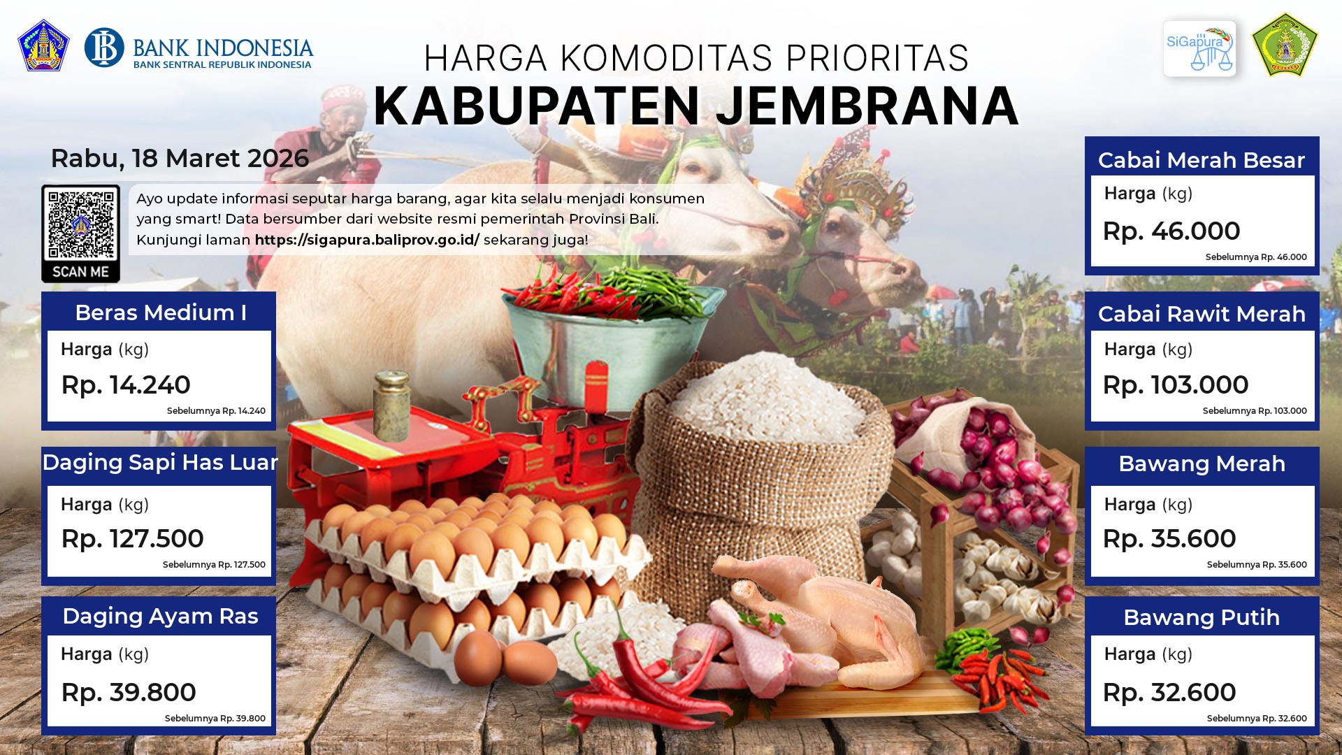 Berdasarkan pemantauan Harga Pangan Rata-Rata 7 (tujuh) Komoditas Prioritas di 60 Pasar seluruh Bali pada tanggal 18 Maret 2026, diperoleh informasi Beras Medium I tetap ada diharga Rp. 14.366. Daging Sapi Has Luar tetap ada diharga Rp. 123.030. Daging Ayam Ras tetap ada diharga Rp. 42.675. Cabai Merah Besar tetap ada diharga Rp. 38.936. Cabai Rawit Merah ada diharga Rp. 97.942, mengalami kenaikan sebesar 1.73%. Bawang Merah tetap ada diharga Rp. 36.430. Bawang Putih tetap ada diharga Rp. 33.917.