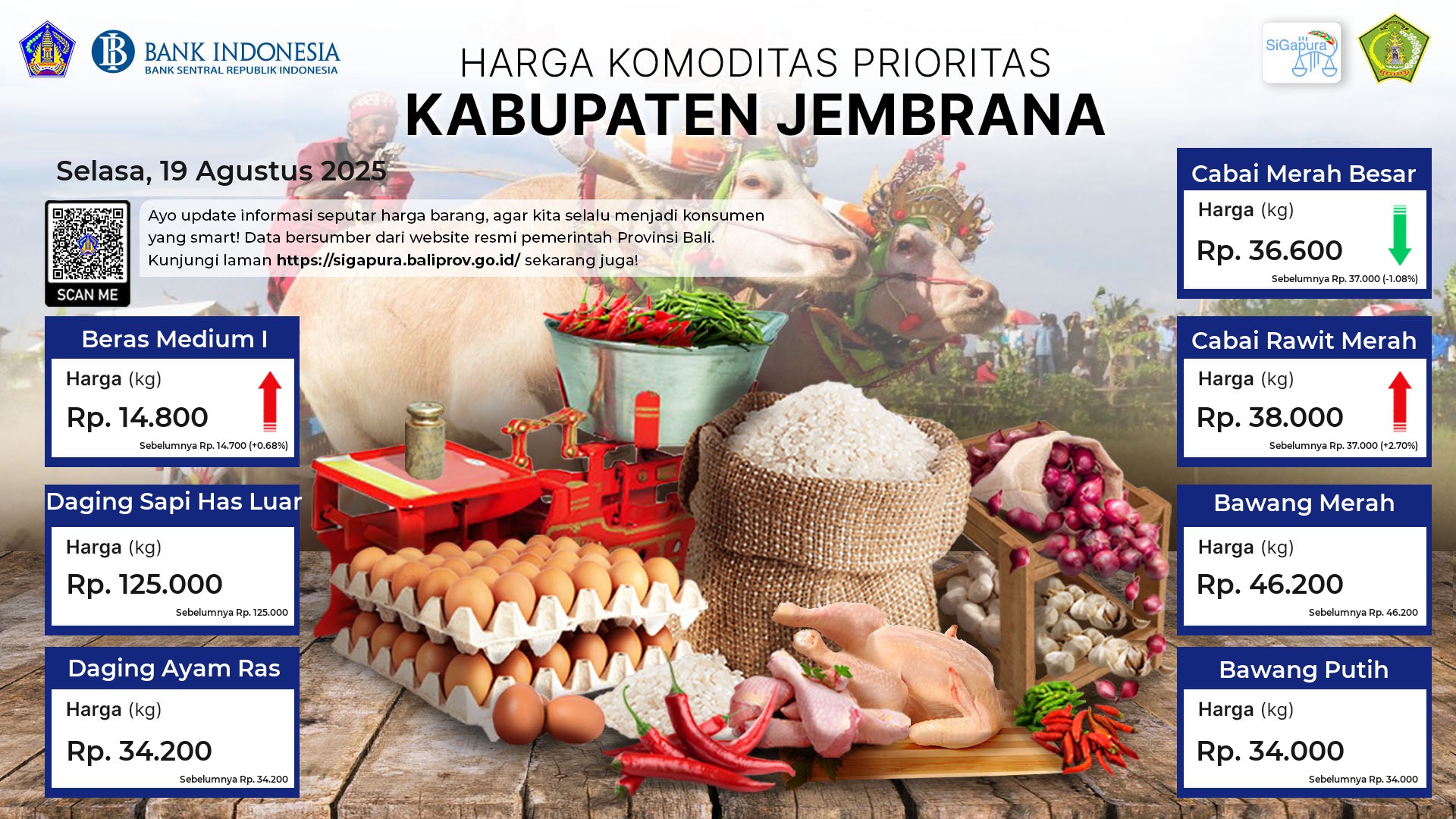 Berdasarkan pemantauan Harga Pangan Rata-Rata 7 (tujuh) Komoditas Prioritas di 60 Pasar seluruh Bali pada tanggal 19 Agustus 2025, diperoleh informasi Beras Medium I ada diharga Rp. 14.697, mengalami penurunan sebesar 0.02%. Daging Sapi Has Luar tetap ada diharga Rp. 121.188. Daging Ayam Ras ada diharga Rp. 39.382, mengalami kenaikan sebesar 0.39%. Cabai Merah Besar ada diharga Rp. 32.020, mengalami penurunan sebesar 3.13%. Cabai Rawit Merah ada diharga Rp. 33.068, mengalami kenaikan sebesar 0.07%. Bawang Merah ada diharga Rp. 46.736, mengalami penurunan sebesar 3.79%. Bawang Putih ada diharga Rp. 33.249, mengalami kenaikan sebesar 0.53%.