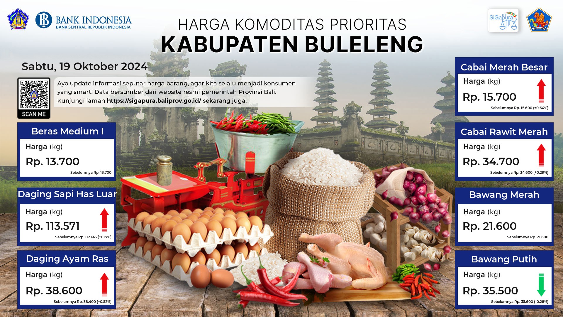 Berdasarkan pemantauan Harga Pangan Rata-Rata 7 (tujuh) Komoditas Prioritas di 60 Pasar seluruh Bali pada tanggal 19 Oktober 2024, diperoleh informasi Beras Medium I tetap ada diharga Rp. 14.359. Daging Sapi Has Luar ada diharga Rp. 117.788, mengalami kenaikan sebesar 0.34%. Daging Ayam Ras ada diharga Rp. 39.007, mengalami kenaikan sebesar 0.09%. Cabai Merah Besar ada diharga Rp. 17.807, mengalami kenaikan sebesar 0.10%. Cabai Rawit Merah ada diharga Rp. 40.374, mengalami kenaikan sebesar 0.04%. Bawang Merah tetap ada diharga Rp. 23.272. Bawang Putih ada diharga Rp. 36.521, mengalami penurunan sebesar 0.05%.