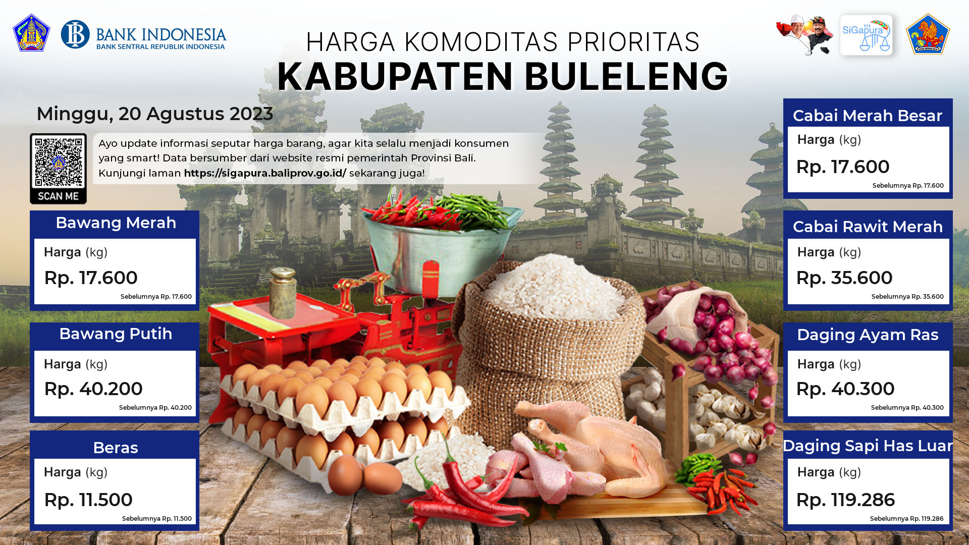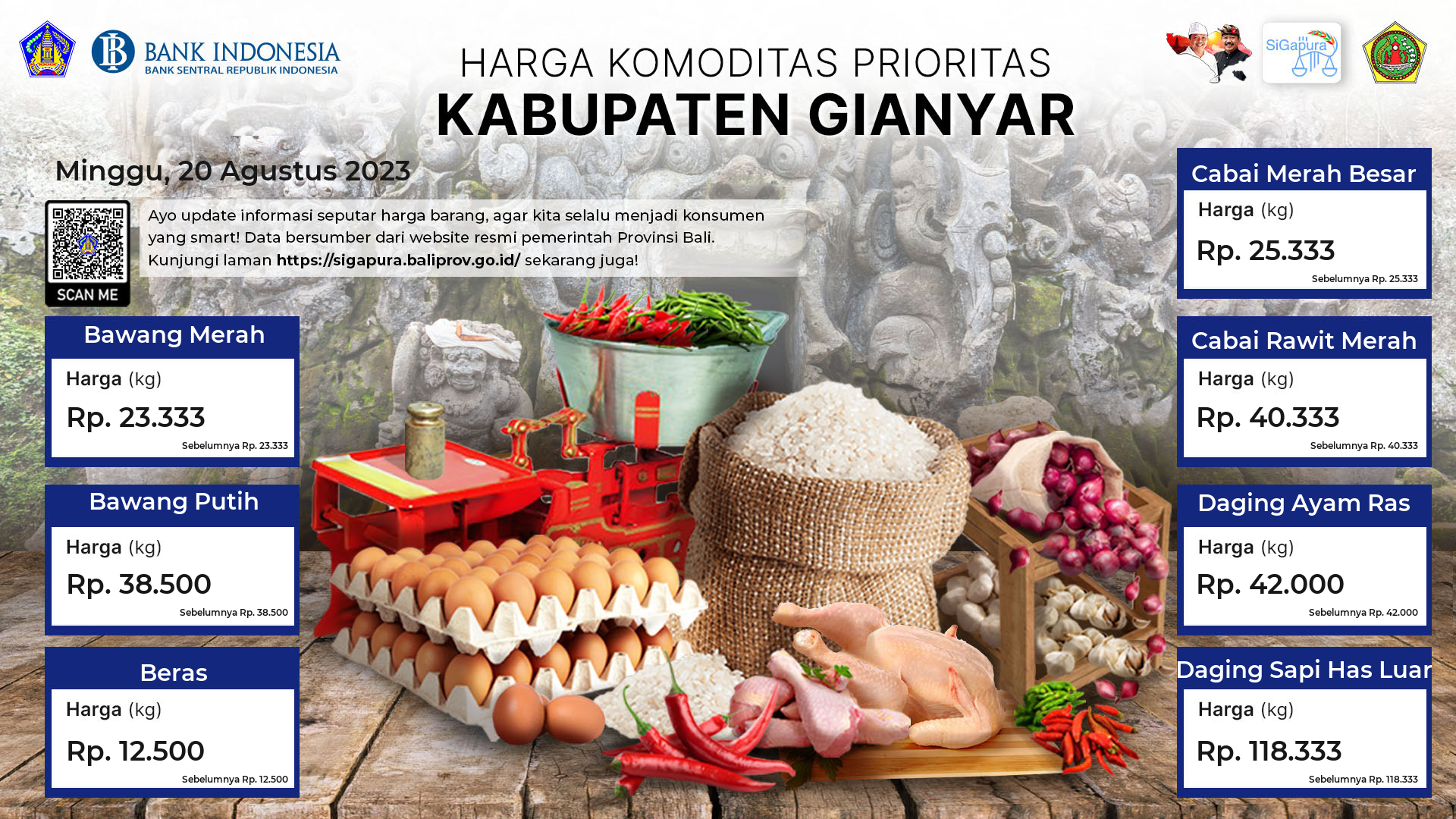 Berdasarkan pemantauan Harga Pangan Rata-Rata 7 (tujuh) Komoditas Prioritas di 60 Pasar seluruh Bali pada tanggal 20 Agustus 2023, diperoleh informasi Bawang Merah tetap ada diharga Rp. 22.964. Bawang Putih tetap ada diharga Rp. 37.974. Beras tetap ada diharga Rp. 12.226. Cabai Merah Besar tetap ada diharga Rp. 24.760. Cabai Rawit Merah tetap ada diharga Rp. 44.189. Daging Ayam Ras tetap ada diharga Rp. 41.396. Daging Sapi Has Luar tetap ada diharga Rp. 115.930.