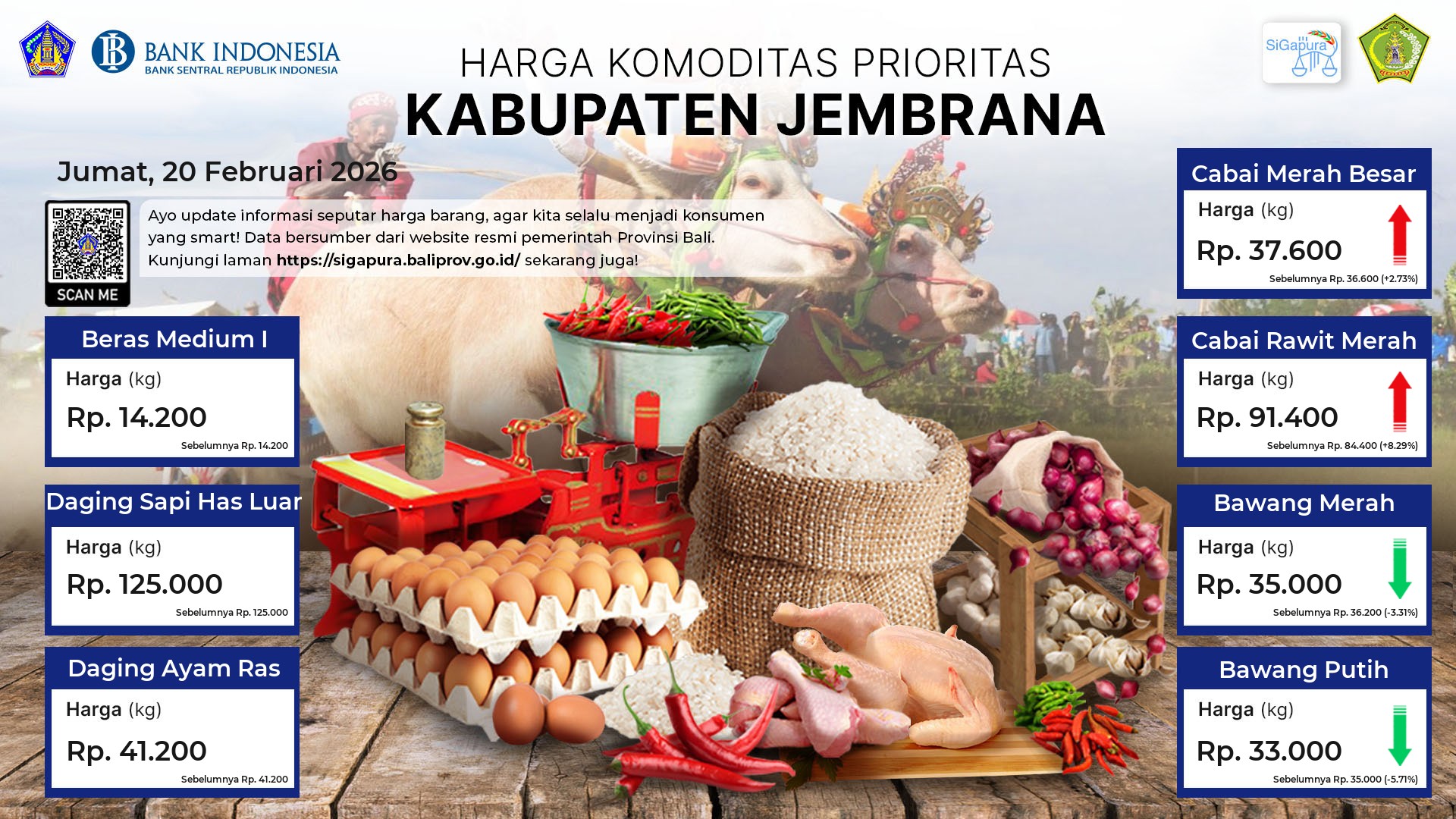 Berdasarkan pemantauan Harga Pangan Rata-Rata 7 (tujuh) Komoditas Prioritas di 60 Pasar seluruh Bali pada tanggal 20 Februari 2026, diperoleh informasi Beras Medium I ada diharga Rp. 14.467, mengalami penurunan sebesar 0.12%. Daging Sapi Has Luar tetap ada diharga Rp. 120.990. Daging Ayam Ras ada diharga Rp. 43.205, mengalami penurunan sebesar 0.21%. Cabai Merah Besar ada diharga Rp. 36.928, mengalami kenaikan sebesar 3.19%. Cabai Rawit Merah ada diharga Rp. 89.470, mengalami kenaikan sebesar 2.76%. Bawang Merah ada diharga Rp. 36.481, mengalami kenaikan sebesar 2.68%. Bawang Putih ada diharga Rp. 35.217, mengalami kenaikan sebesar 4.89%.