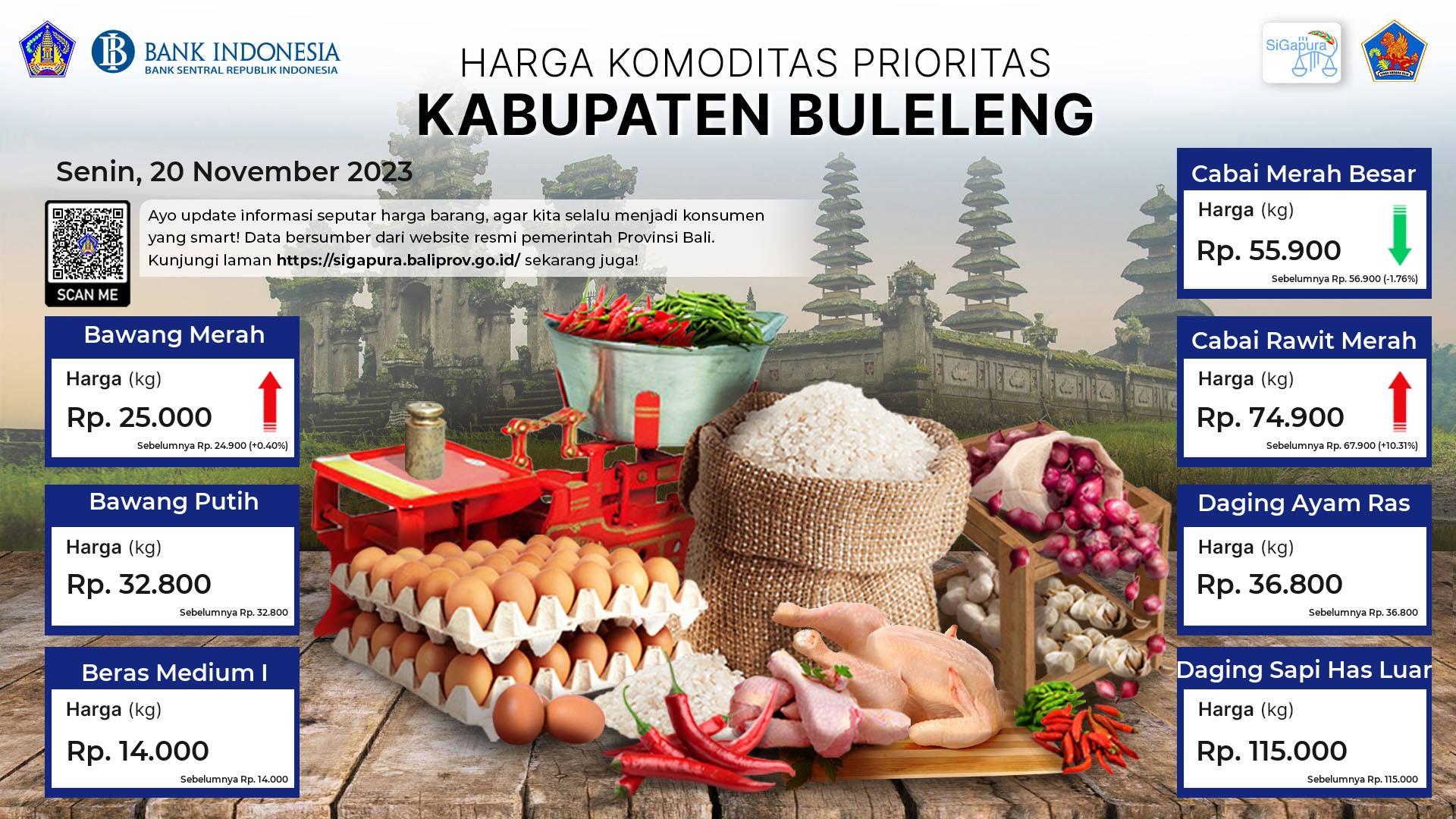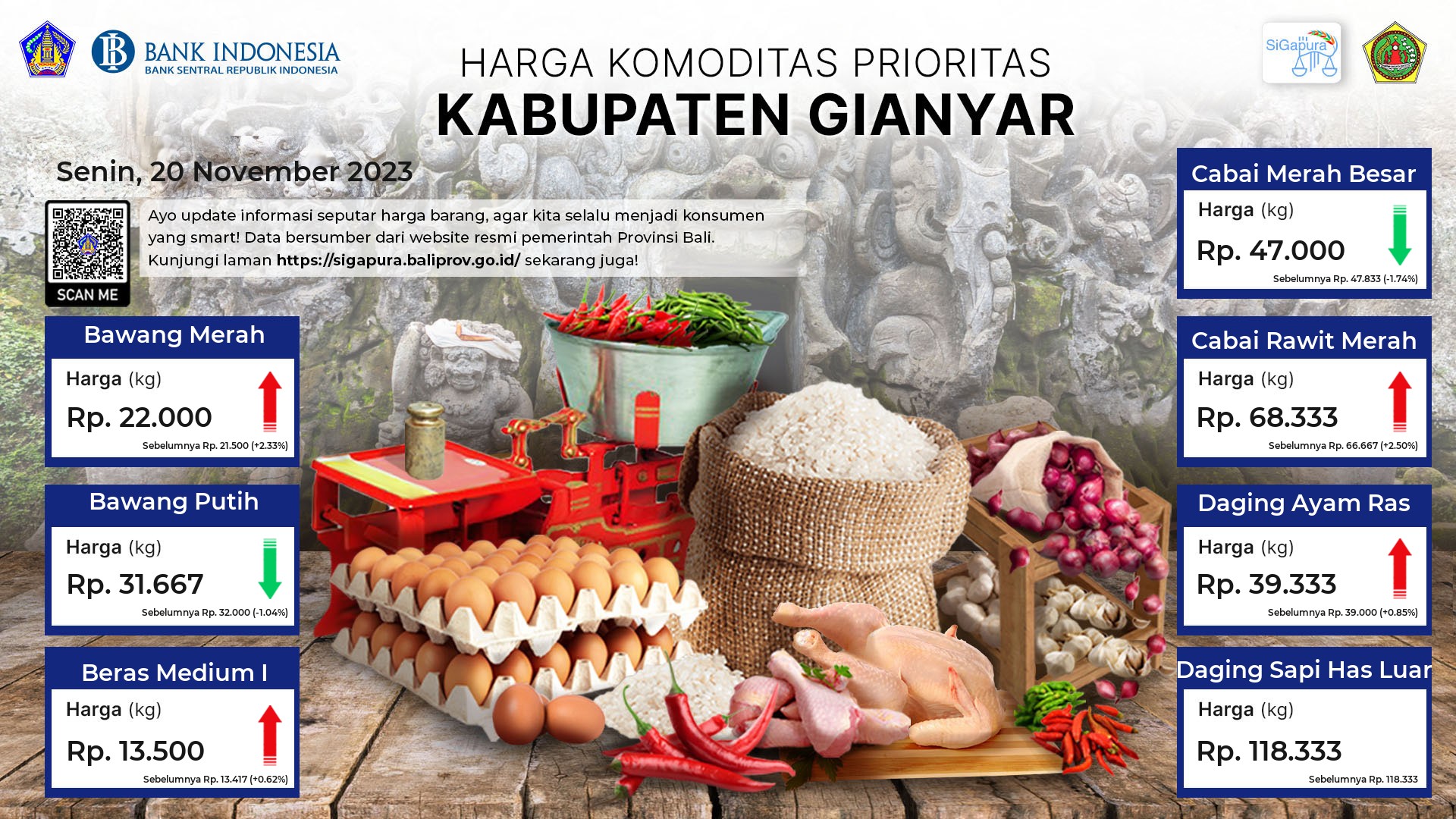 Berdasarkan pemantauan Harga Pangan Rata-Rata 7 (tujuh) Komoditas Prioritas di 60 Pasar seluruh Bali pada tanggal 20 November 2023, diperoleh informasi Bawang Merah ada diharga Rp. 23.282, mengalami penurunan sebesar 3.05%. Bawang Putih ada diharga Rp. 32.352, mengalami kenaikan sebesar 0.91%. Beras Medium I ada diharga Rp. 13.920, mengalami kenaikan sebesar 0.06%. Cabai Merah Besar ada diharga Rp. 55.352, mengalami penurunan sebesar 2.45%. Cabai Rawit Merah ada diharga Rp. 77.550, mengalami kenaikan sebesar 10.45%. Daging Ayam Ras ada diharga Rp. 38.962, mengalami kenaikan sebesar 0.04%. Daging Sapi Has Luar tetap ada diharga Rp. 120.141.