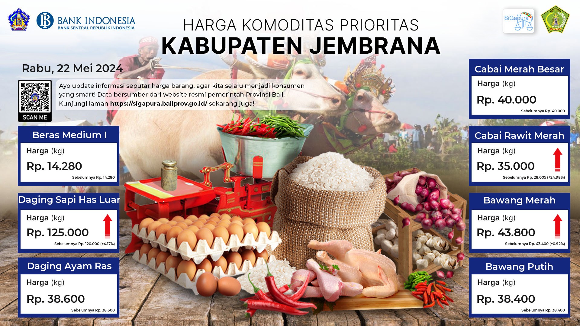 Berdasarkan pemantauan Harga Pangan Rata-Rata 7 (tujuh) Komoditas Prioritas di 60 Pasar seluruh Bali pada tanggal 22 Mei 2024, diperoleh informasi Beras Medium I ada diharga Rp. 13.923, mengalami penurunan sebesar 0.15%. Daging Sapi Has Luar ada diharga Rp. 114.953, mengalami penurunan sebesar 3.17%. Daging Ayam Ras ada diharga Rp. 40.942, mengalami penurunan sebesar 0.60%. Cabai Merah Besar ada diharga Rp. 47.903, mengalami kenaikan sebesar 1.09%. Cabai Rawit Merah ada diharga Rp. 30.997, mengalami kenaikan sebesar 2.61%. Bawang Merah ada diharga Rp. 44.524, mengalami kenaikan sebesar 0.50%. Bawang Putih ada diharga Rp. 39.360, mengalami kenaikan sebesar 1.95%.