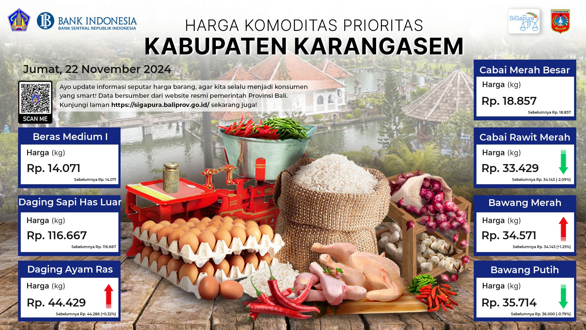 Berdasarkan pemantauan Harga Pangan Rata-Rata 7 (tujuh) Komoditas Prioritas di 60 Pasar seluruh Bali pada tanggal 22 November 2024, diperoleh informasi Beras Medium I ada diharga Rp. 14.210, mengalami penurunan sebesar 1.26%. Daging Sapi Has Luar ada diharga Rp. 117.178, mengalami penurunan sebesar 0.71%. Daging Ayam Ras ada diharga Rp. 41.331, mengalami kenaikan sebesar 0.44%. Cabai Merah Besar ada diharga Rp. 18.595, mengalami penurunan sebesar 1.63%. Cabai Rawit Merah ada diharga Rp. 33.675, mengalami penurunan sebesar 1.39%. Bawang Merah ada diharga Rp. 34.617, mengalami kenaikan sebesar 0.32%. Bawang Putih ada diharga Rp. 37.583, mengalami kenaikan sebesar 0.22%.