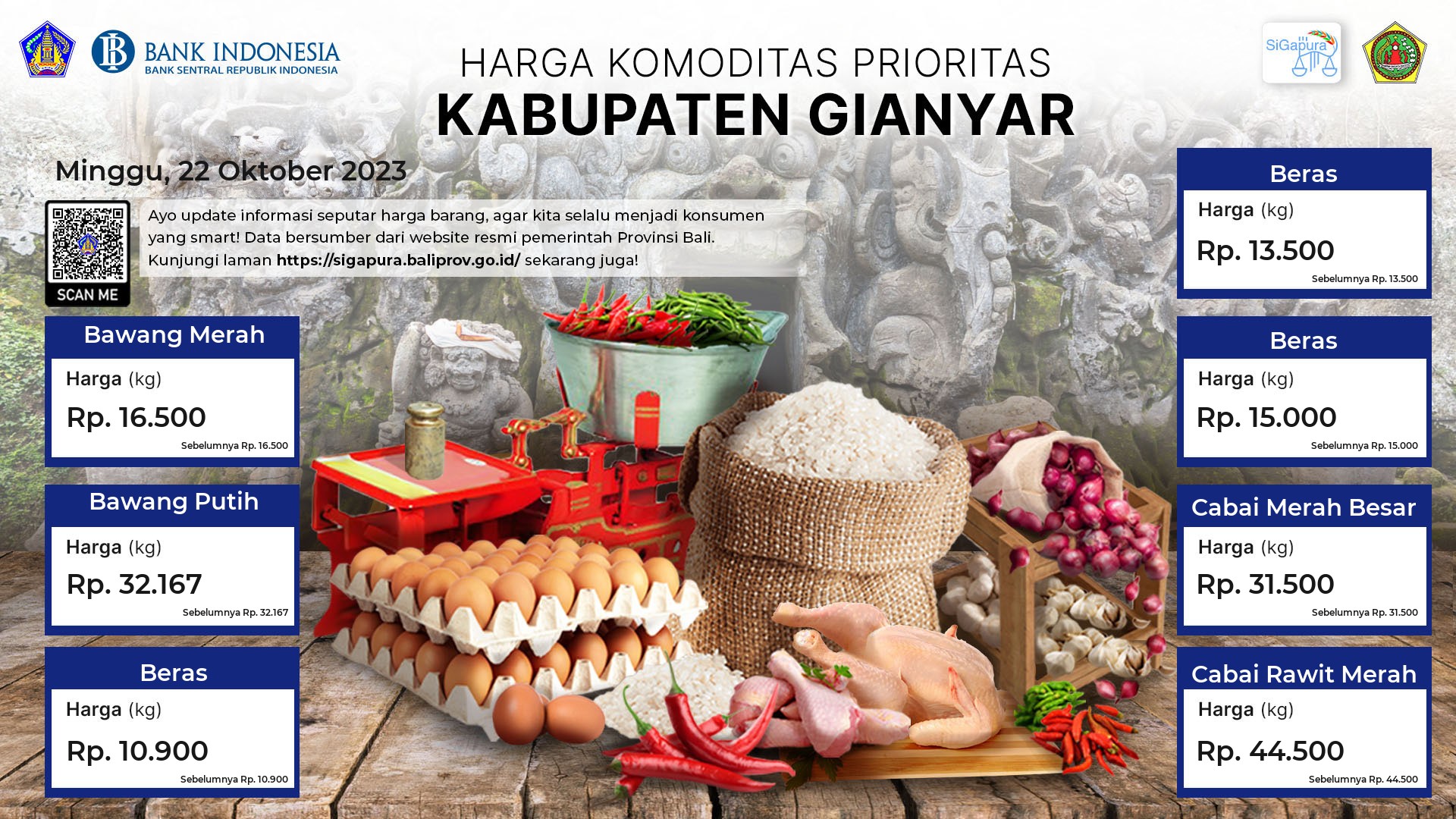 Berdasarkan pemantauan Harga Pangan Rata-Rata 7 (tujuh) Komoditas Prioritas di 60 Pasar seluruh Bali pada tanggal 22 Oktober 2023, diperoleh informasi Bawang Merah tetap ada diharga Rp. 16.443. Bawang Putih ada diharga Rp. 33.204, mengalami penurunan sebesar 0.26%. Beras tetap ada diharga Rp. 10.930. Beras tetap ada diharga Rp. 13.961. Beras tetap ada diharga Rp. 14.986. Cabai Merah Besar tetap ada diharga Rp. 31.501. Cabai Rawit Merah tetap ada diharga Rp. 49.612. Daging Ayam Ras tetap ada diharga Rp. 39.487. Daging Sapi Has Luar tetap ada diharga Rp. 119.797.
