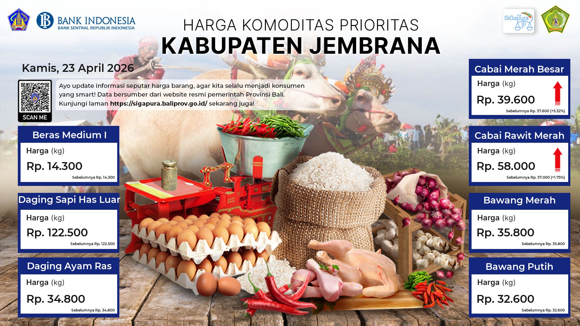 Berdasarkan pemantauan Harga Pangan Rata-Rata 7 (tujuh) Komoditas Prioritas di 60 Pasar seluruh Bali pada tanggal 23 April 2026, diperoleh informasi Beras Medium I ada diharga Rp. 14.451, mengalami kenaikan sebesar 0.18%. Daging Sapi Has Luar tetap ada diharga Rp. 123.657. Daging Ayam Ras ada diharga Rp. 40.997, mengalami penurunan sebesar 0.24%. Cabai Merah Besar ada diharga Rp. 41.923, mengalami kenaikan sebesar 0.13%. Cabai Rawit Merah ada diharga Rp. 57.070, mengalami penurunan sebesar 1.59%. Bawang Merah ada diharga Rp. 36.327, mengalami penurunan sebesar 2.08%. Bawang Putih ada diharga Rp. 33.137, mengalami penurunan sebesar 0.92%.