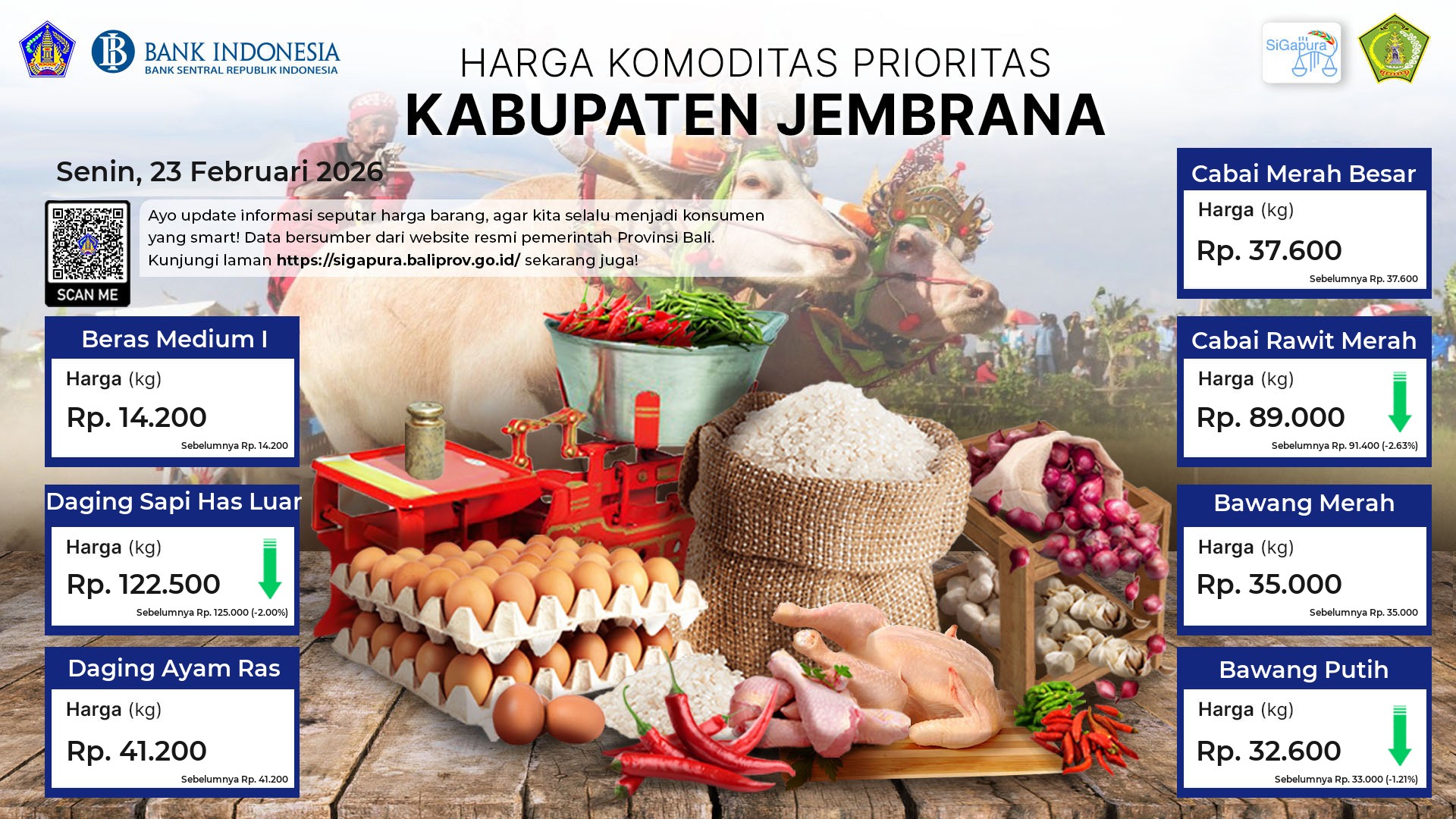 Berdasarkan pemantauan Harga Pangan Rata-Rata 7 (tujuh) Komoditas Prioritas di 60 Pasar seluruh Bali pada tanggal 23 Februari 2026, diperoleh informasi Beras Medium I ada diharga Rp. 14.452, mengalami penurunan sebesar 0.10%. Daging Sapi Has Luar ada diharga Rp. 123.950, mengalami kenaikan sebesar 2.45%. Daging Ayam Ras ada diharga Rp. 43.259, mengalami kenaikan sebesar 0.37%. Cabai Merah Besar ada diharga Rp. 38.374, mengalami kenaikan sebesar 3.92%. Cabai Rawit Merah ada diharga Rp. 86.196, mengalami penurunan sebesar 3.52%. Bawang Merah ada diharga Rp. 36.571, mengalami kenaikan sebesar 0.25%. Bawang Putih ada diharga Rp. 33.878, mengalami penurunan sebesar 3.70%.