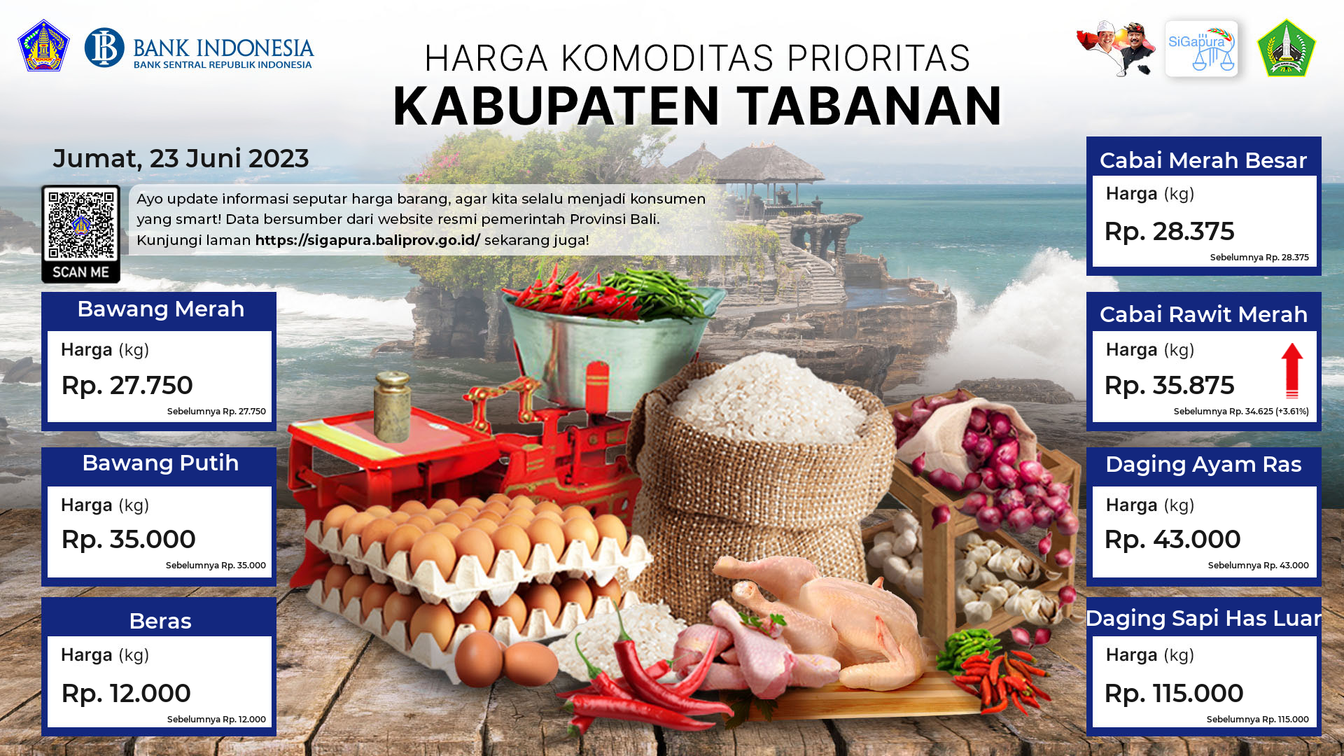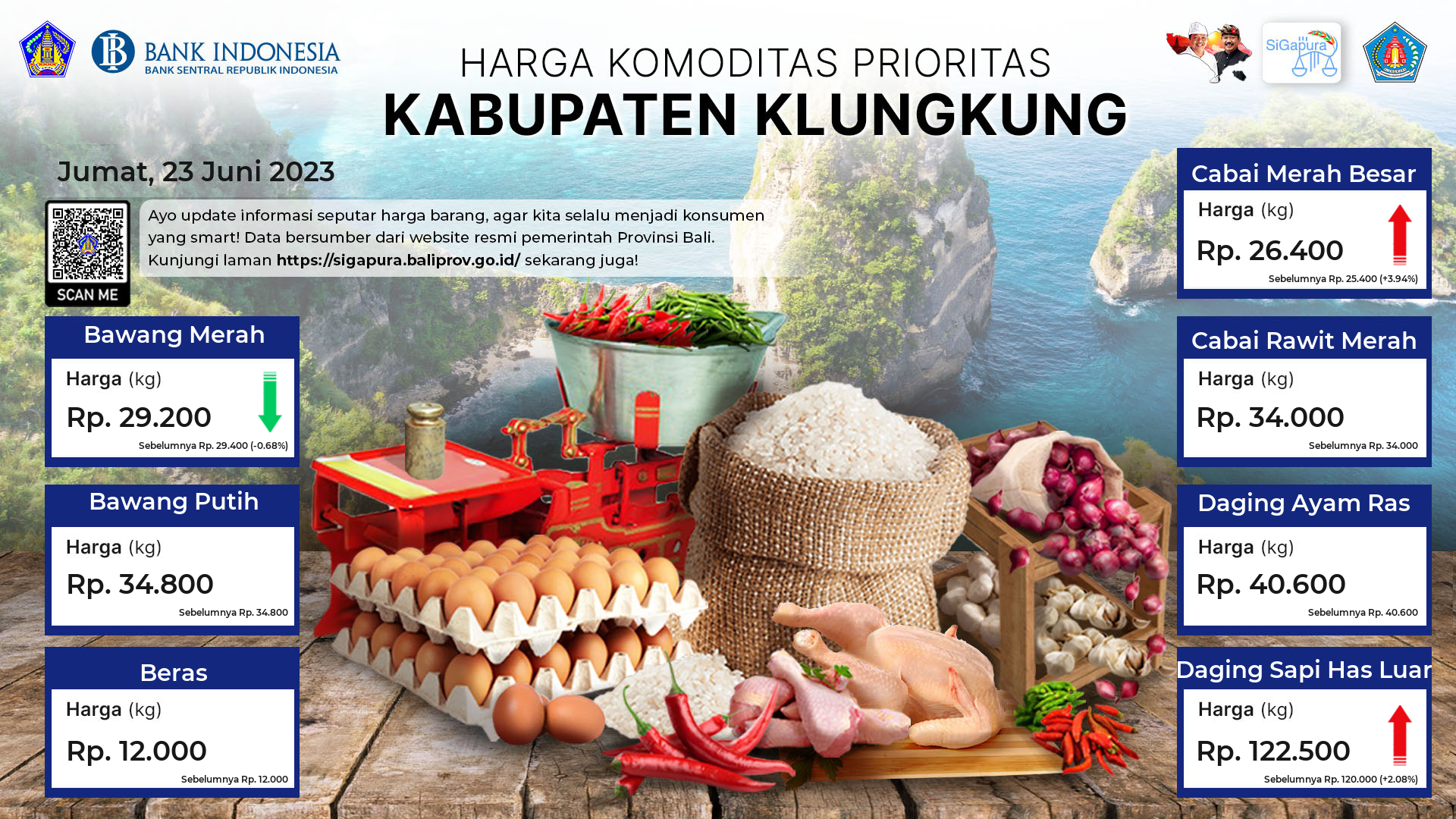 Berdasarkan pemantauan Harga Pangan Rata-Rata 7 (tujuh) Komoditas Prioritas di 60 Pasar seluruh Bali pada tanggal 23 Juni 2023, diperoleh informasi Bawang Merah ada diharga Rp. 28.310, mengalami penurunan sebesar 1.36%. Bawang Putih ada diharga Rp. 34.538, mengalami penurunan sebesar 0.21%. Beras ada diharga Rp. 12.121, mengalami kenaikan sebesar 0.02%. Cabai Merah Besar ada diharga Rp. 27.648, mengalami kenaikan sebesar 2.71%. Cabai Rawit Merah ada diharga Rp. 33.038, mengalami kenaikan sebesar 1.86%. Daging Ayam Ras ada diharga Rp. 42.467, mengalami kenaikan sebesar 0.11%. Daging Sapi Has Luar tetap ada diharga Rp. 119.148.