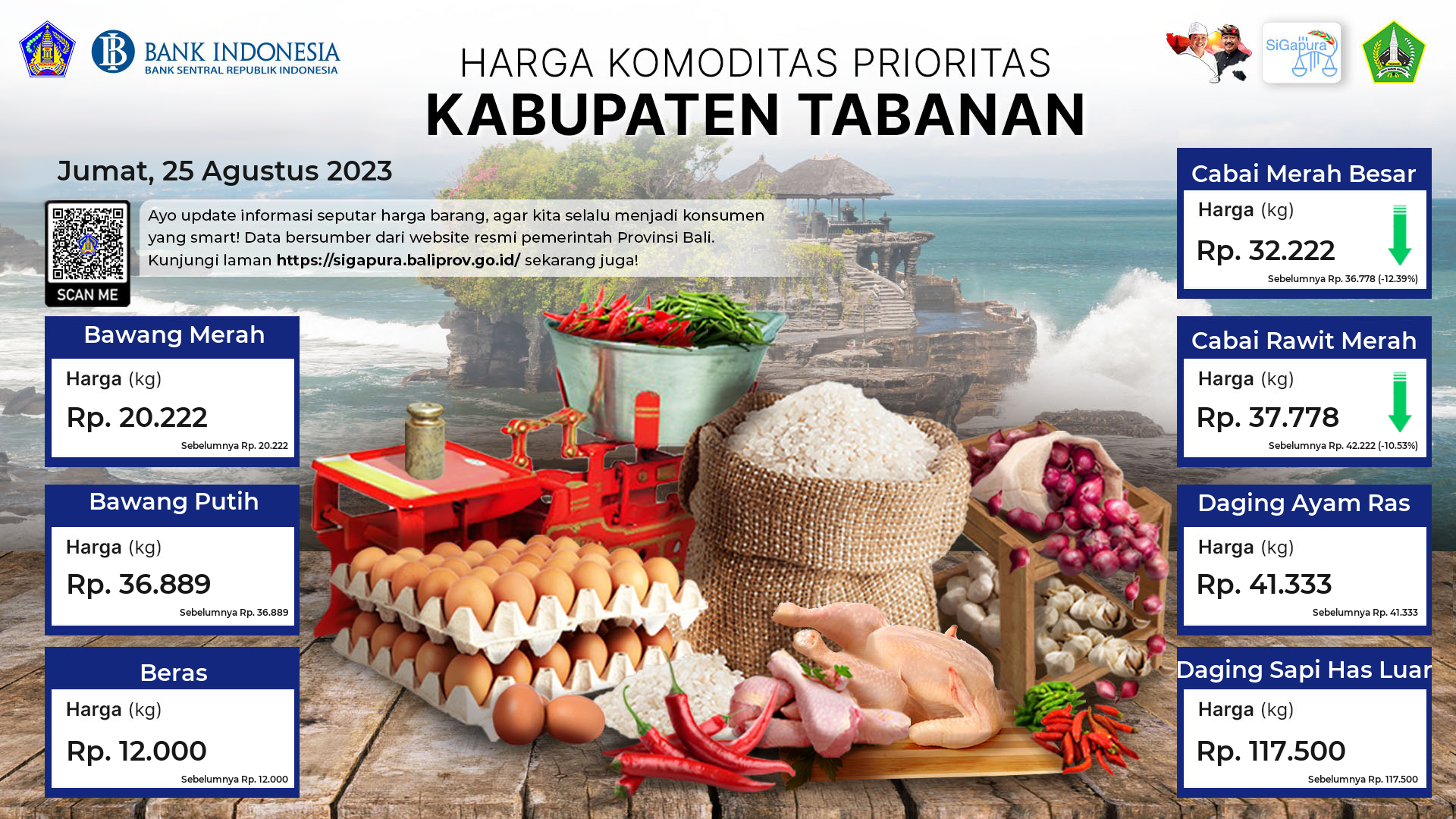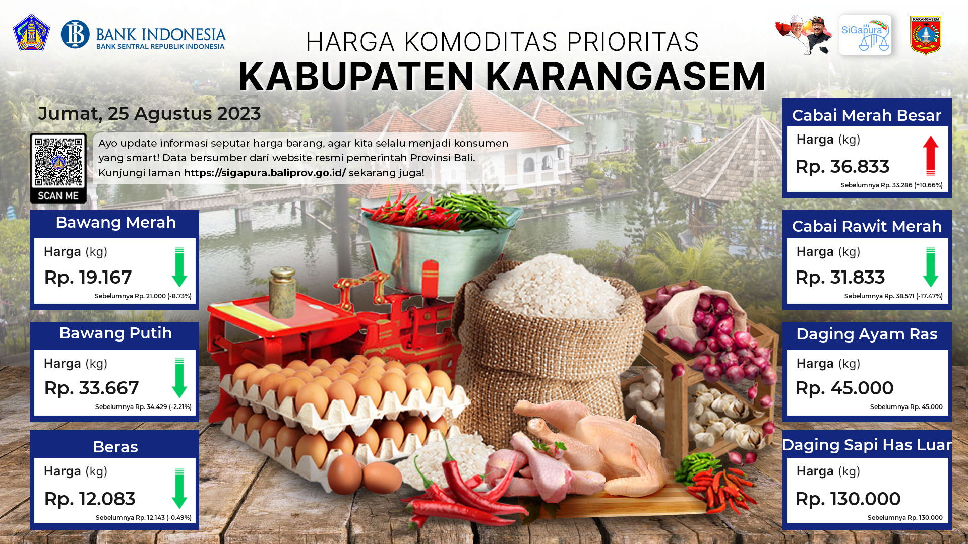 Berdasarkan pemantauan Harga Pangan Rata-Rata 7 (tujuh) Komoditas Prioritas di 60 Pasar seluruh Bali pada tanggal 25 Agustus 2023, diperoleh informasi Bawang Merah ada diharga Rp. 22.058, mengalami penurunan sebesar 1.56%. Bawang Putih ada diharga Rp. 36.771, mengalami penurunan sebesar 0.83%. Beras ada diharga Rp. 12.519, mengalami kenaikan sebesar 0.01%. Cabai Merah Besar ada diharga Rp. 36.136, mengalami kenaikan sebesar 1.32%. Cabai Rawit Merah ada diharga Rp. 36.204, mengalami penurunan sebesar 5.77%. Daging Ayam Ras ada diharga Rp. 41.250, mengalami penurunan sebesar 0.30%. Daging Sapi Has Luar tetap ada diharga Rp. 122.164.