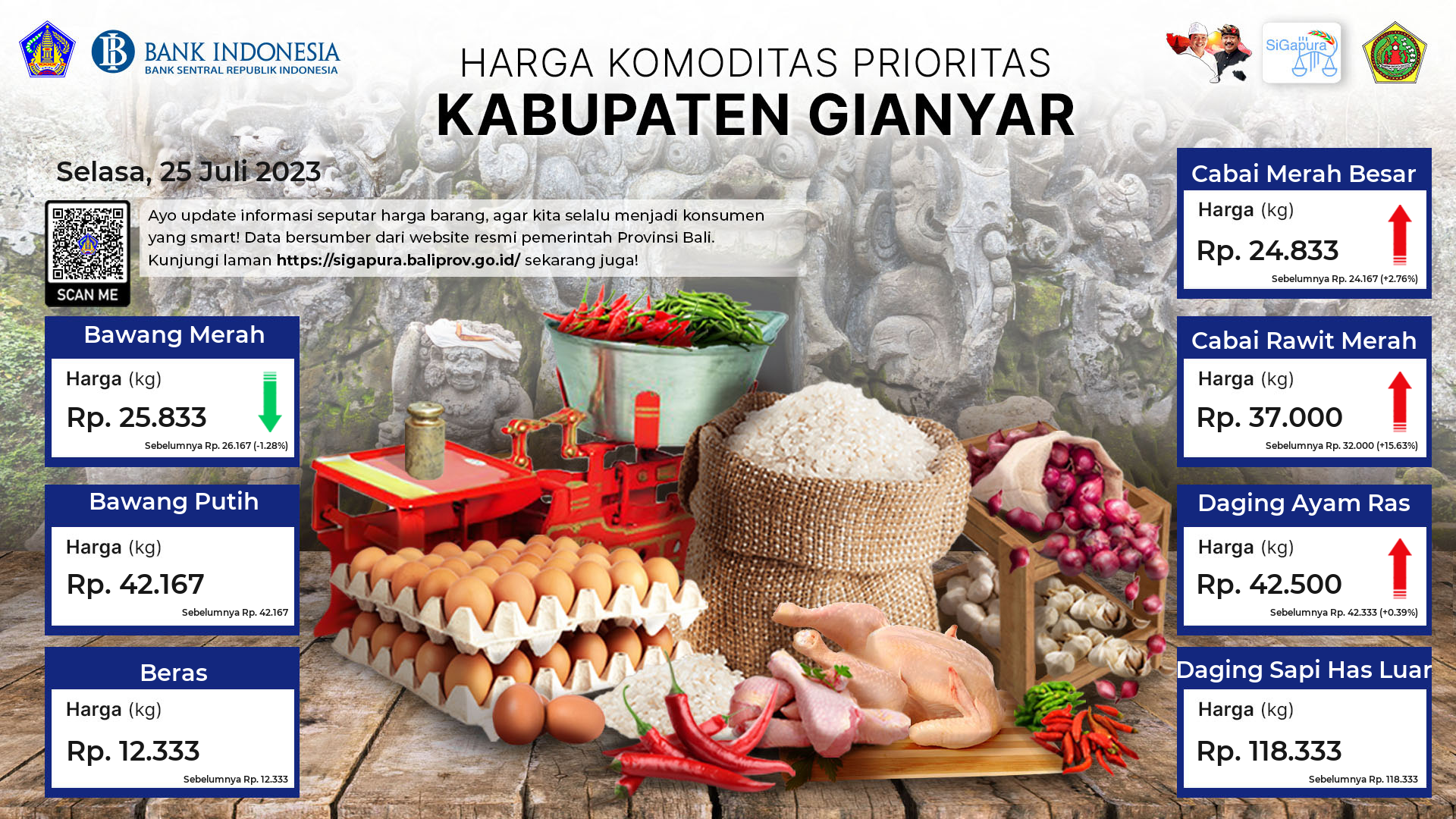 Berdasarkan pemantauan Harga Pangan Rata-Rata 7 (tujuh) Komoditas Prioritas di 60 Pasar seluruh Bali pada tanggal 25 Juli 2023, diperoleh informasi Bawang Merah ada diharga Rp. 25.594, mengalami penurunan sebesar 0.55%. Bawang Putih ada diharga Rp. 41.270, mengalami penurunan sebesar 0.04%. Beras ada diharga Rp. 12.119, mengalami penurunan sebesar 0.17%. Cabai Merah Besar ada diharga Rp. 25.736, mengalami penurunan sebesar 0.43%. Cabai Rawit Merah ada diharga Rp. 35.185, mengalami kenaikan sebesar 11.05%. Daging Ayam Ras ada diharga Rp. 42.447, mengalami penurunan sebesar 0.34%. Daging Sapi Has Luar tetap ada diharga Rp. 121.639.