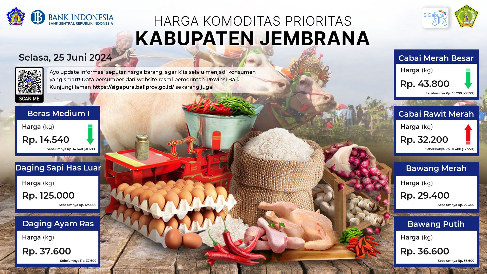 Berdasarkan pemantauan Harga Pangan Rata-Rata 7 (tujuh) Komoditas Prioritas di 60 Pasar seluruh Bali pada tanggal 25 Juni 2024, diperoleh informasi Beras Medium I ada diharga Rp. 14.204, mengalami kenaikan sebesar 1.41%. Daging Sapi Has Luar ada diharga Rp. 119.104, mengalami kenaikan sebesar 0.16%. Daging Ayam Ras ada diharga Rp. 39.911, mengalami kenaikan sebesar 0.45%. Cabai Merah Besar ada diharga Rp. 48.600, mengalami penurunan sebesar 1.84%. Cabai Rawit Merah ada diharga Rp. 31.197, mengalami kenaikan sebesar 2.11%. Bawang Merah ada diharga Rp. 28.707, mengalami penurunan sebesar 0.28%. Bawang Putih ada diharga Rp. 36.261, mengalami penurunan sebesar 0.30%.
