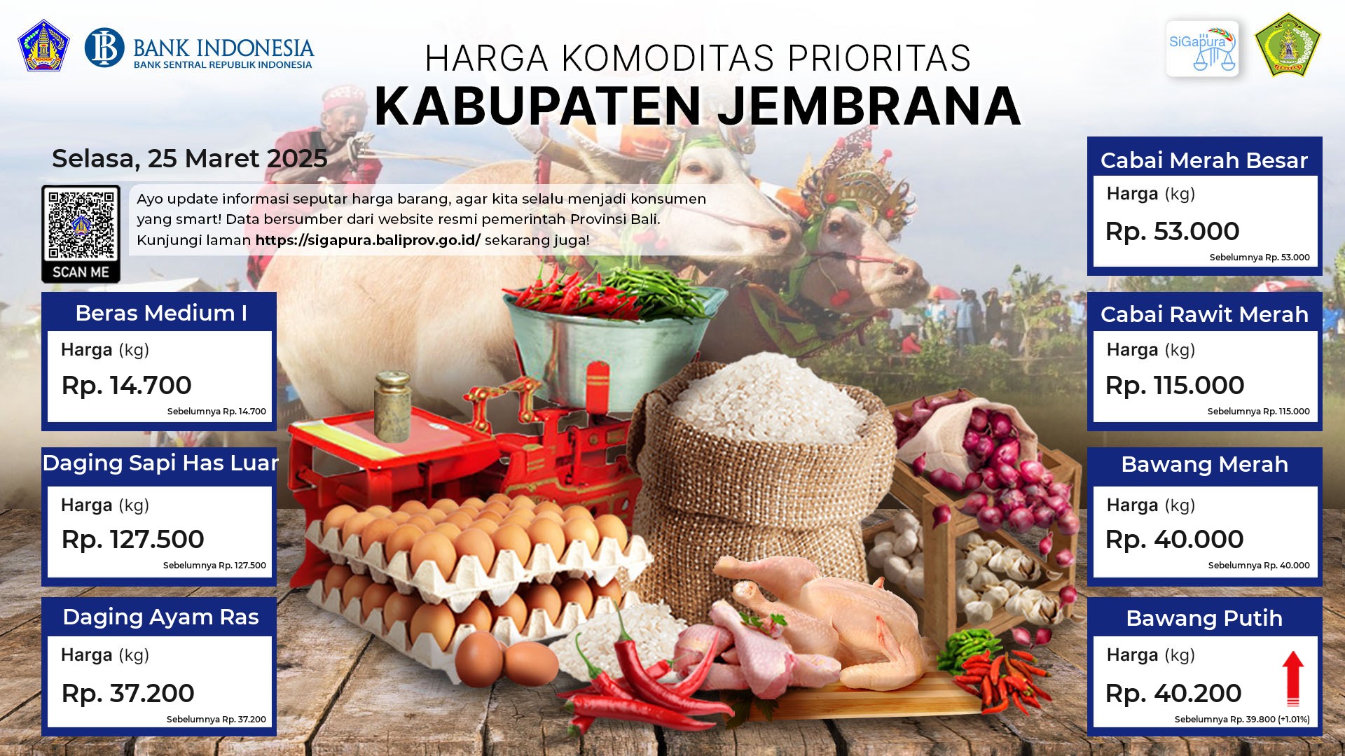 Berdasarkan pemantauan Harga Pangan Rata-Rata 7 (tujuh) Komoditas Prioritas di 60 Pasar seluruh Bali pada tanggal 25 Maret 2025, diperoleh informasi Beras Medium I ada diharga Rp. 14.365, mengalami penurunan sebesar 0.05%. Daging Sapi Has Luar tetap ada diharga Rp. 123.388. Daging Ayam Ras ada diharga Rp. 40.389, mengalami kenaikan sebesar 0.07%. Cabai Merah Besar ada diharga Rp. 50.711, mengalami penurunan sebesar 0.73%. Cabai Rawit Merah ada diharga Rp. 103.297, mengalami penurunan sebesar 0.86%. Bawang Merah ada diharga Rp. 38.617, mengalami penurunan sebesar 0.08%. Bawang Putih ada diharga Rp. 40.267, mengalami penurunan sebesar 0.32%.