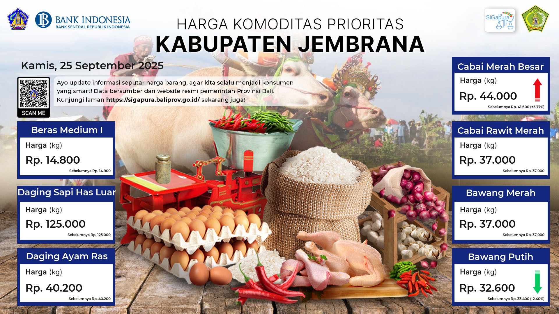 Berdasarkan pemantauan Harga Pangan Rata-Rata 7 (tujuh) Komoditas Prioritas di 60 Pasar seluruh Bali pada tanggal 25 September 2025, diperoleh informasi Beras Medium I ada diharga Rp. 14.801, mengalami kenaikan sebesar 0.21%. Daging Sapi Has Luar ada diharga Rp. 121.446, mengalami kenaikan sebesar 0.54%. Daging Ayam Ras ada diharga Rp. 42.210, mengalami penurunan sebesar 0.20%. Cabai Merah Besar ada diharga Rp. 41.508, mengalami kenaikan sebesar 0.83%. Cabai Rawit Merah ada diharga Rp. 34.603, mengalami penurunan sebesar 0.02%. Bawang Merah ada diharga Rp. 32.356, mengalami penurunan sebesar 0.25%. Bawang Putih ada diharga Rp. 31.911, mengalami penurunan sebesar 0.12%.