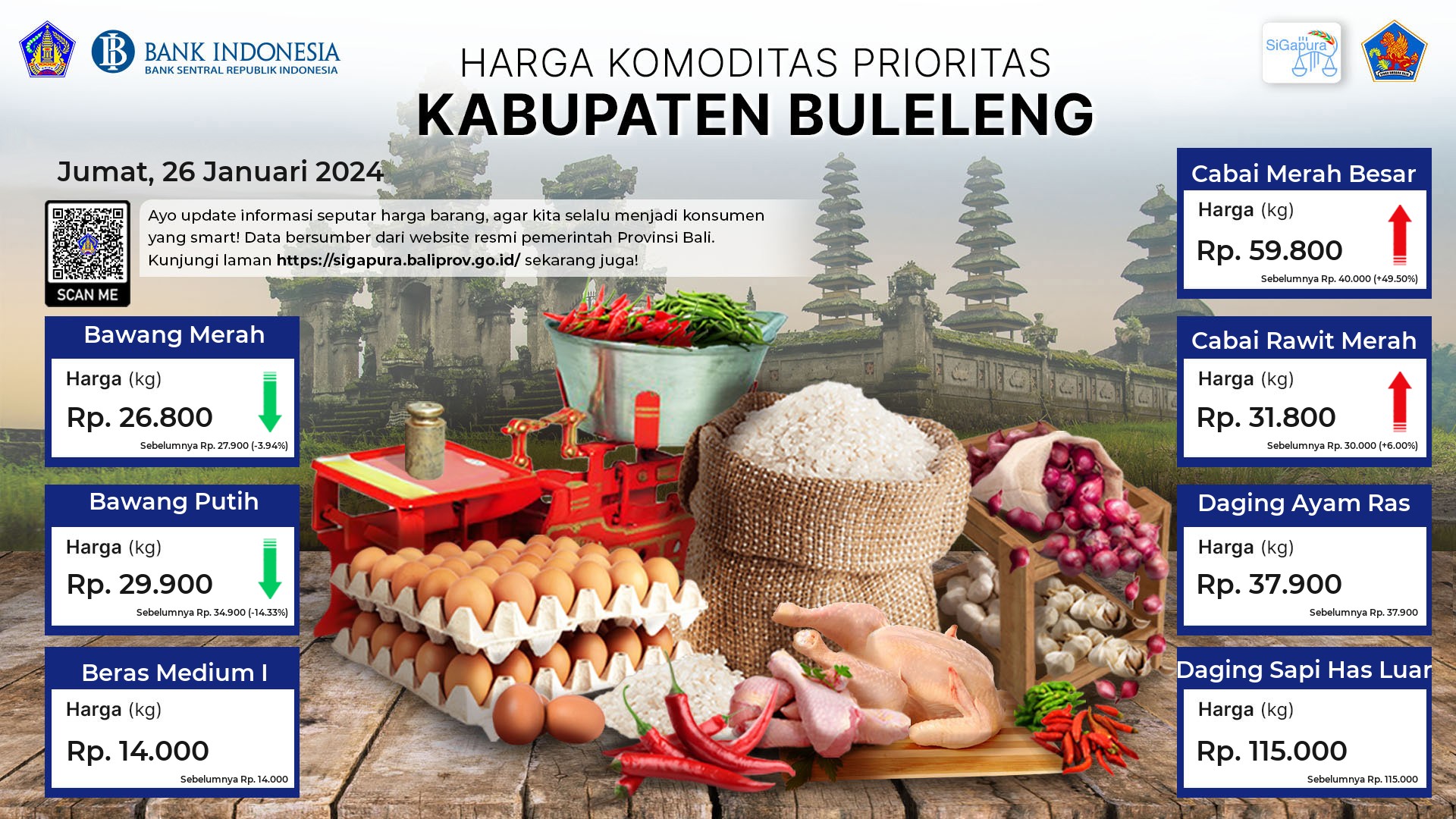 Berdasarkan pemantauan Harga Pangan Rata-Rata 7 (tujuh) Komoditas Prioritas di 60 Pasar seluruh Bali pada tanggal 26 Januari 2024, diperoleh informasi Bawang Merah ada diharga Rp. 31.036, mengalami penurunan sebesar 0.57%. Bawang Putih ada diharga Rp. 34.184, mengalami penurunan sebesar 2.50%. Beras Medium I ada diharga Rp. 14.084, mengalami penurunan sebesar 1.70%. Cabai Merah Besar ada diharga Rp. 64.456, mengalami kenaikan sebesar 9.86%. Cabai Rawit Merah ada diharga Rp. 40.047, mengalami kenaikan sebesar 2.91%. Daging Ayam Ras ada diharga Rp. 38.707, mengalami kenaikan sebesar 0.15%. Daging Sapi Has Luar ada diharga Rp. 116.790, mengalami penurunan sebesar 2.44%.