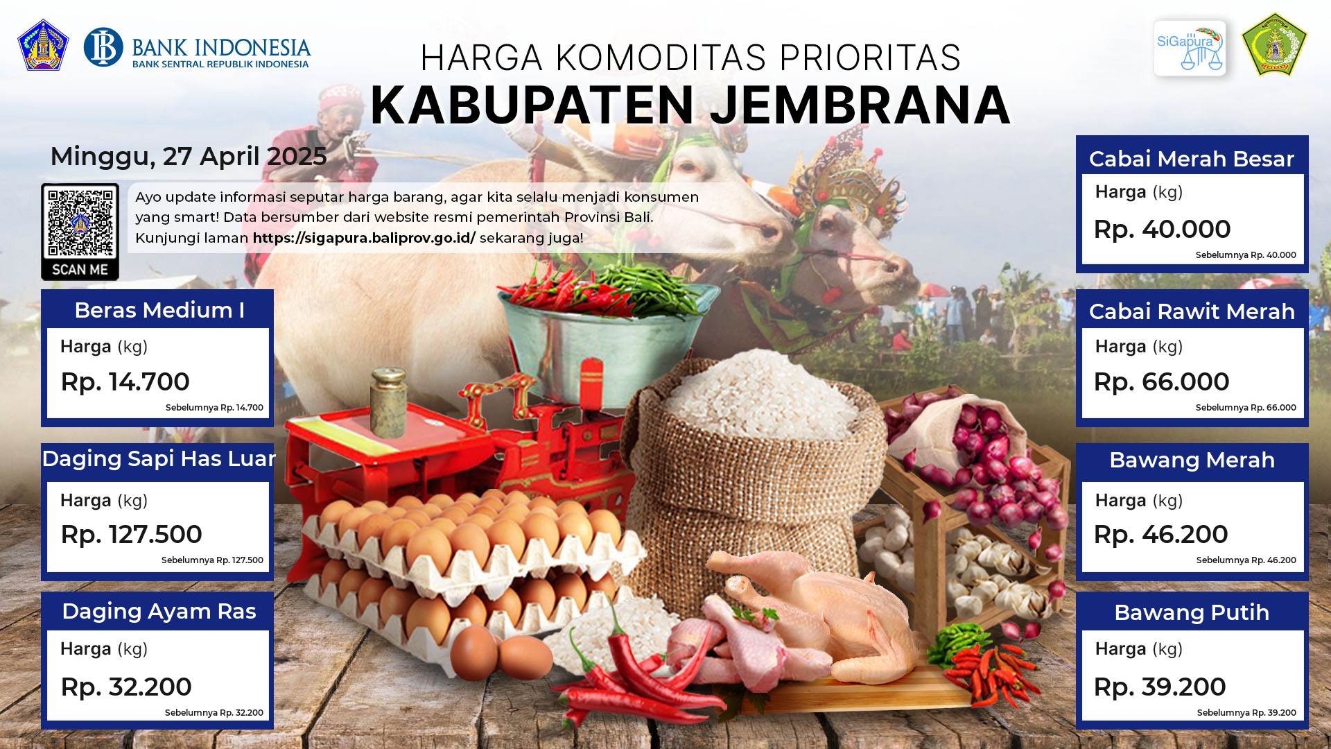 Berdasarkan pemantauan Harga Pangan Rata-Rata 7 (tujuh) Komoditas Prioritas di 60 Pasar seluruh Bali pada tanggal 27 April 2025, diperoleh informasi Beras Medium I tetap ada diharga Rp. 14.408. Daging Sapi Has Luar tetap ada diharga Rp. 122.488. Daging Ayam Ras tetap ada diharga Rp. 38.465. Cabai Merah Besar ada diharga Rp. 38.116, mengalami penurunan sebesar 0.09%. Cabai Rawit Merah ada diharga Rp. 63.315, mengalami penurunan sebesar 0.11%. Bawang Merah ada diharga Rp. 47.508, mengalami penurunan sebesar 0.67%. Bawang Putih ada diharga Rp. 41.802, mengalami penurunan sebesar 0.64%.