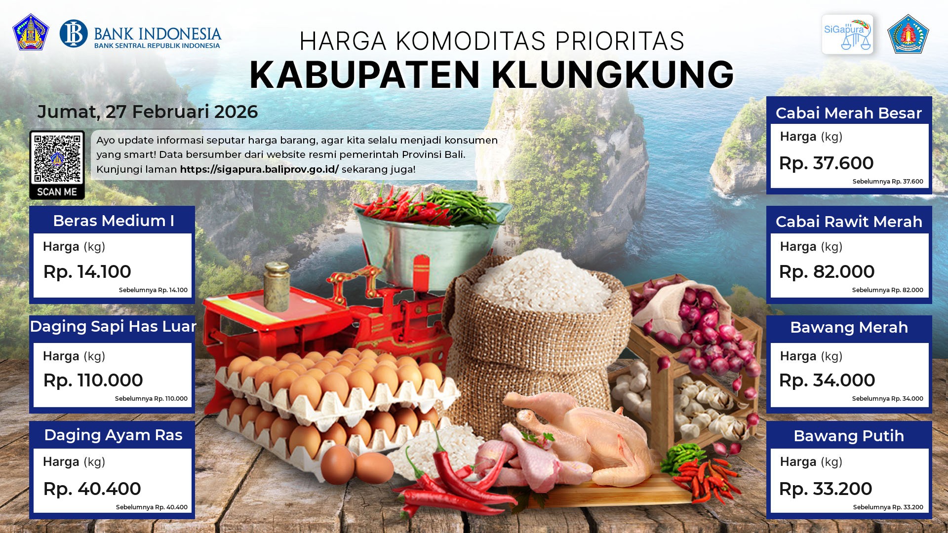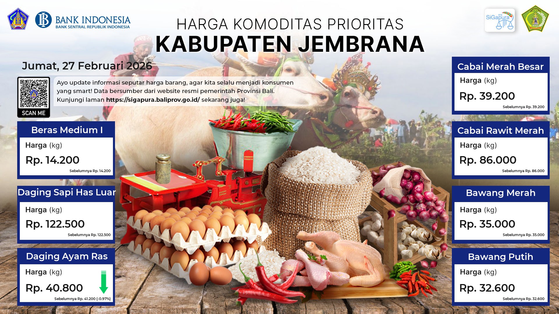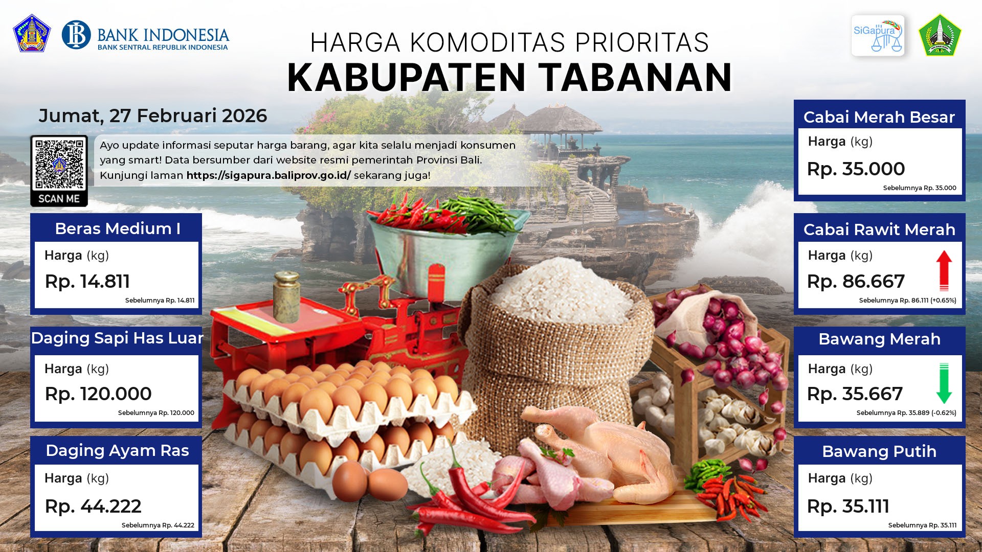 Berdasarkan pemantauan Harga Pangan Rata-Rata 7 (tujuh) Komoditas Prioritas di 60 Pasar seluruh Bali pada tanggal 27 Februari 2026, diperoleh informasi Beras Medium I ada diharga Rp. 14.470, mengalami penurunan sebesar 0.07%. Daging Sapi Has Luar tetap ada diharga Rp. 123.698. Daging Ayam Ras ada diharga Rp. 43.026, mengalami penurunan sebesar 0.66%. Cabai Merah Besar ada diharga Rp. 39.292, mengalami kenaikan sebesar 0.67%. Cabai Rawit Merah ada diharga Rp. 85.592, mengalami penurunan sebesar 1.44%. Bawang Merah ada diharga Rp. 36.361, mengalami kenaikan sebesar 0.69%. Bawang Putih ada diharga Rp. 34.296, mengalami penurunan sebesar 0.73%.