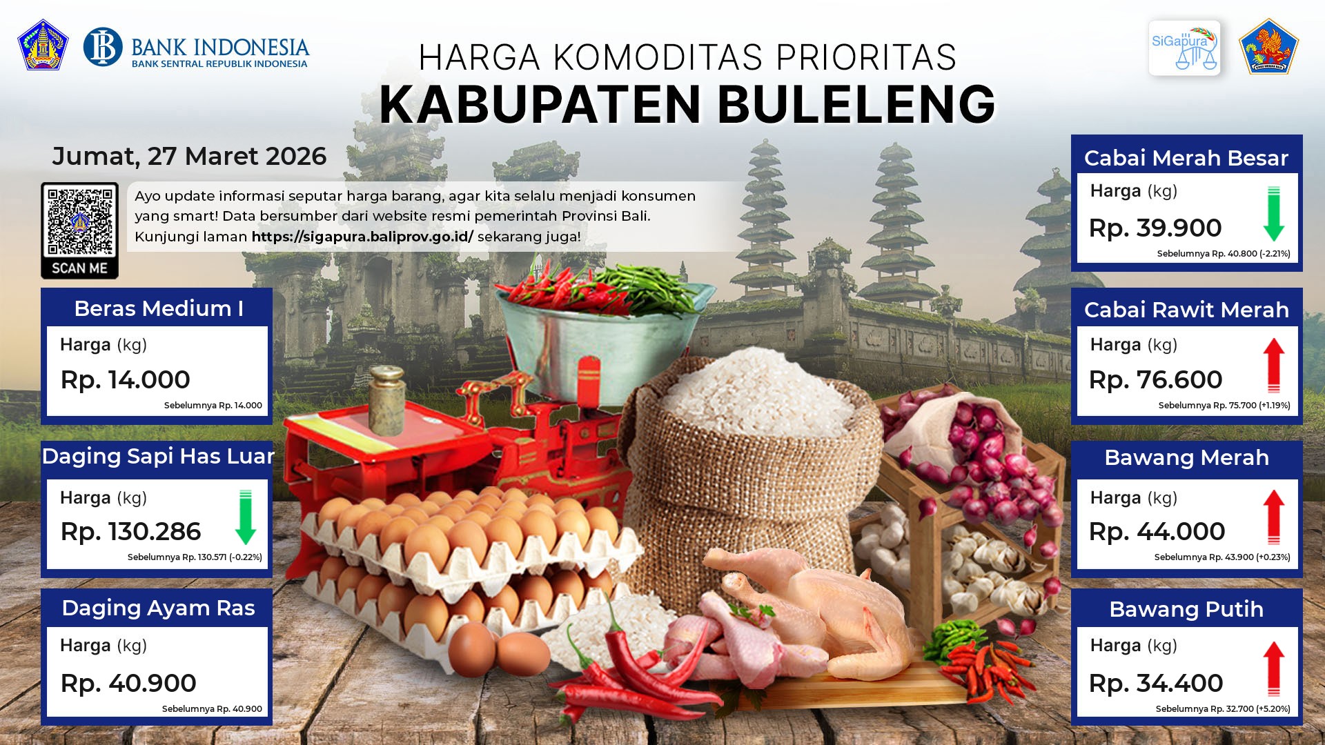 Berdasarkan pemantauan Harga Pangan Rata-Rata 7 (tujuh) Komoditas Prioritas di 60 Pasar seluruh Bali pada tanggal 27 Maret 2026, diperoleh informasi Beras Medium I ada diharga Rp. 14.383, mengalami kenaikan sebesar 0.19%. Daging Sapi Has Luar ada diharga Rp. 124.406, mengalami penurunan sebesar 0.07%. Daging Ayam Ras ada diharga Rp. 7.407.596.627, mengalami kenaikan sebesar 17662687.92%. Cabai Merah Besar ada diharga Rp. 40.660, mengalami kenaikan sebesar 0.17%. Cabai Rawit Merah ada diharga Rp. 74.899, mengalami penurunan sebesar 6.33%. Bawang Merah ada diharga Rp. 39.937, mengalami penurunan sebesar 3.14%. Bawang Putih ada diharga Rp. 33.806, mengalami penurunan sebesar 0.48%.