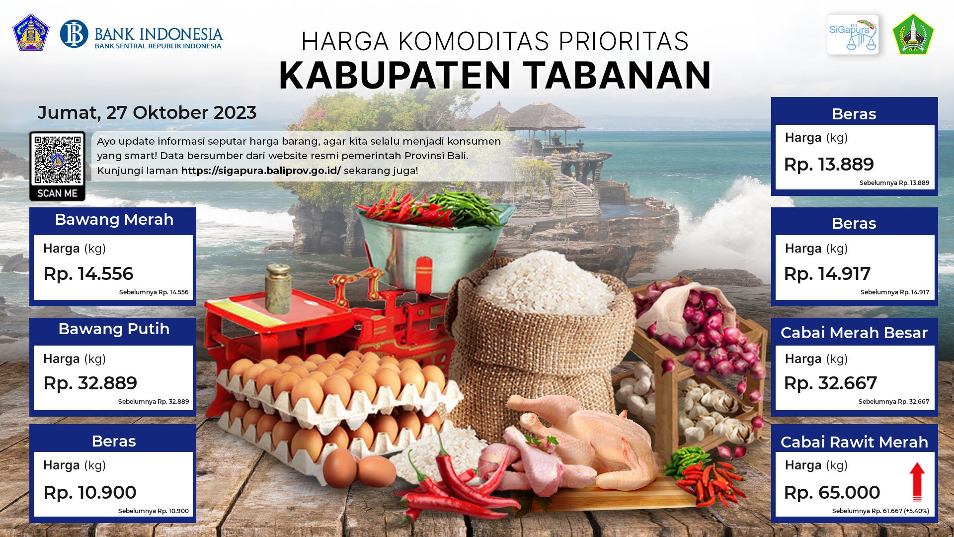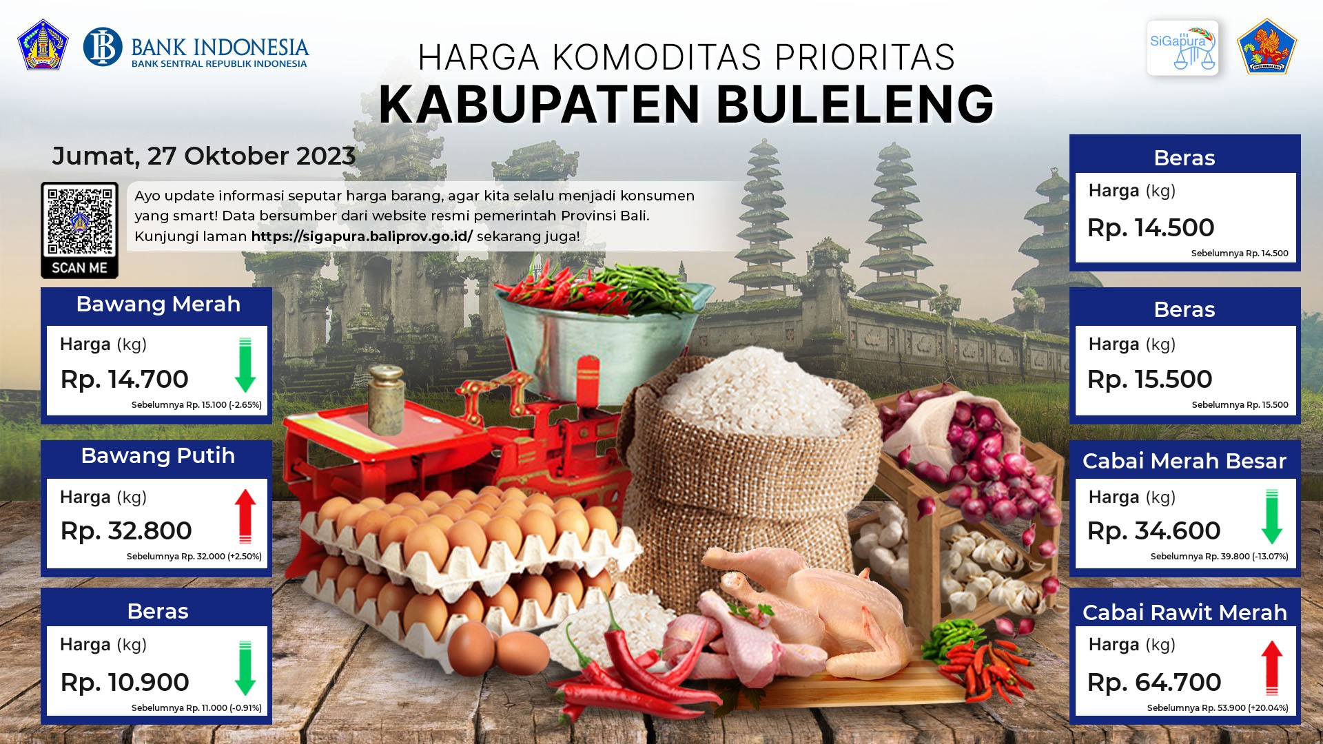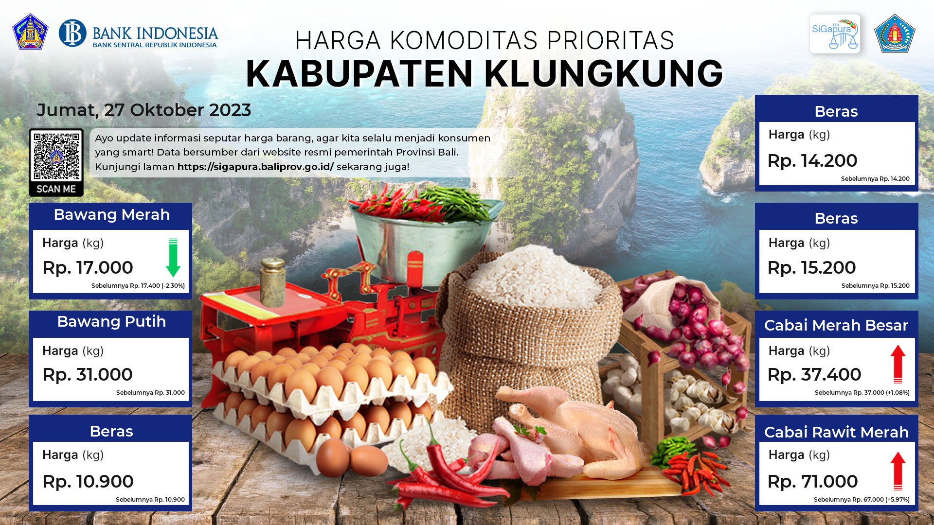 Berdasarkan pemantauan Harga Pangan Rata-Rata 7 (tujuh) Komoditas Prioritas di 60 Pasar seluruh Bali pada tanggal 27 Oktober 2023, diperoleh informasi Bawang Merah ada diharga Rp. 16.094, mengalami penurunan sebesar 3.01%. Bawang Putih ada diharga Rp. 32.474, mengalami kenaikan sebesar 0.59%. Beras ada diharga Rp. 10.894, mengalami penurunan sebesar 0.27%. Beras ada diharga Rp. 13.952, mengalami kenaikan sebesar 0.04%. Beras ada diharga Rp. 15.085, mengalami kenaikan sebesar 0.29%. Cabai Merah Besar ada diharga Rp. 34.500, mengalami penurunan sebesar 2.50%. Cabai Rawit Merah ada diharga Rp. 63.836, mengalami kenaikan sebesar 6.09%. Daging Ayam Ras ada diharga Rp. 39.218, mengalami penurunan sebesar 0.43%. Daging Sapi Has Luar ada diharga Rp. 116.452, mengalami penurunan sebesar 2.57%.