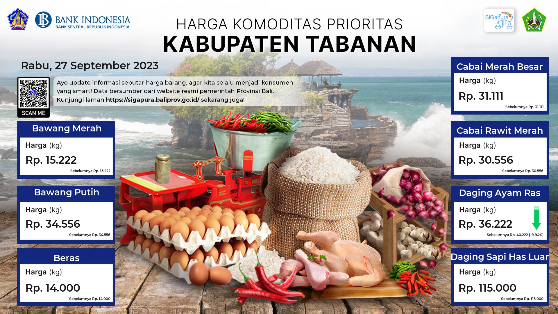 Berdasarkan pemantauan Harga Pangan Rata-Rata 7 (tujuh) Komoditas Prioritas di 60 Pasar seluruh Bali pada tanggal 27 September 2023, diperoleh informasi Bawang Merah ada diharga Rp. 17.902, mengalami kenaikan sebesar 2.93%. Bawang Putih ada diharga Rp. 33.424, mengalami penurunan sebesar 1.87%. Beras ada diharga Rp. 13.878, mengalami kenaikan sebesar 0.84%. Cabai Merah Besar ada diharga Rp. 33.504, mengalami kenaikan sebesar 0.34%. Cabai Rawit Merah ada diharga Rp. 27.729, mengalami penurunan sebesar 1.73%. Daging Ayam Ras ada diharga Rp. 38.370, mengalami penurunan sebesar 1.96%. Daging Sapi Has Luar ada diharga Rp. 120.237, mengalami kenaikan sebesar 0.64%.