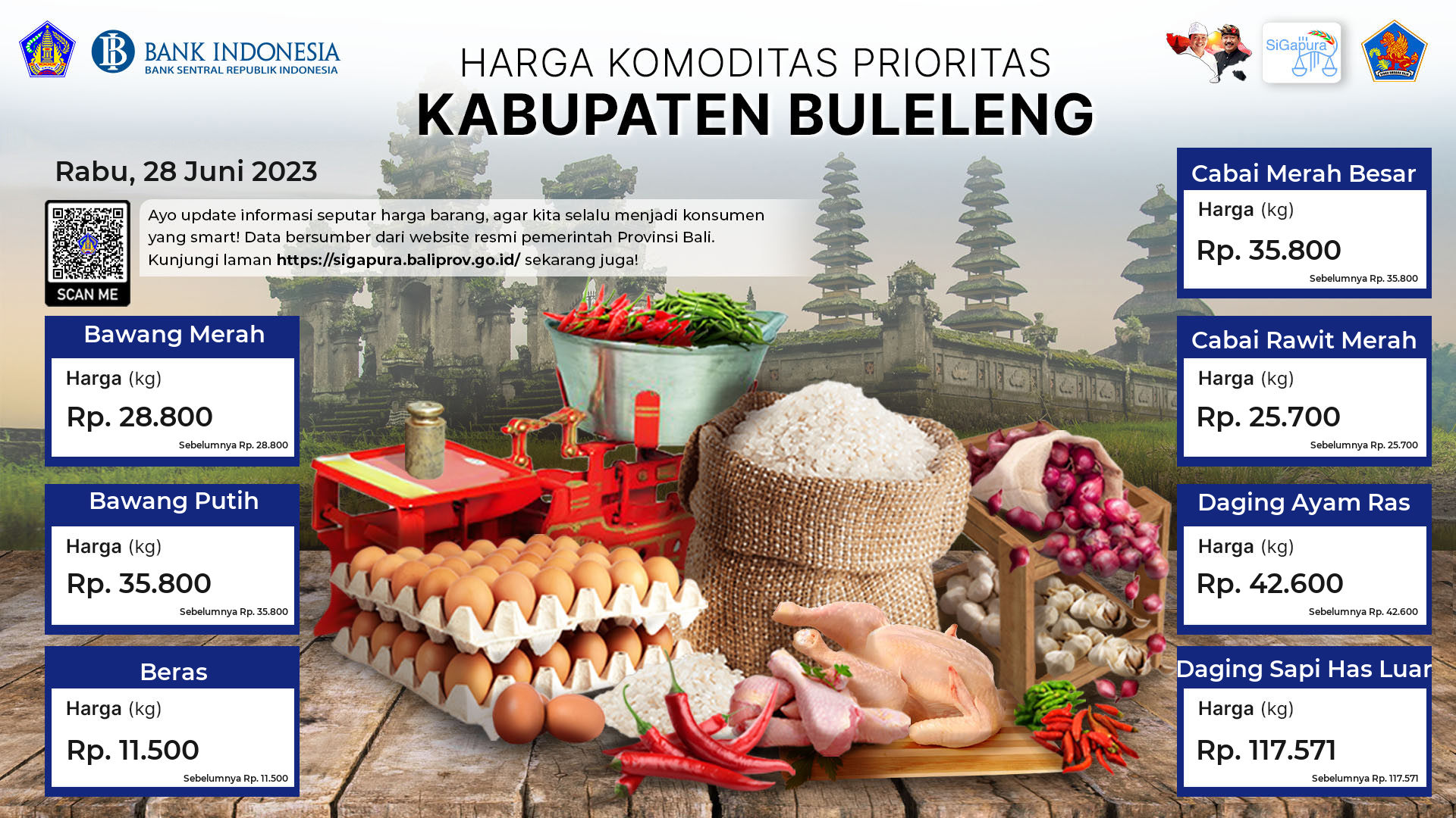 Berdasarkan pemantauan Harga Pangan Rata-Rata 7 (tujuh) Komoditas Prioritas di 60 Pasar seluruh Bali pada tanggal 28 Juni 2023, diperoleh informasi Bawang Merah tetap ada diharga Rp. 28.935. Bawang Putih ada diharga Rp. 34.871, mengalami penurunan sebesar 0.11%. Beras tetap ada diharga Rp. 12.121. Cabai Merah Besar tetap ada diharga Rp. 31.977. Cabai Rawit Merah tetap ada diharga Rp. 31.467. Daging Ayam Ras tetap ada diharga Rp. 42.558. Daging Sapi Has Luar tetap ada diharga Rp. 120.017.