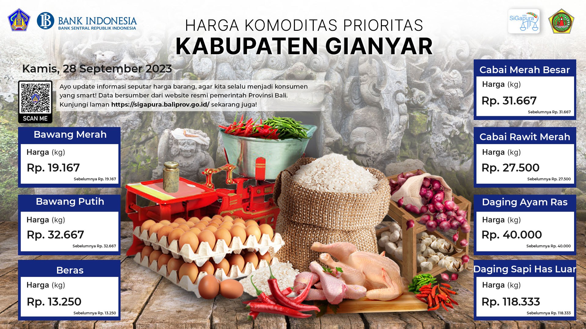 Berdasarkan pemantauan Harga Pangan Rata-Rata 7 (tujuh) Komoditas Prioritas di 60 Pasar seluruh Bali pada tanggal 28 September 2023, diperoleh informasi Bawang Merah tetap ada diharga Rp. 17.902. Bawang Putih ada diharga Rp. 33.406, mengalami penurunan sebesar 0.05%. Beras ada diharga Rp. 13.870, mengalami penurunan sebesar 0.06%. Cabai Merah Besar tetap ada diharga Rp. 33.504. Cabai Rawit Merah tetap ada diharga Rp. 27.729. Daging Ayam Ras tetap ada diharga Rp. 38.370. Daging Sapi Has Luar tetap ada diharga Rp. 120.237.