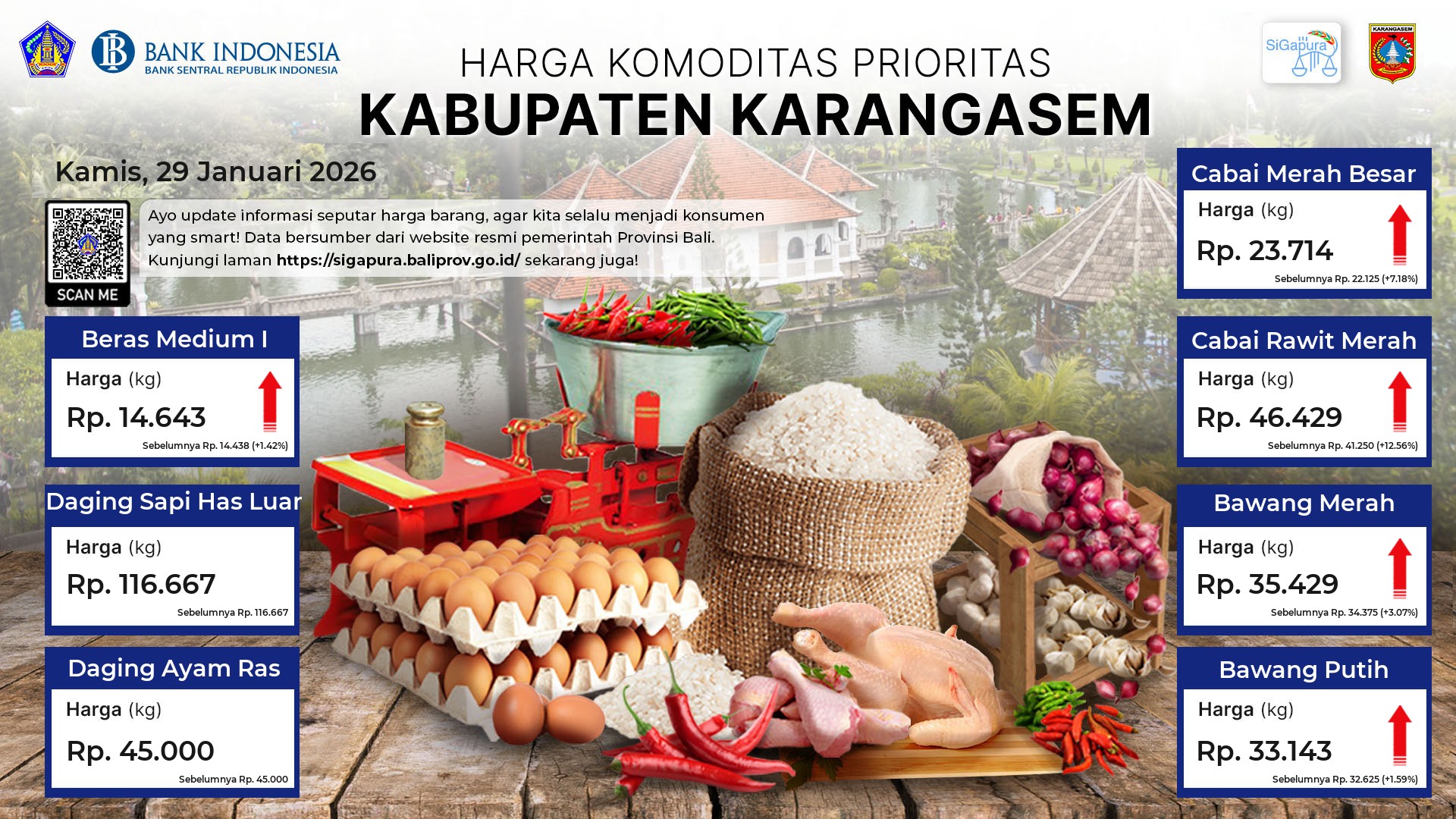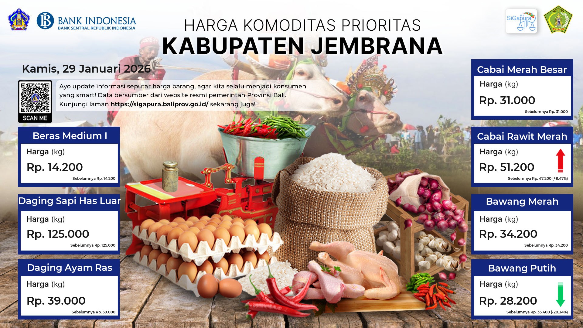 Berdasarkan pemantauan Harga Pangan Rata-Rata 7 (tujuh) Komoditas Prioritas di 60 Pasar seluruh Bali pada tanggal 29 Januari 2026, diperoleh informasi Beras Medium I ada diharga Rp. 14.530, mengalami kenaikan sebesar 0.17%. Daging Sapi Has Luar tetap ada diharga Rp. 121.832. Daging Ayam Ras ada diharga Rp. 41.340, mengalami penurunan sebesar 0.04%. Cabai Merah Besar ada diharga Rp. 26.463, mengalami kenaikan sebesar 2.42%. Cabai Rawit Merah ada diharga Rp. 51.342, mengalami kenaikan sebesar 5.54%. Bawang Merah ada diharga Rp. 34.491, mengalami kenaikan sebesar 0.79%. Bawang Putih ada diharga Rp. 33.975, mengalami penurunan sebesar 1.12%.