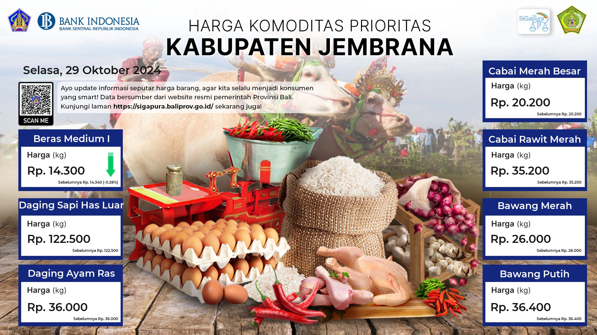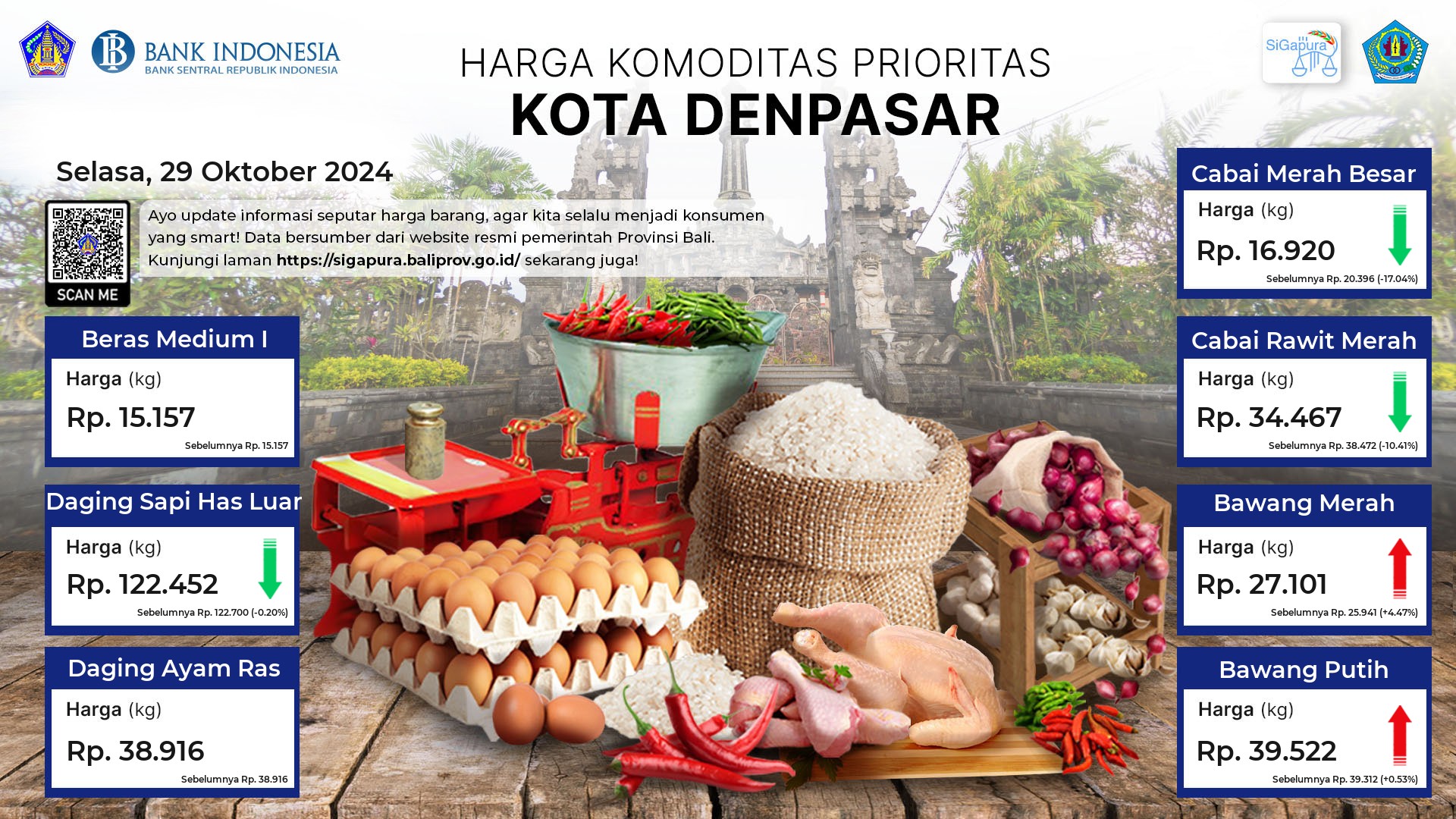 Berdasarkan pemantauan Harga Pangan Rata-Rata 7 (tujuh) Komoditas Prioritas di 60 Pasar seluruh Bali pada tanggal 29 Oktober 2024, diperoleh informasi Beras Medium I ada diharga Rp. 14.349, mengalami penurunan sebesar 0.17%. Daging Sapi Has Luar ada diharga Rp. 117.690, mengalami penurunan sebesar 0.04%. Daging Ayam Ras ada diharga Rp. 39.675, mengalami kenaikan sebesar 0.38%. Cabai Merah Besar ada diharga Rp. 17.170, mengalami kenaikan sebesar 0.21%. Cabai Rawit Merah ada diharga Rp. 35.950, mengalami penurunan sebesar 1.30%. Bawang Merah ada diharga Rp. 29.480, mengalami kenaikan sebesar 15.99%. Bawang Putih ada diharga Rp. 36.543, mengalami kenaikan sebesar 0.33%.