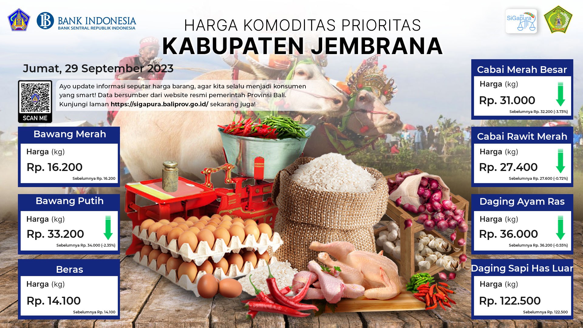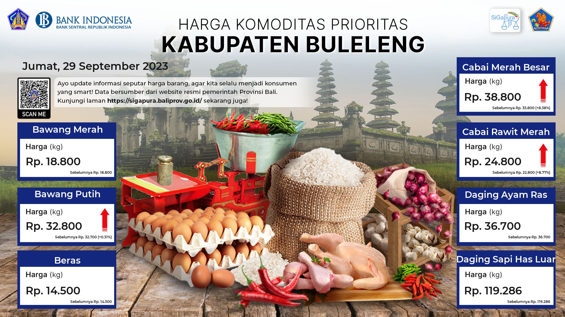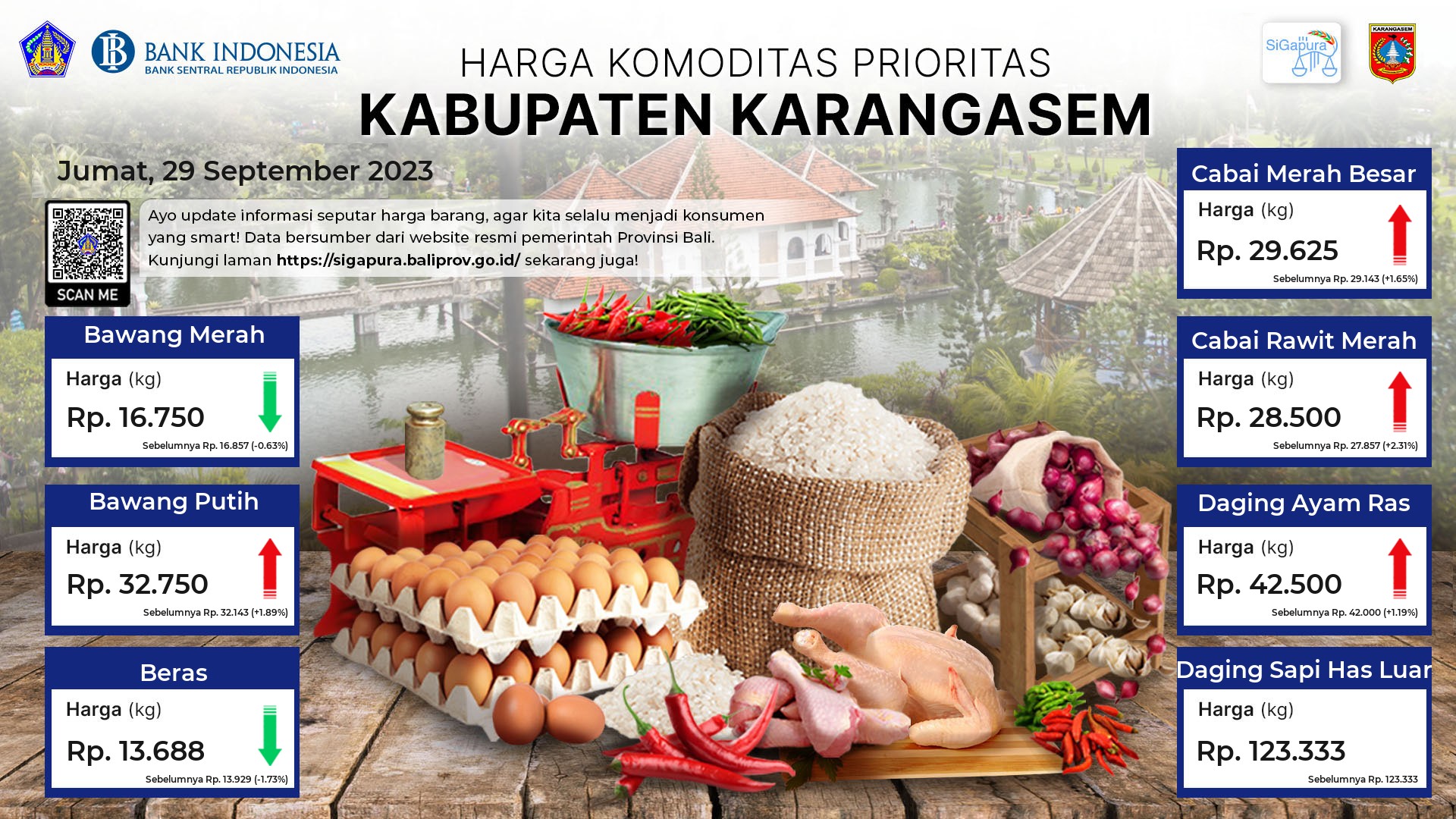 Berdasarkan pemantauan Harga Pangan Rata-Rata 7 (tujuh) Komoditas Prioritas di 60 Pasar seluruh Bali pada tanggal 29 September 2023, diperoleh informasi Bawang Merah ada diharga Rp. 17.855, mengalami penurunan sebesar 0.26%. Bawang Putih ada diharga Rp. 33.445, mengalami kenaikan sebesar 0.12%. Beras ada diharga Rp. 13.837, mengalami penurunan sebesar 0.24%. Cabai Merah Besar ada diharga Rp. 34.071, mengalami kenaikan sebesar 1.69%. Cabai Rawit Merah ada diharga Rp. 28.443, mengalami kenaikan sebesar 2.57%. Daging Ayam Ras ada diharga Rp. 39.048, mengalami kenaikan sebesar 1.77%. Daging Sapi Has Luar tetap ada diharga Rp. 120.237.