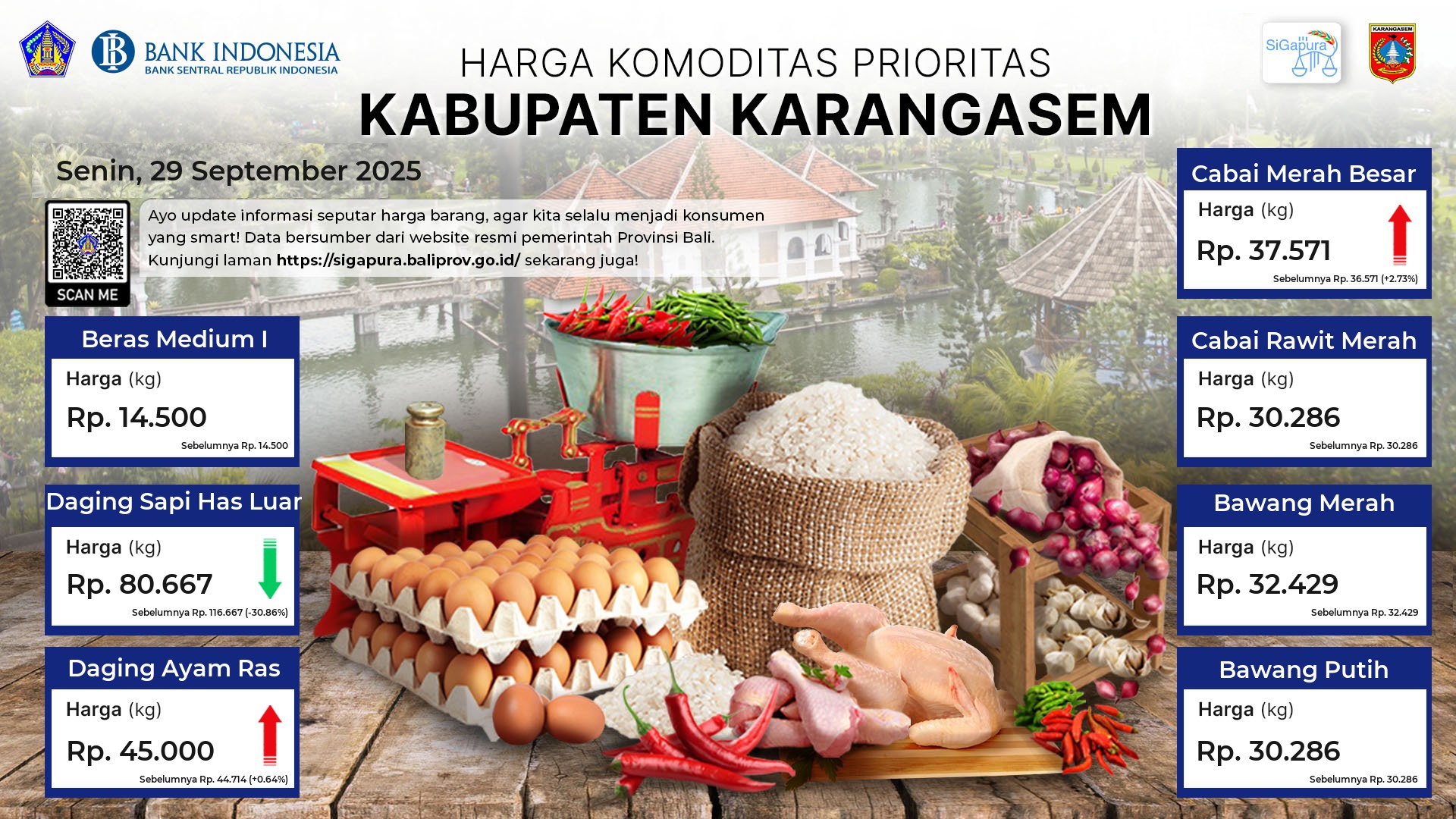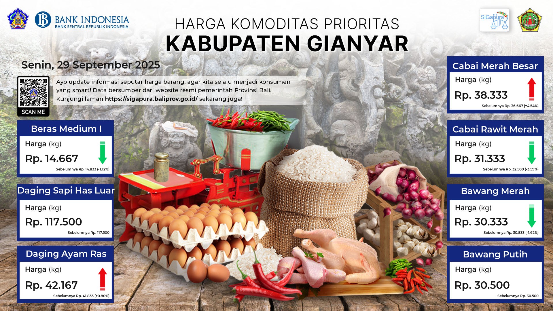 Berdasarkan pemantauan Harga Pangan Rata-Rata 7 (tujuh) Komoditas Prioritas di 60 Pasar seluruh Bali pada tanggal 29 September 2025, diperoleh informasi Beras Medium I ada diharga Rp. 14.766, mengalami penurunan sebesar 0.11%. Daging Sapi Has Luar ada diharga Rp. 116.268, mengalami penurunan sebesar 4.43%. Daging Ayam Ras ada diharga Rp. 42.531, mengalami kenaikan sebesar 0.42%. Cabai Merah Besar ada diharga Rp. 43.270, mengalami kenaikan sebesar 3.23%. Cabai Rawit Merah ada diharga Rp. 34.049, mengalami penurunan sebesar 0.99%. Bawang Merah ada diharga Rp. 32.231, mengalami penurunan sebesar 0.82%. Bawang Putih ada diharga Rp. 32.090, mengalami kenaikan sebesar 0.33%.