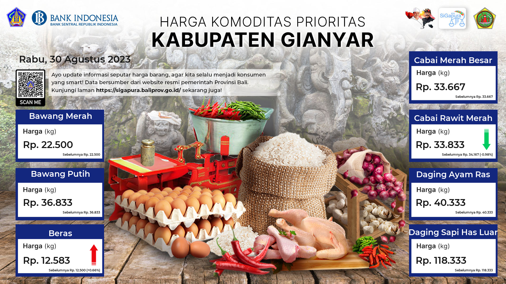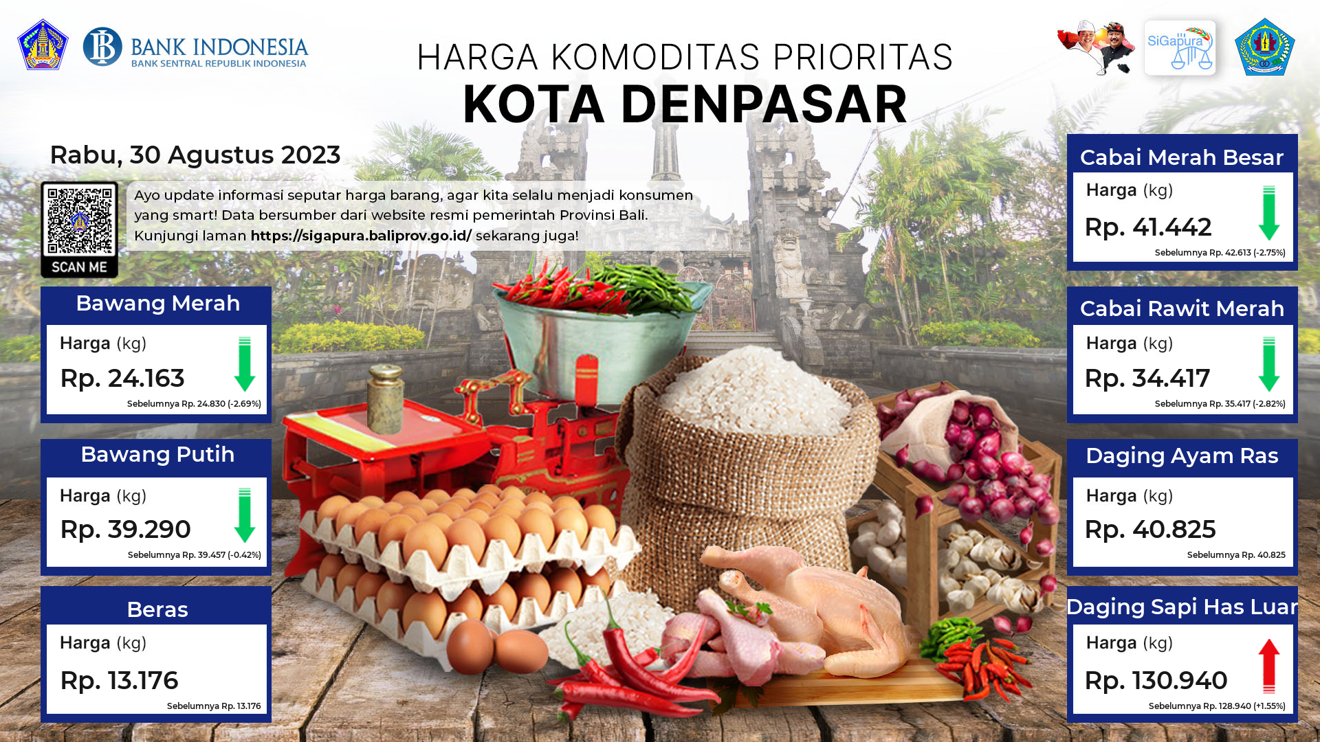 Berdasarkan pemantauan Harga Pangan Rata-Rata 7 (tujuh) Komoditas Prioritas di 60 Pasar seluruh Bali pada tanggal 30 Agustus 2023, diperoleh informasi Bawang Merah ada diharga Rp. 20.807, mengalami kenaikan sebesar 0.34%. Bawang Putih ada diharga Rp. 35.662, mengalami penurunan sebesar 1.58%. Beras ada diharga Rp. 12.857, mengalami kenaikan sebesar 0.07%. Cabai Merah Besar ada diharga Rp. 39.976, mengalami penurunan sebesar 0.90%. Cabai Rawit Merah ada diharga Rp. 29.325, mengalami penurunan sebesar 7.49%. Daging Ayam Ras ada diharga Rp. 39.380, mengalami penurunan sebesar 2.65%. Daging Sapi Has Luar ada diharga Rp. 122.254, mengalami kenaikan sebesar 0.24%.