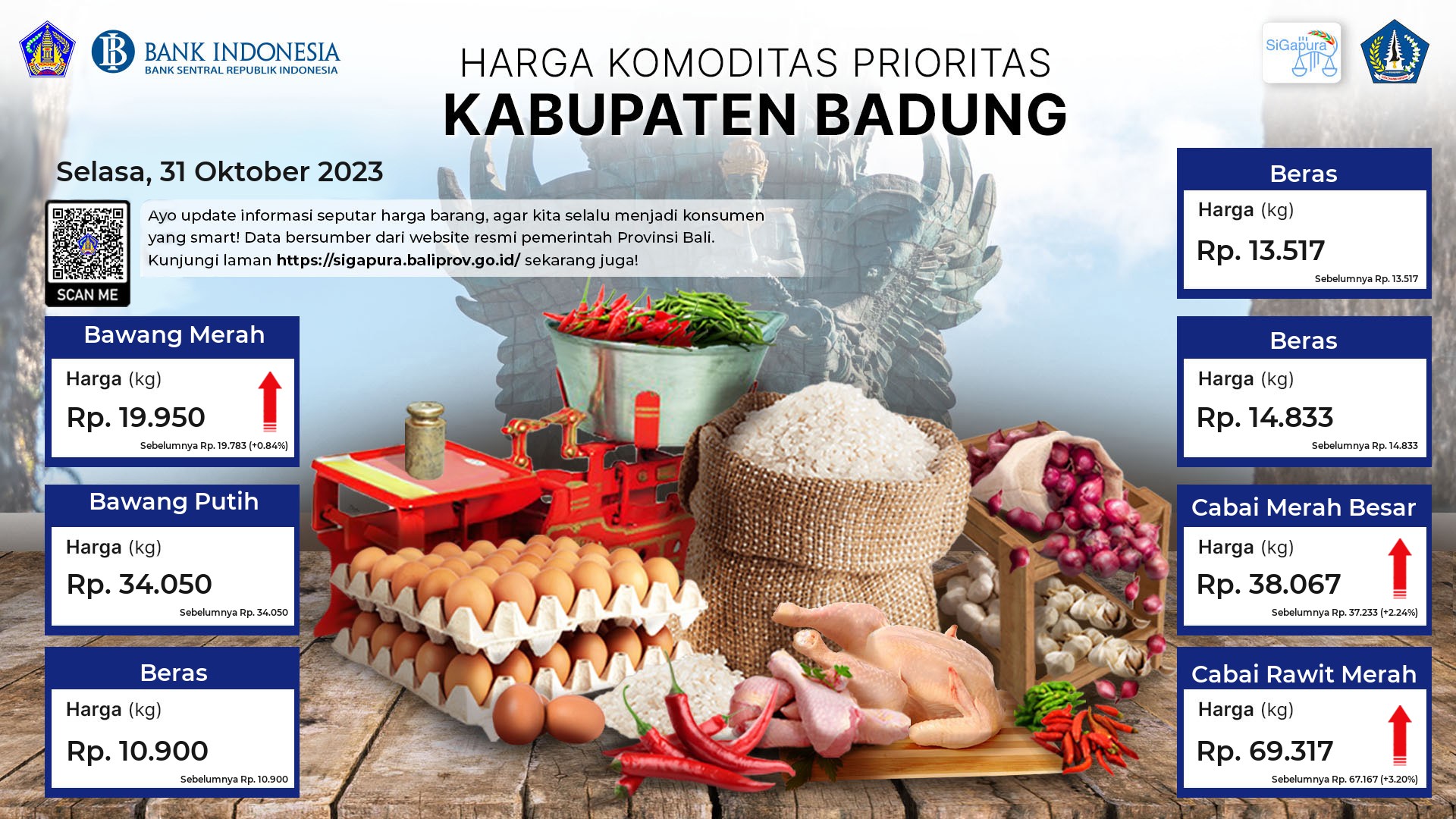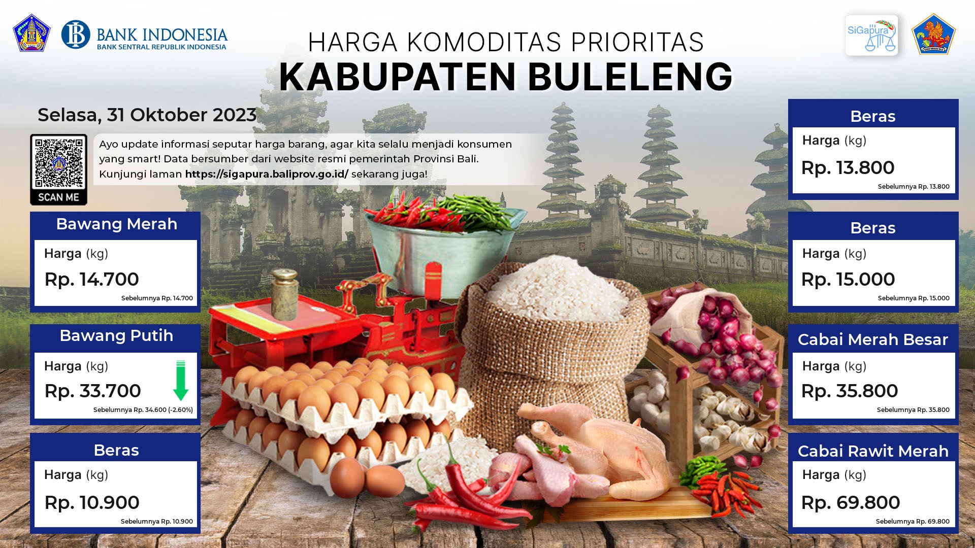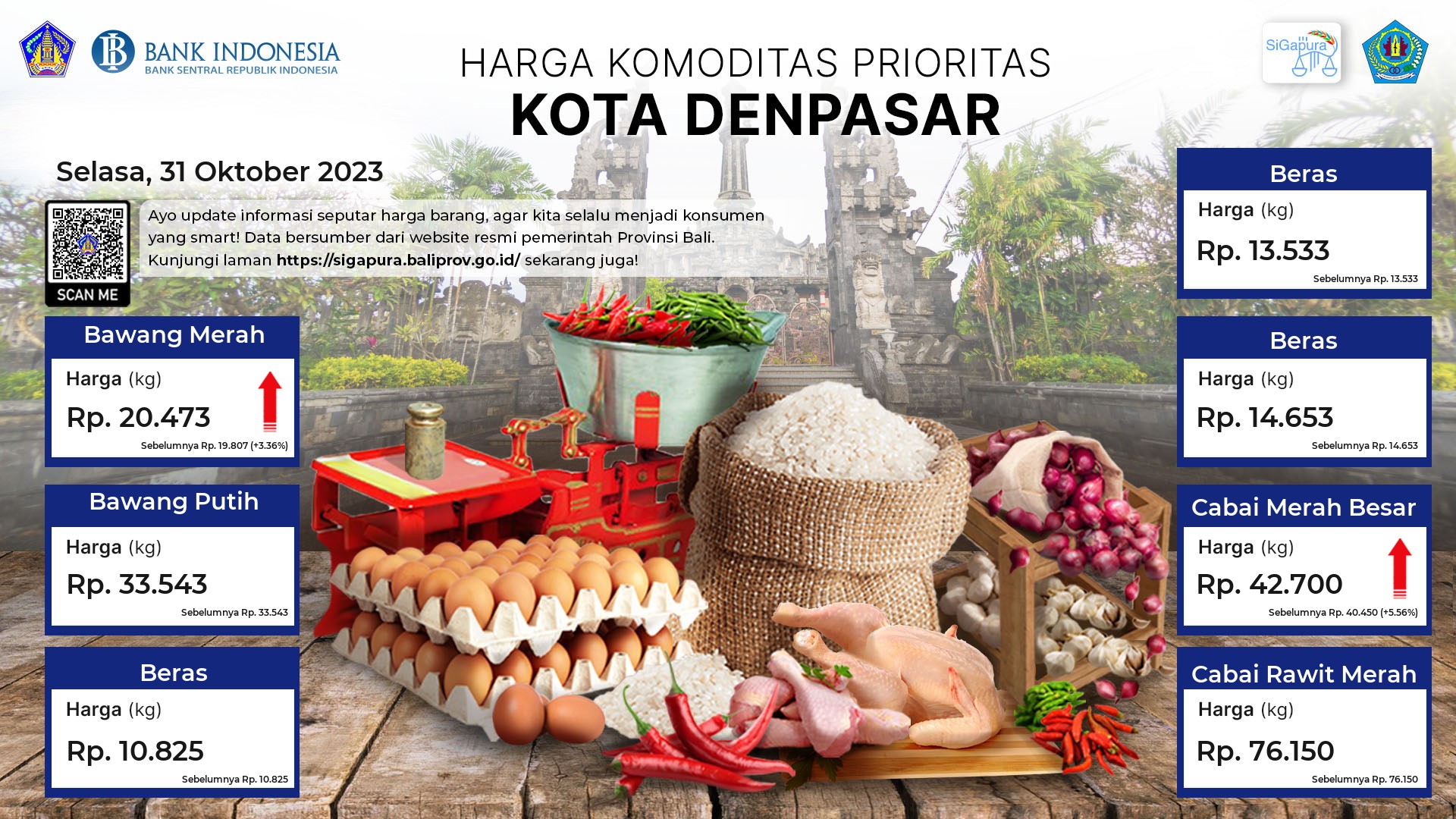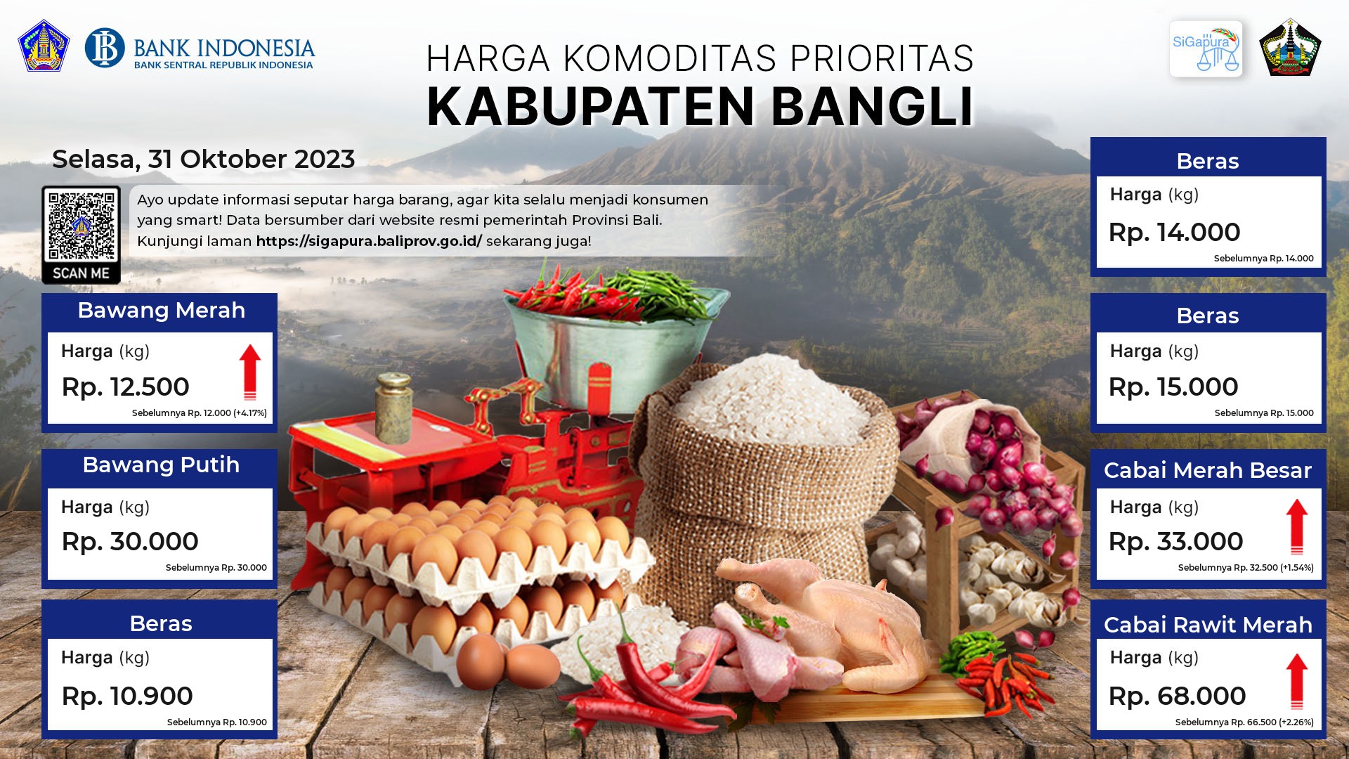 Berdasarkan pemantauan Harga Pangan Rata-Rata 7 (tujuh) Komoditas Prioritas di 60 Pasar seluruh Bali pada tanggal 31 Oktober 2023, diperoleh informasi Bawang Merah tetap ada diharga Rp. 16.367. Bawang Putih ada diharga Rp. 32.153, mengalami penurunan sebesar 2.23%. Beras tetap ada diharga Rp. 10.894. Beras ada diharga Rp. 13.862, mengalami kenaikan sebesar 0.25%. Beras ada diharga Rp. 15.000, mengalami kenaikan sebesar 0.13%. Cabai Merah Besar ada diharga Rp. 35.457, mengalami kenaikan sebesar 1.72%. Cabai Rawit Merah ada diharga Rp. 69.979, mengalami kenaikan sebesar 1.11%. Daging Ayam Ras ada diharga Rp. 38.866, mengalami penurunan sebesar 0.01%. Daging Sapi Has Luar ada diharga Rp. 119.797, mengalami kenaikan sebesar 0.14%.