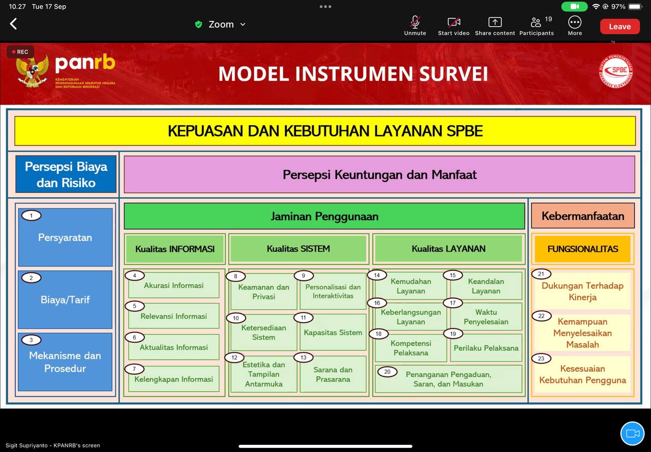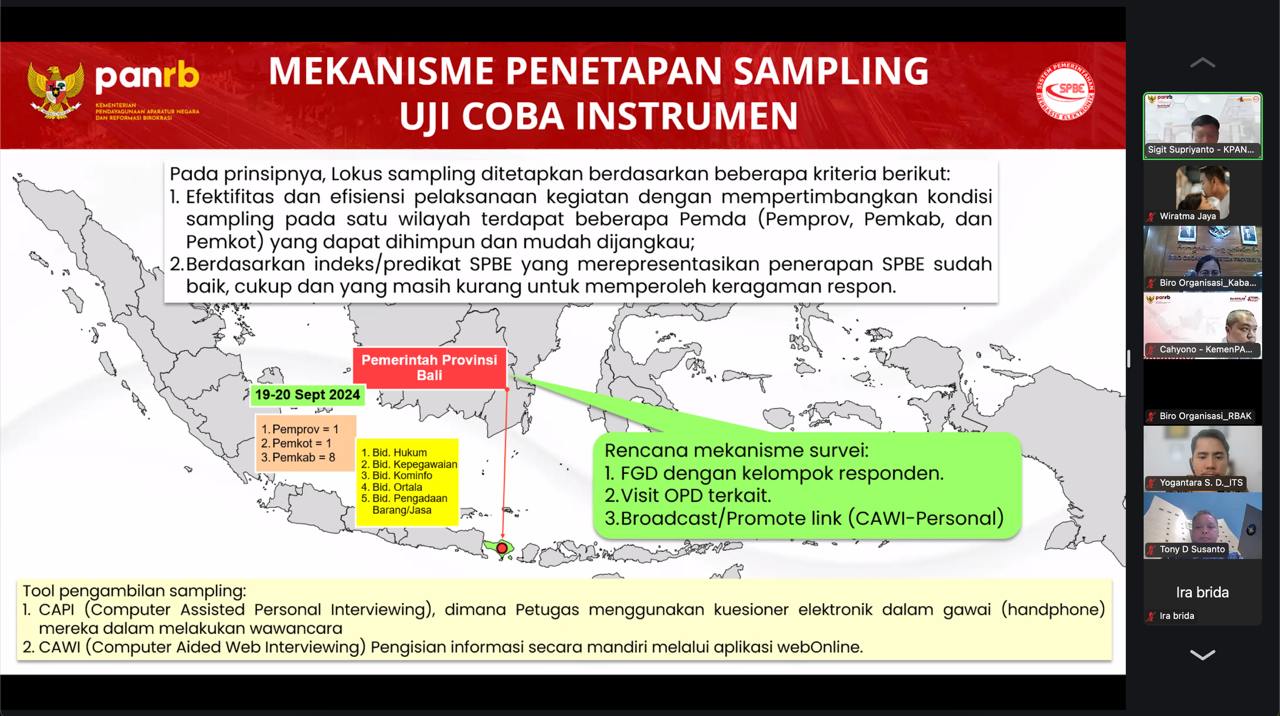 Pada tanggal 17 September 2024, diadakan diskusi khusus mengenai persiapan uji coba instrumen survei kebutuhan dan kepuasan pengguna SPBE (Sistem Pemerintah Berbasis Elektronik) pada Pemerintah Daerah di Wilayah Bali oleh Kementrian Pendayagunaan Aparatur Negara dan Reformasi Birokrasi Repbulik Indonesia dengan Pemerintah Provinsi Bali, pertemuan ini dilaksanakan melalui Zoom Meeting yang dihadiri oleh OPD terkait yaitu Biro Organisasi, Dinas Komunikasi, Informatika dan Statistik, Badan Riset dan Inovasi Daerah Pemerintah Provinsi Bali.