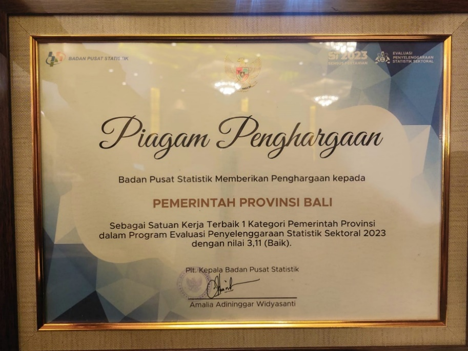 Pemerintah Provinsi Bali menerima Anugerah Anindhita Wistara Data dari Badan Pusat Statistik (BPS) sebagai Satuan Kerja Terbaik I Kategori Pemerintah Provinsi dalam Program Evaluasi Penyelenggaraan Statistik Sektoral (EPSS) dengan nilai Indeks Pembangunan Statistik (IPS) 3,11 (Kategori Baik).